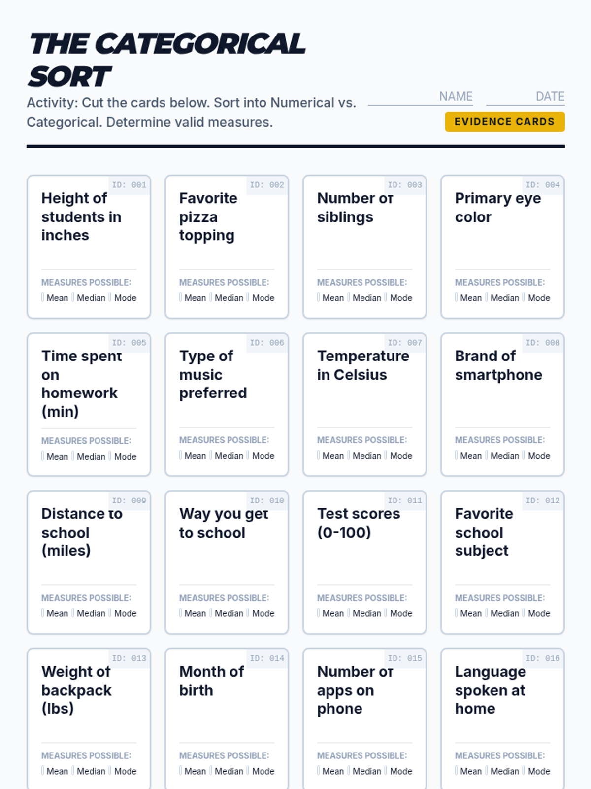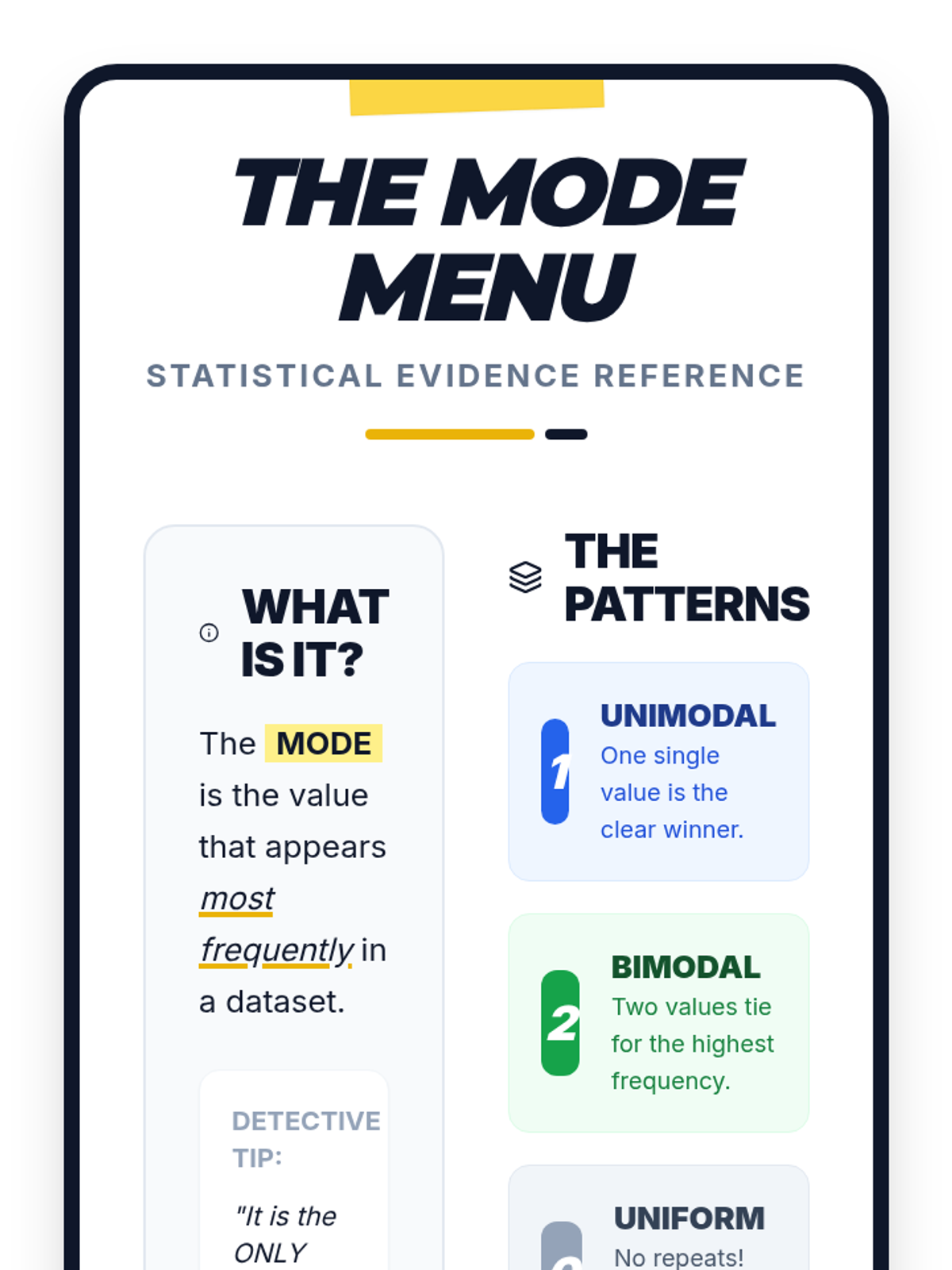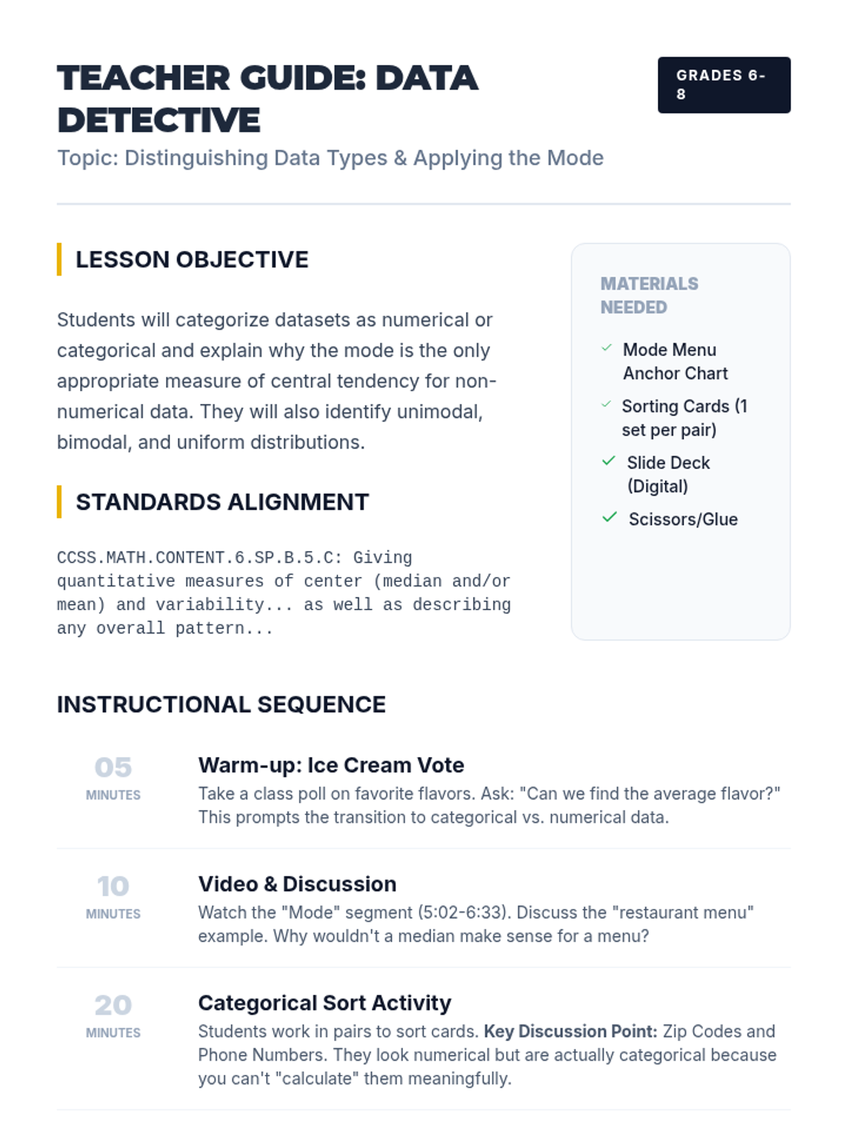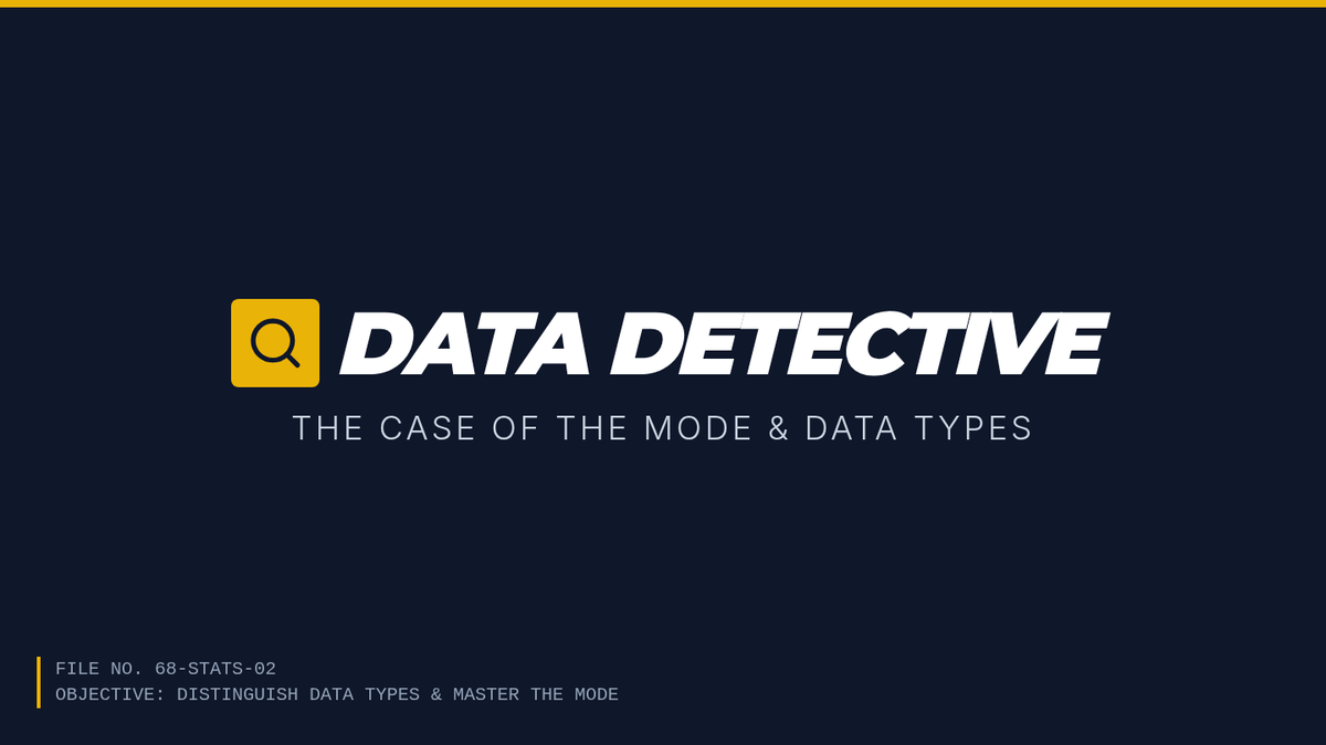 A middle school statistics lesson focusing on distinguishing between numerical and categorical data, identifying the mode, and understanding its unique application to non-numerical datasets.