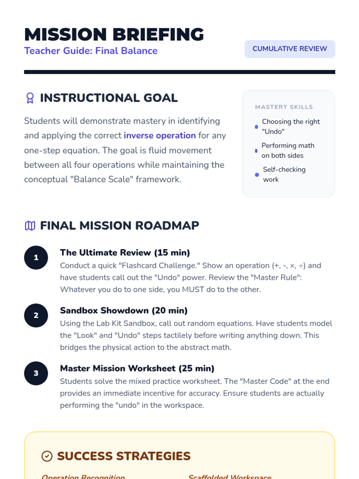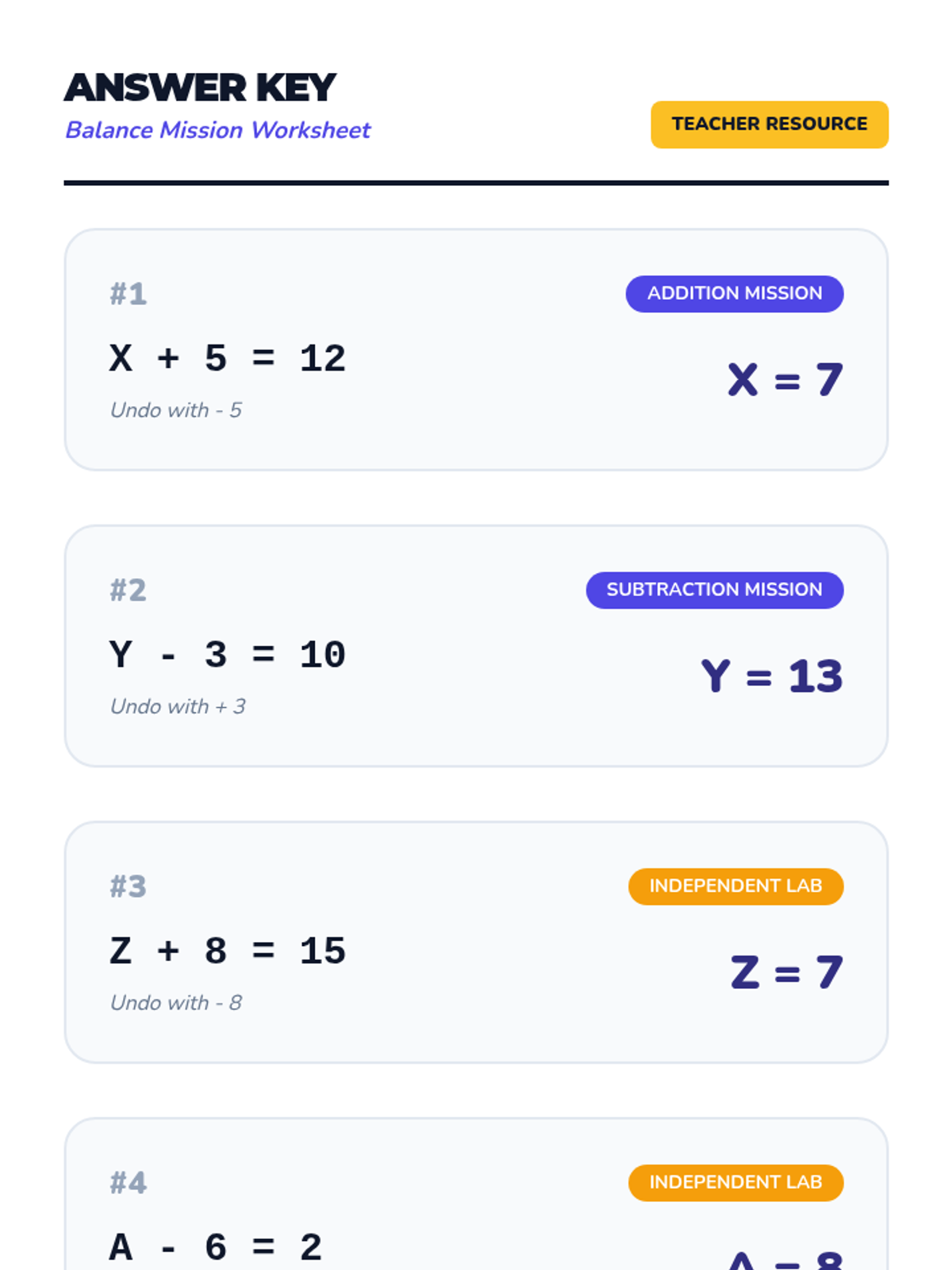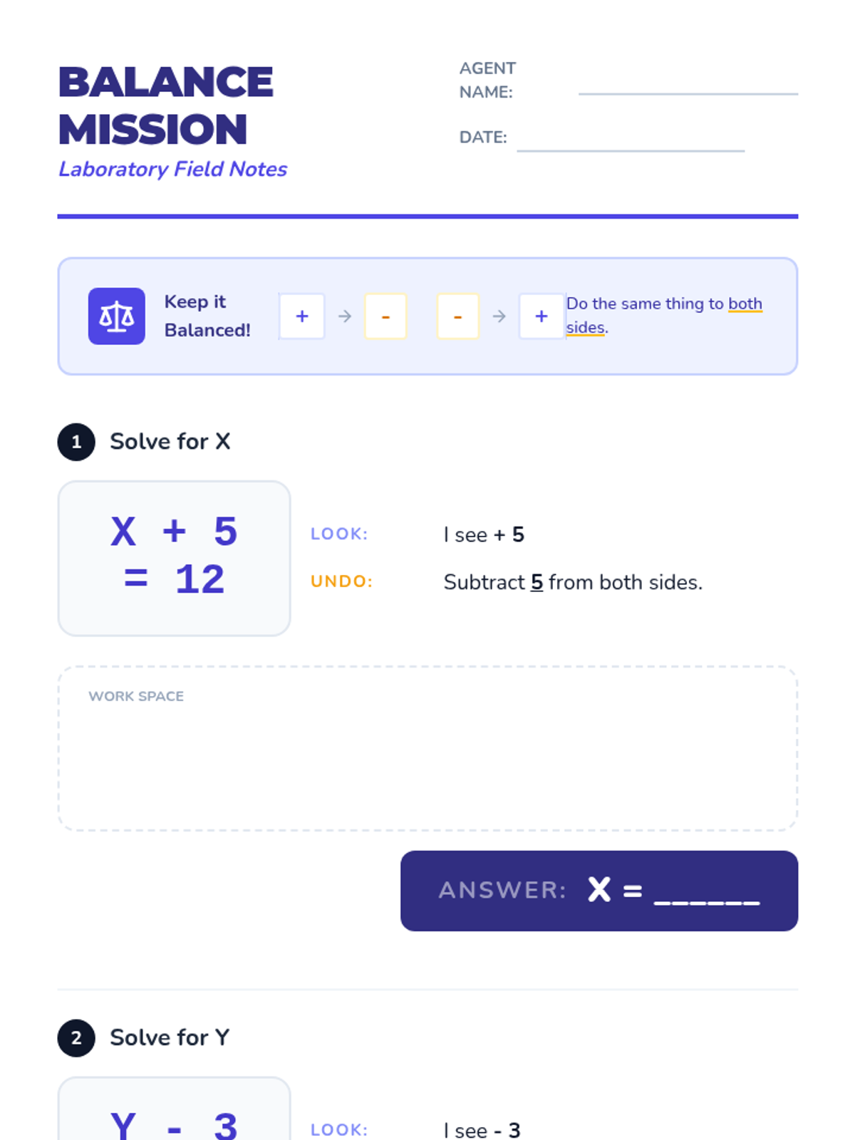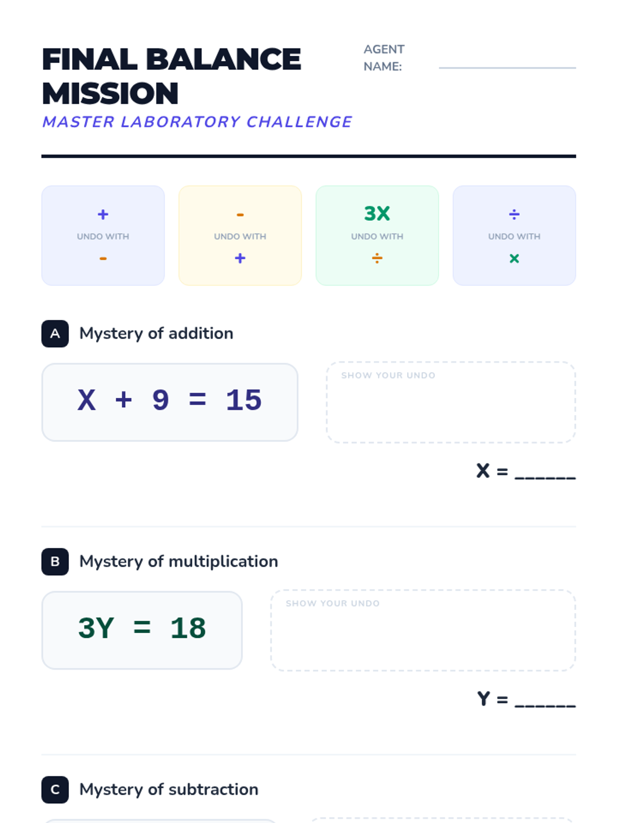 A foundational introduction to basic algebra using the balance scale analogy, specifically designed for students working at a 3rd-grade level. Students will learn about variables and the concept of inverse operations to 'undo' addition and subtraction.