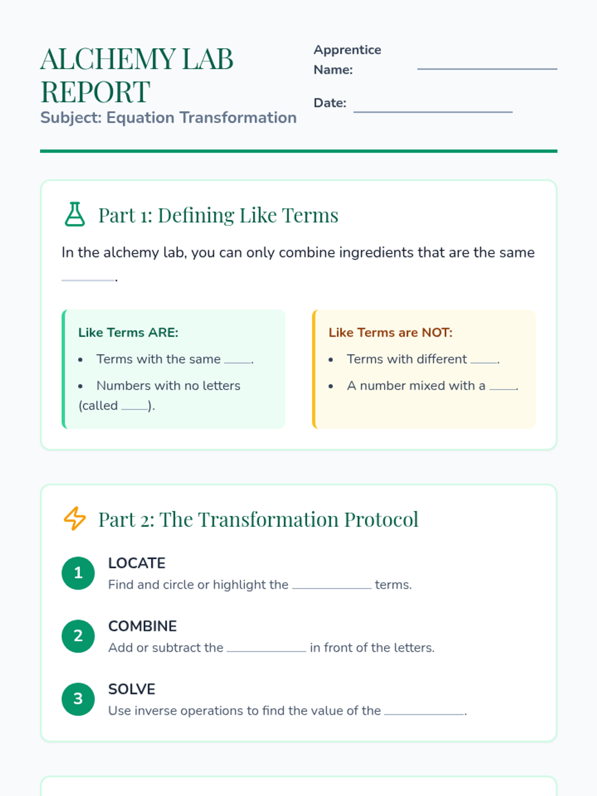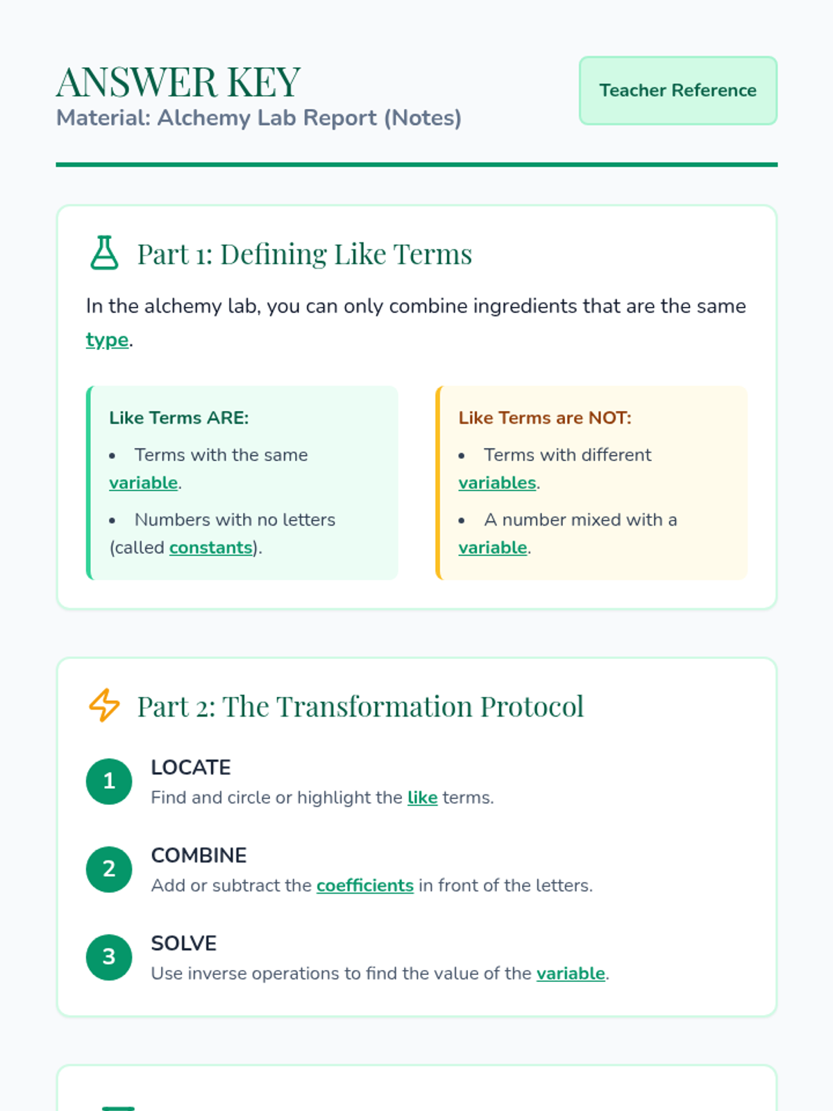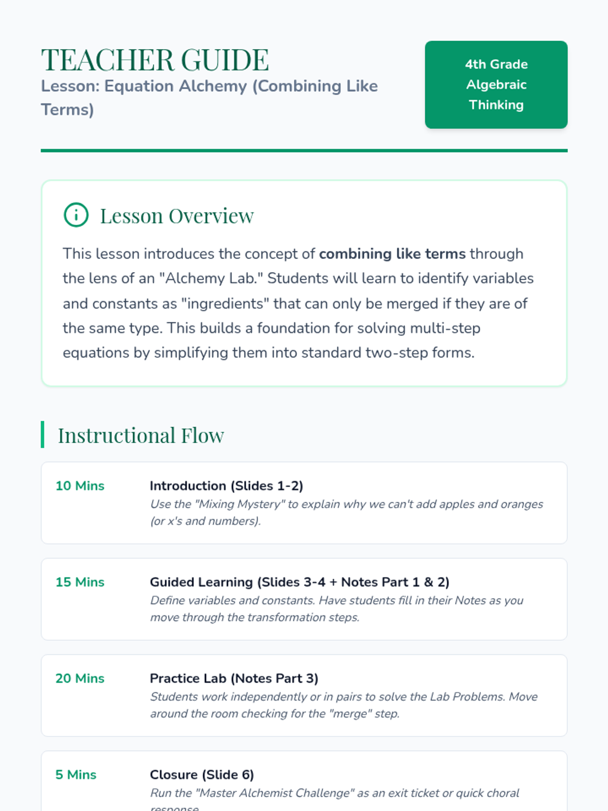 An introductory lesson on identifying and combining like terms to solve multi-step equations, designed for upper elementary students using visual models and guided practice.