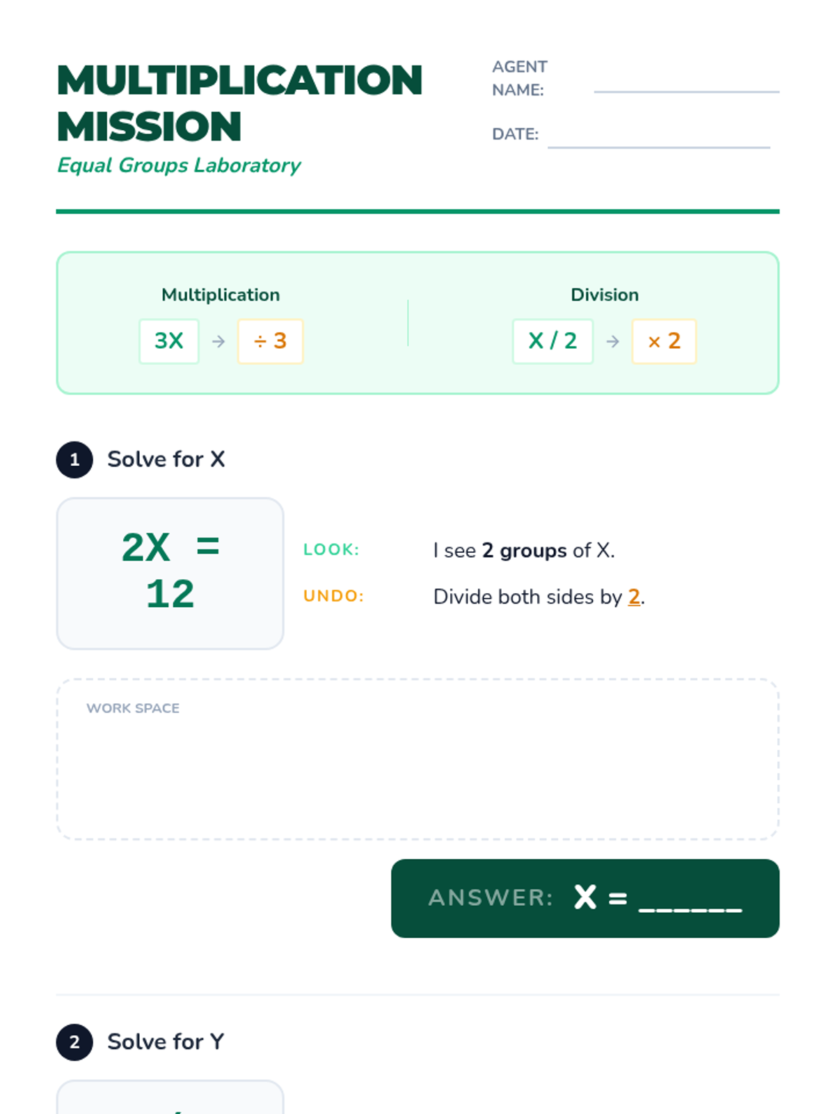 Expanding algebraic thinking to multiplication and division. Students will learn how to 'undo' multiplication by splitting into equal groups (division) and 'undo' division through multiplication, maintaining the balance of the scale.