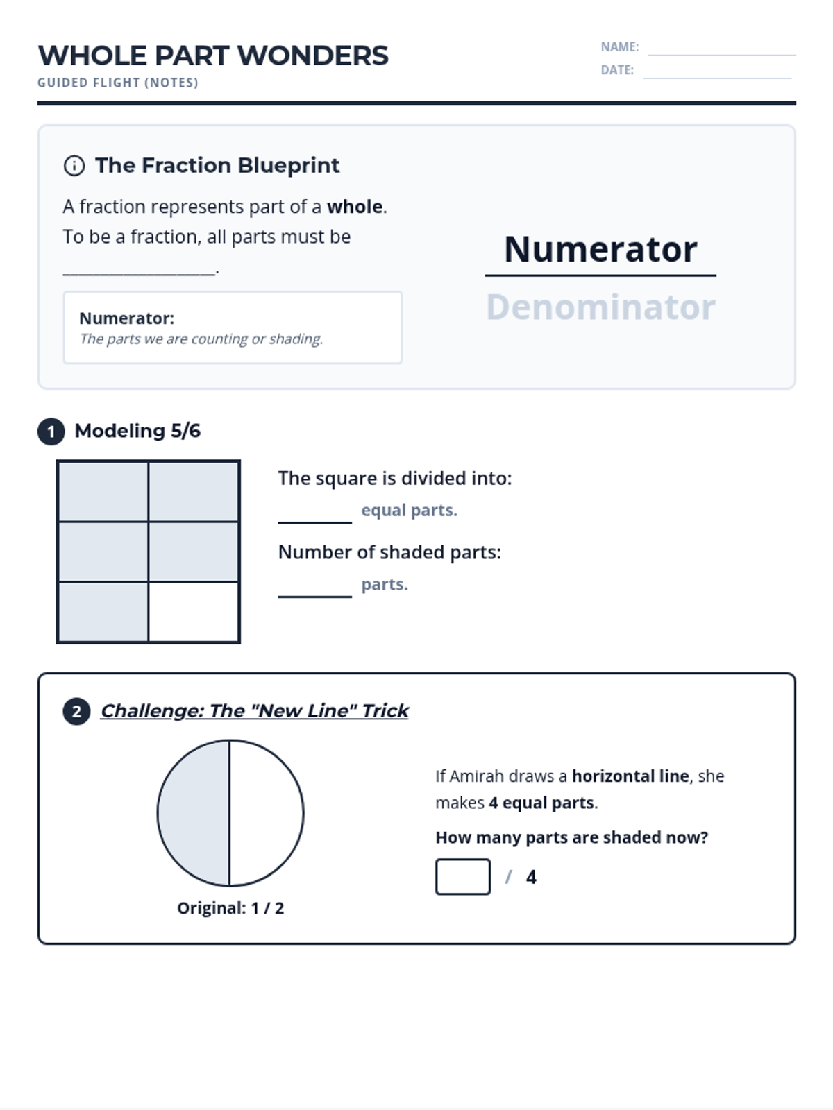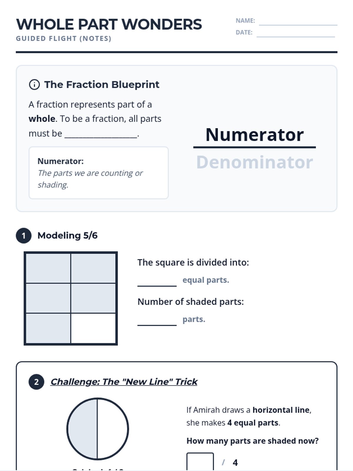 Focuses on identifying parts of a whole, understanding numerators and denominators, and modeling fractions by dividing shapes into equal parts.