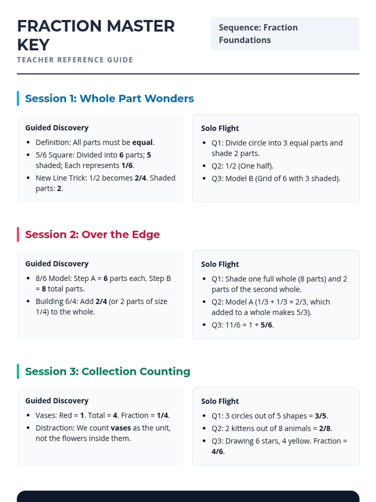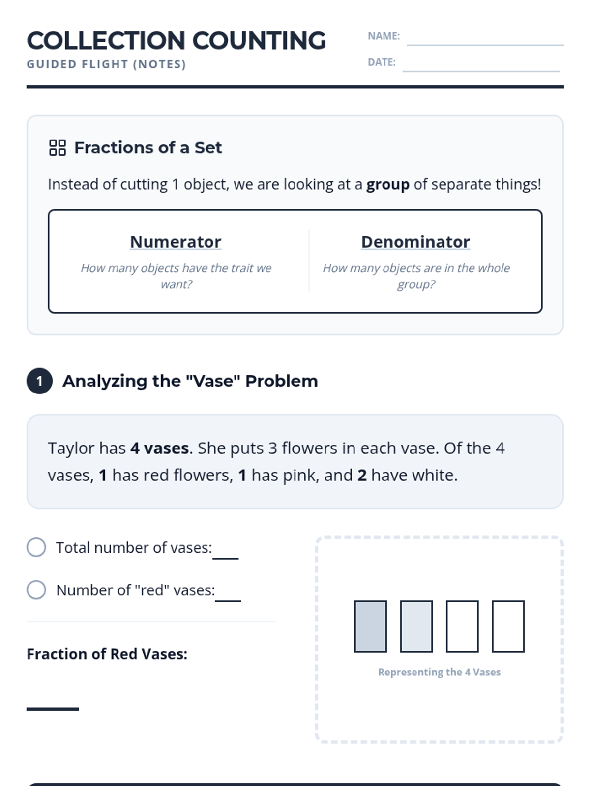 Teaches students to identify fractions within a group of discrete objects (sets), rather than a single continuous whole.