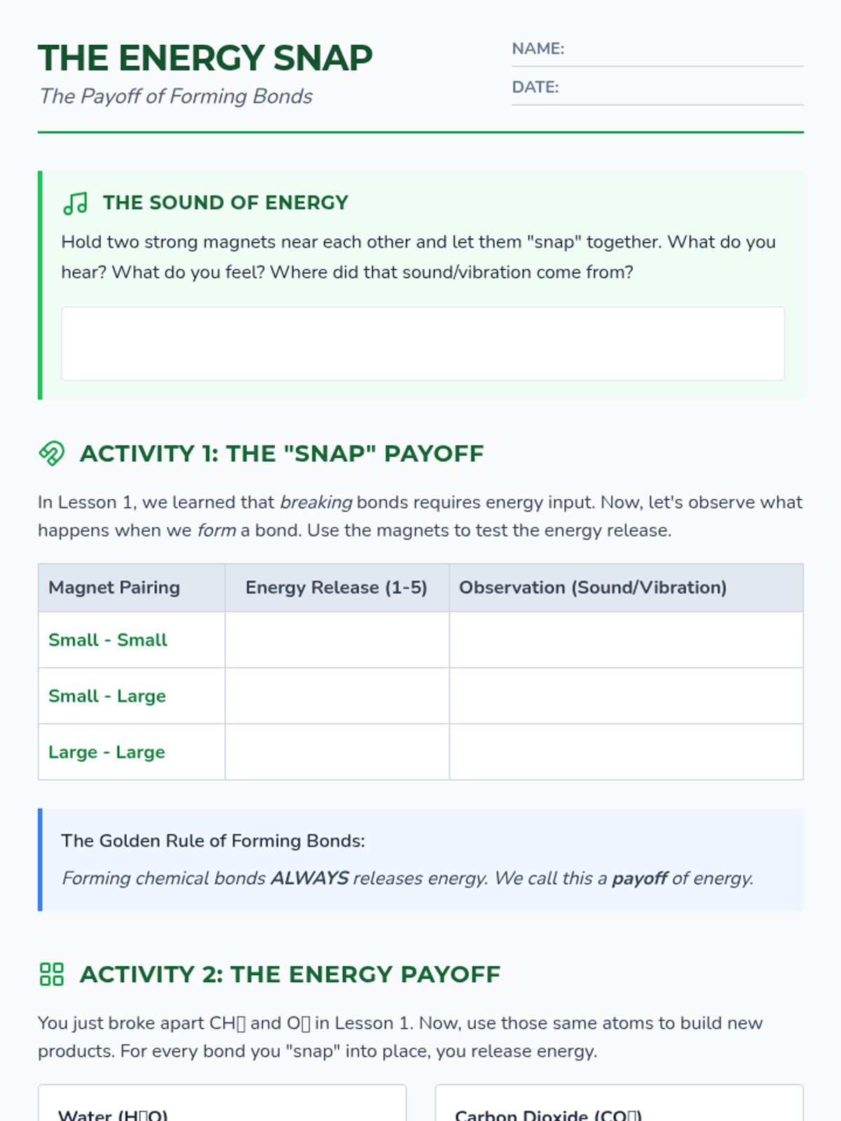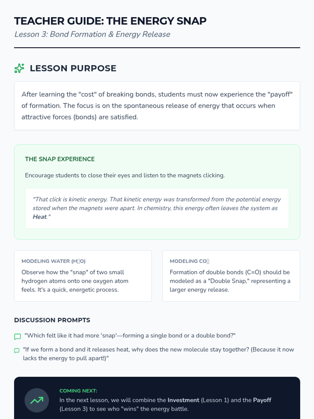 Students use magnetic models to feel the 'snap' of bond formation, contrasting the energy release of formation with the energy input of breaking.