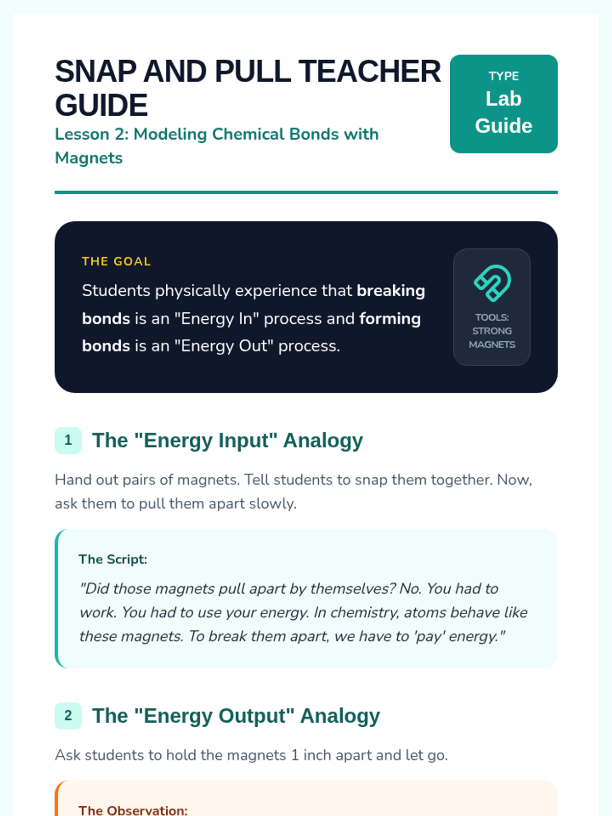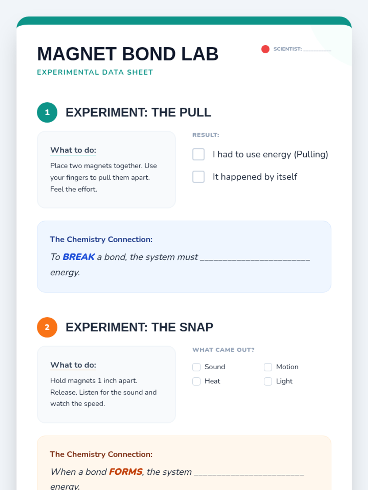 Students use magnets as an analogy for chemical bonds to feel the energy required to break bonds and the energy released when forming them.