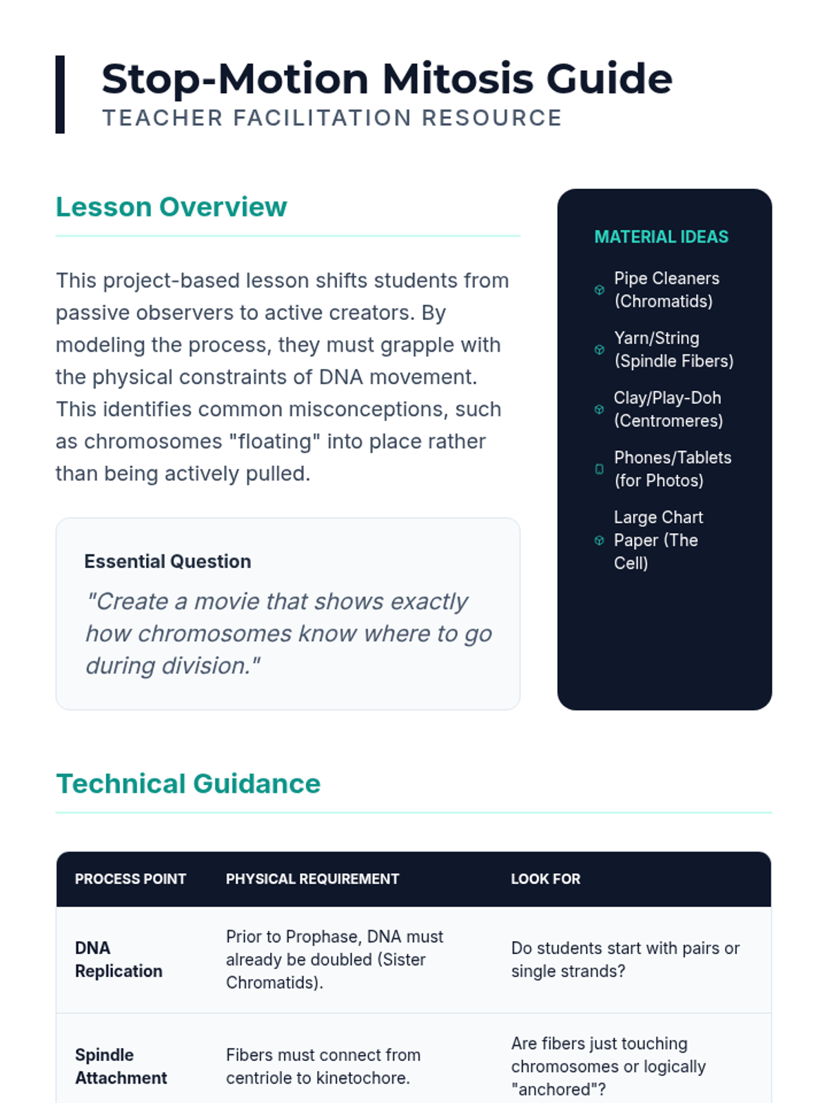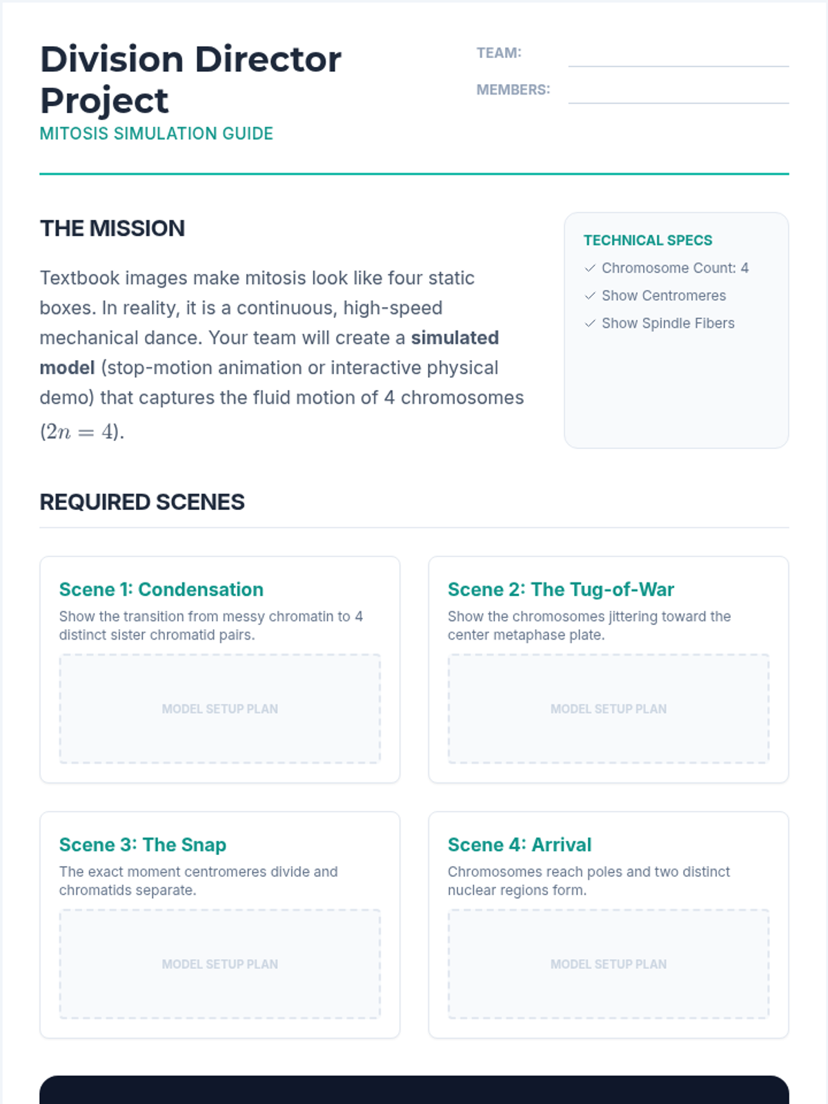 Students model the dynamic movement of chromosomes during mitosis, focusing on alignment at the metaphase plate and the separation of sister chromatids. They create a visual representation showing the continuous flow of the process.