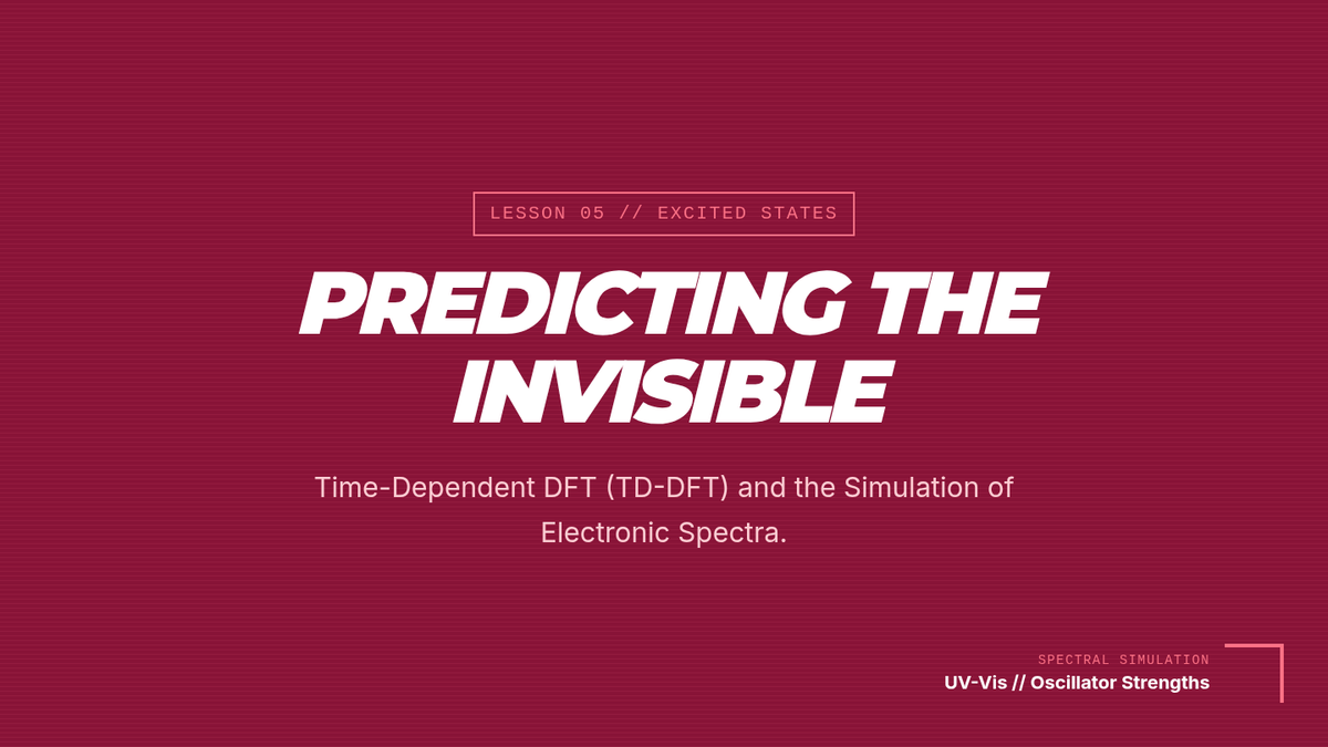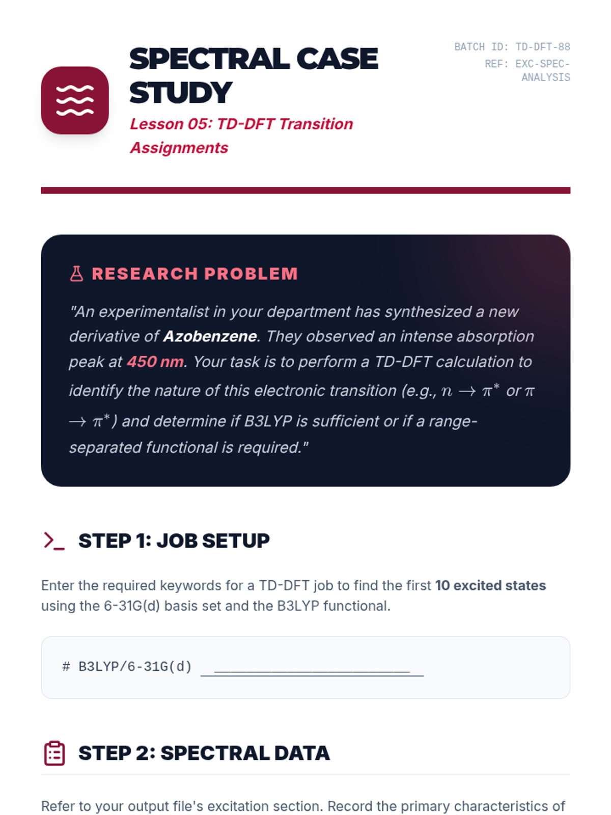The final lesson covers Time-Dependent DFT (TD-DFT) to simulate UV-Vis absorption and electronic transitions. Students compare computed spectra with experimental data to validate bonding models.