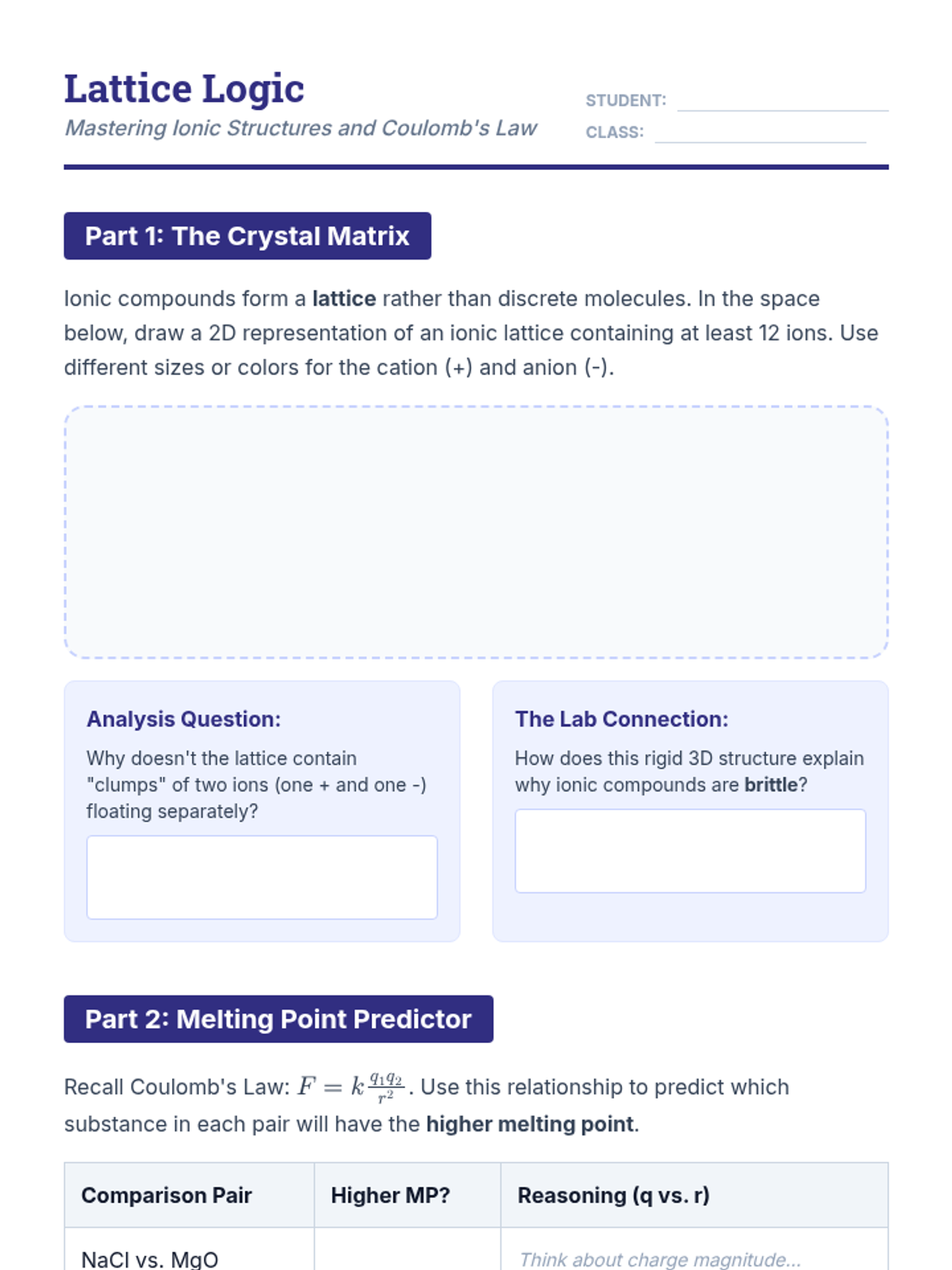 Focusing on the high-melting-point, conductive-when-dissolved cluster, students build models of ionic crystal lattices and use Coulomb's Law to explain their observations.