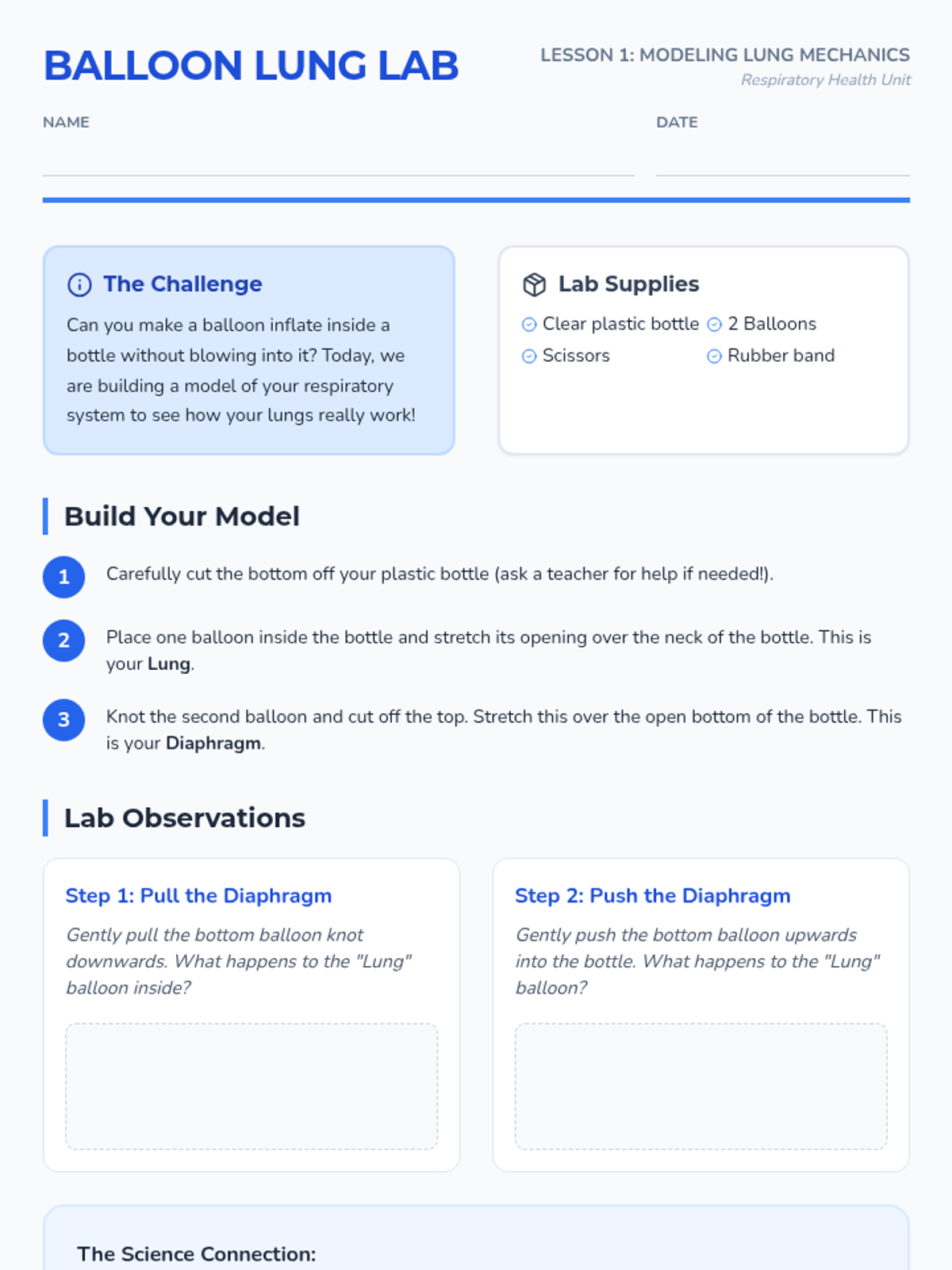 Students build a simple lung model using balloons and plastic bottles to visualize inhalation and exhalation, establishing a baseline for healthy respiratory function.