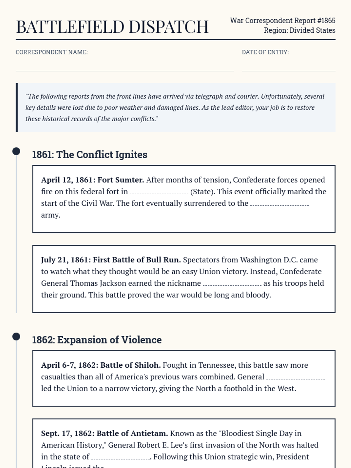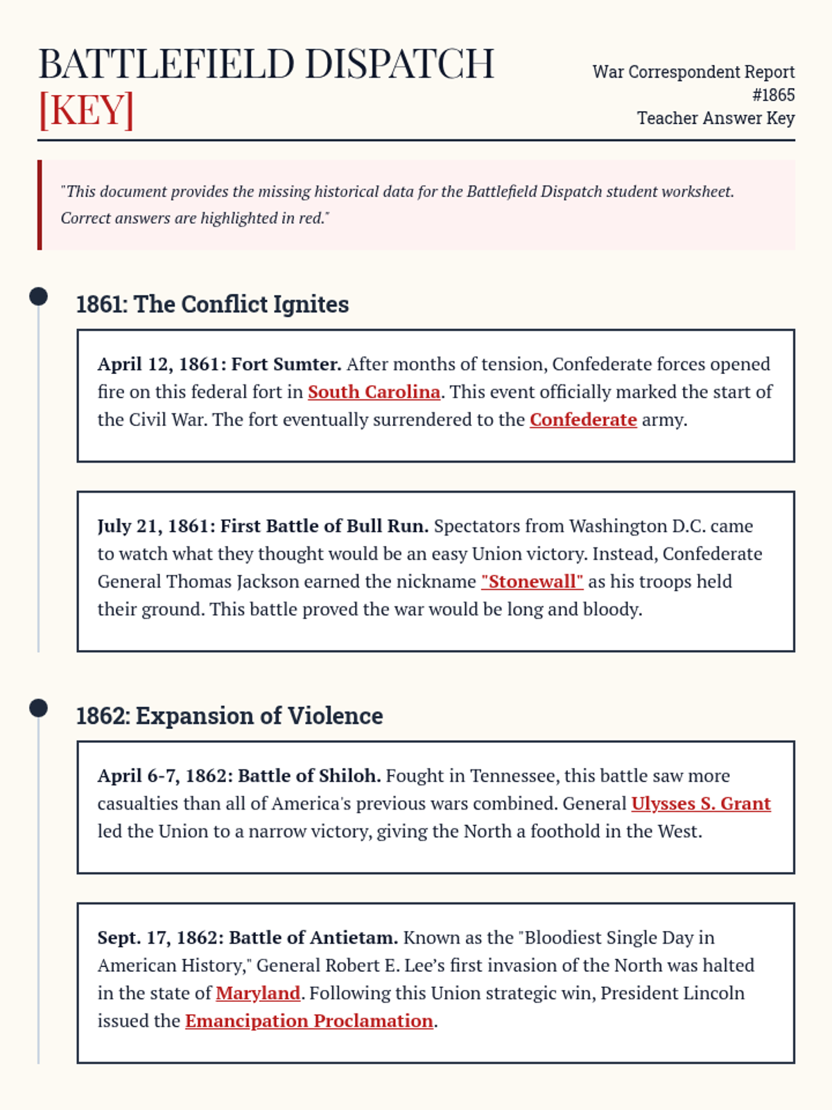 A lesson covering the major turning points and battles of the American Civil War (1861-1865), including a student-facing dispatch report activity and teacher-led instruction.