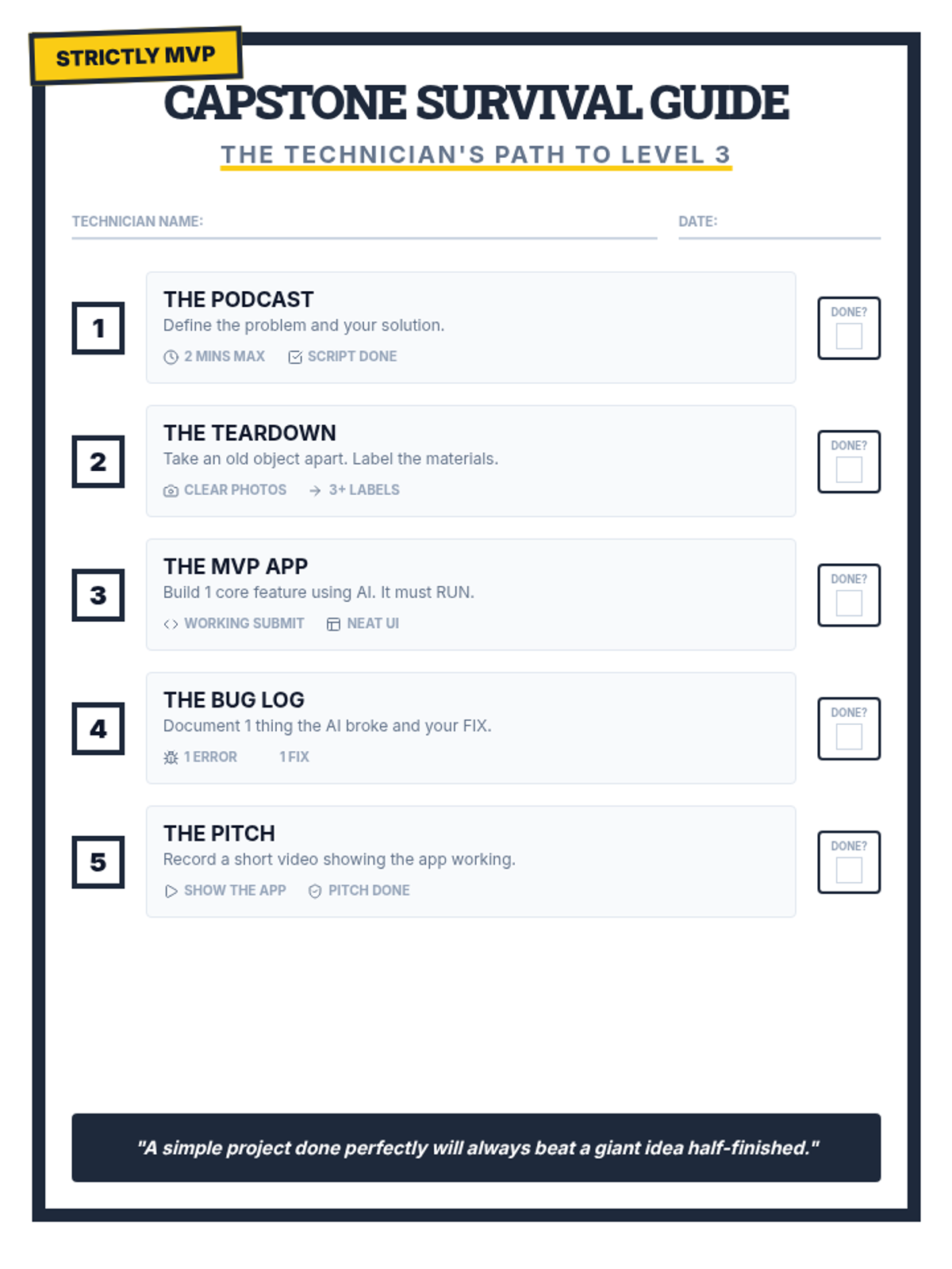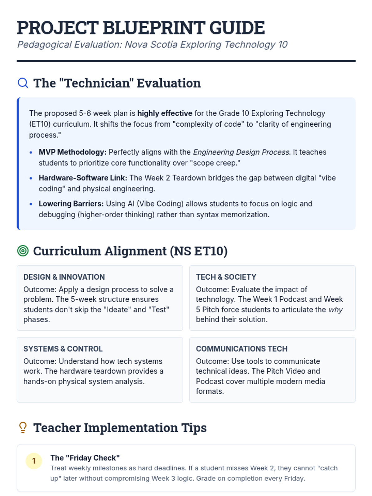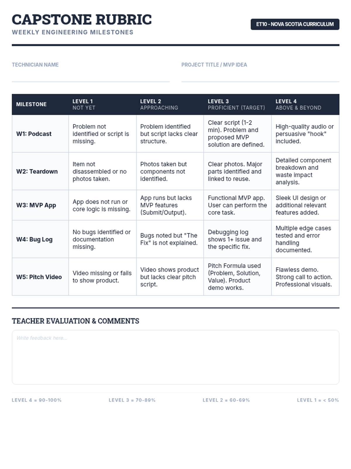 Teacher guidance and student tracking tools for the 5-week Tech Capstone project, including evaluation rubrics and progress monitoring.