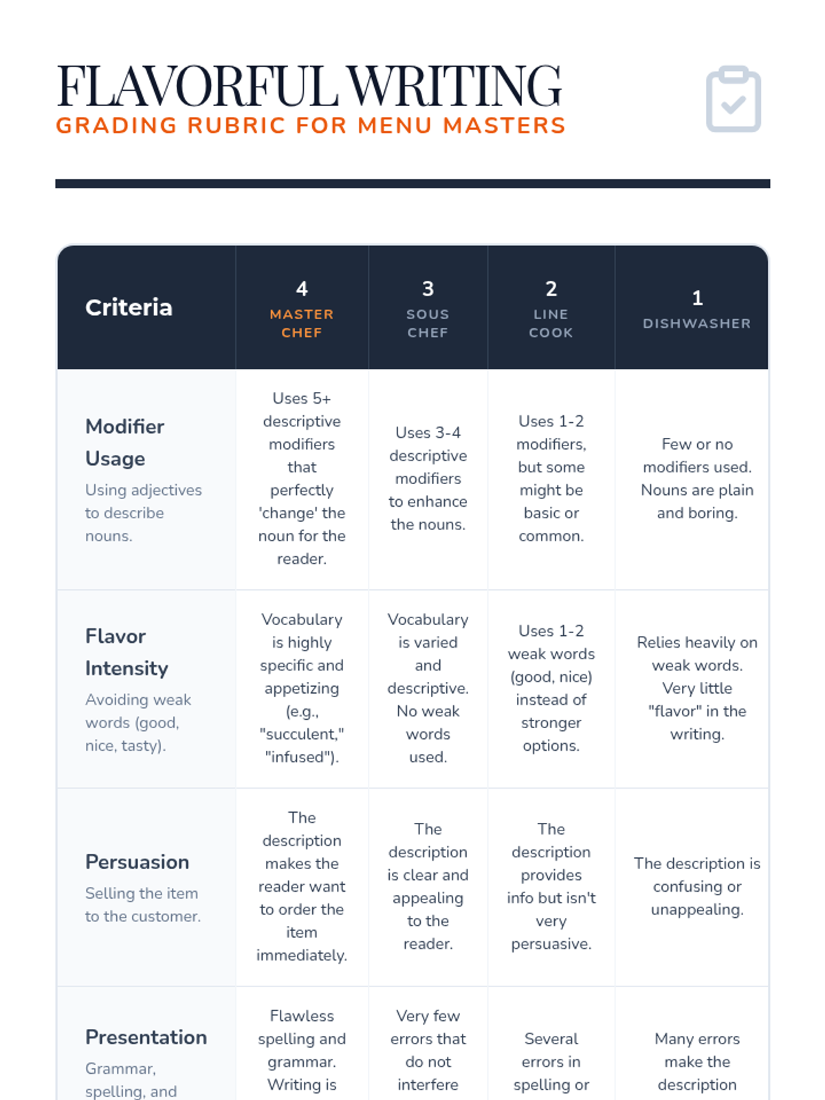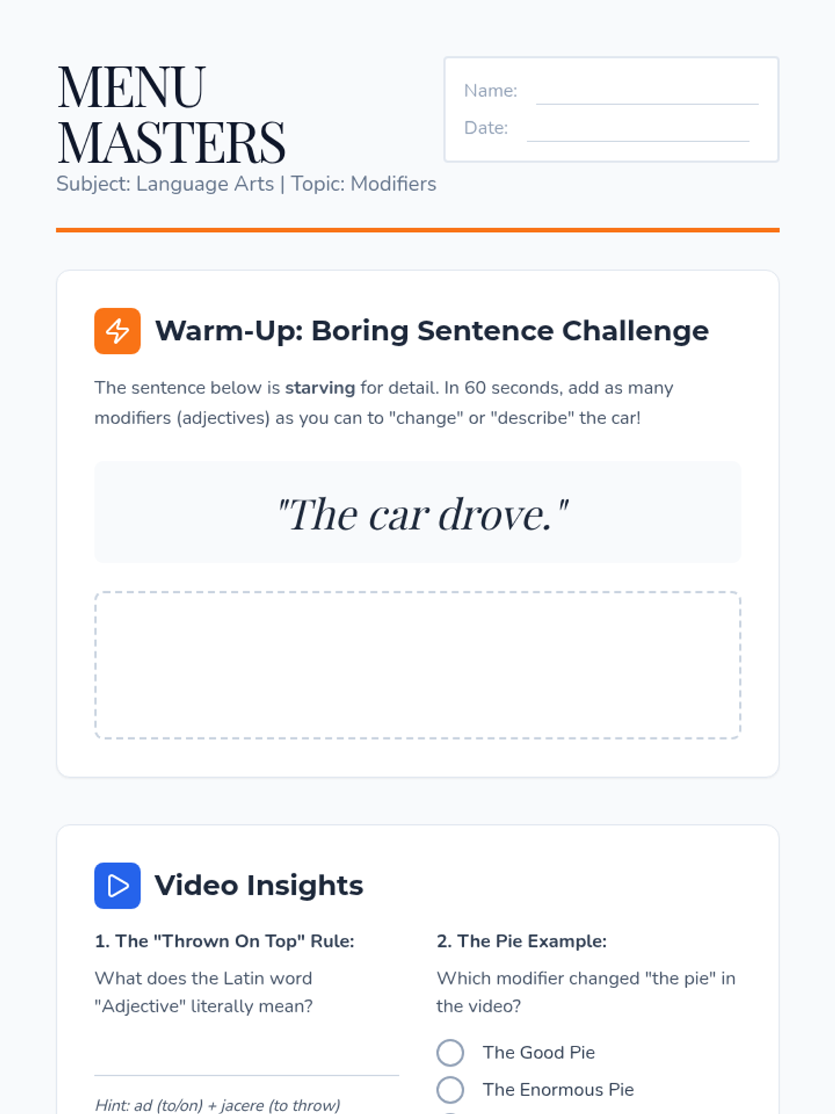 Students will learn how adjectives act as modifiers to 'change' nouns and enhance their writing through a restaurant-themed descriptive writing activity.