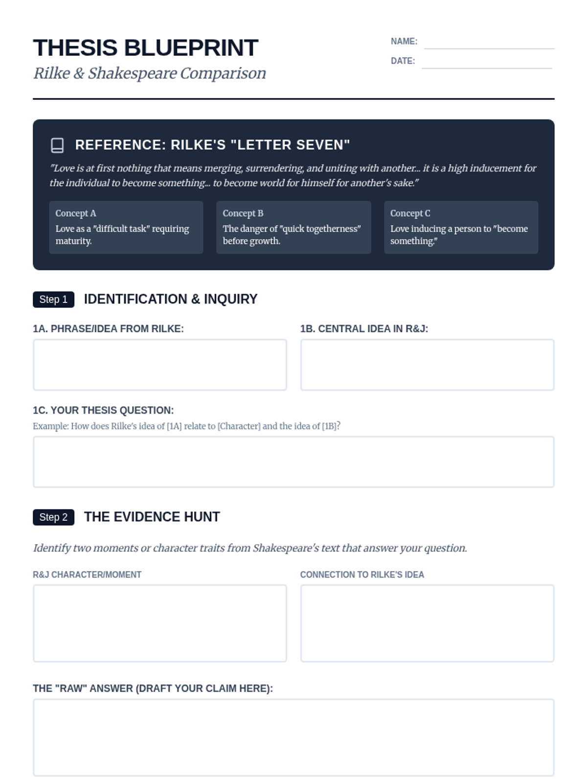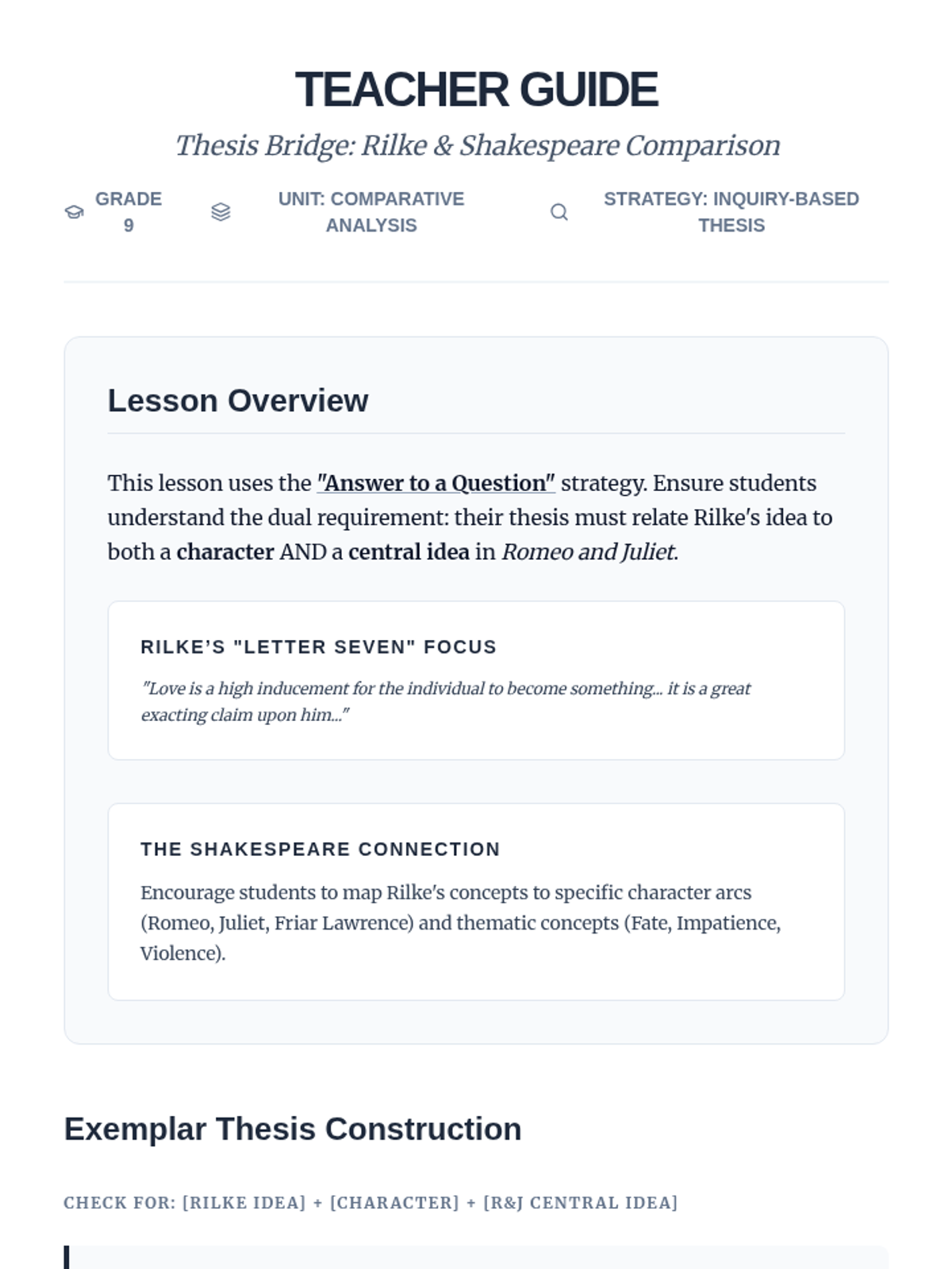 A focused lesson on crafting a thesis statement for a comparative essay between Rilke's Letters to a Young Poet and Shakespeare's Romeo and Juliet, specifically using the 'Answer to a Question' strategy.