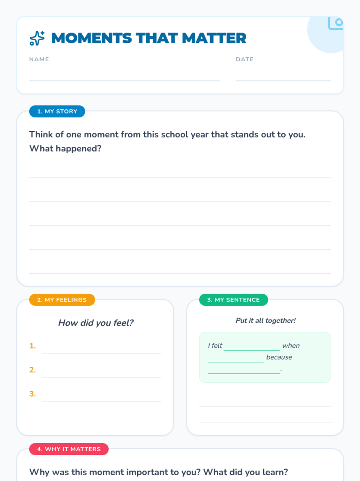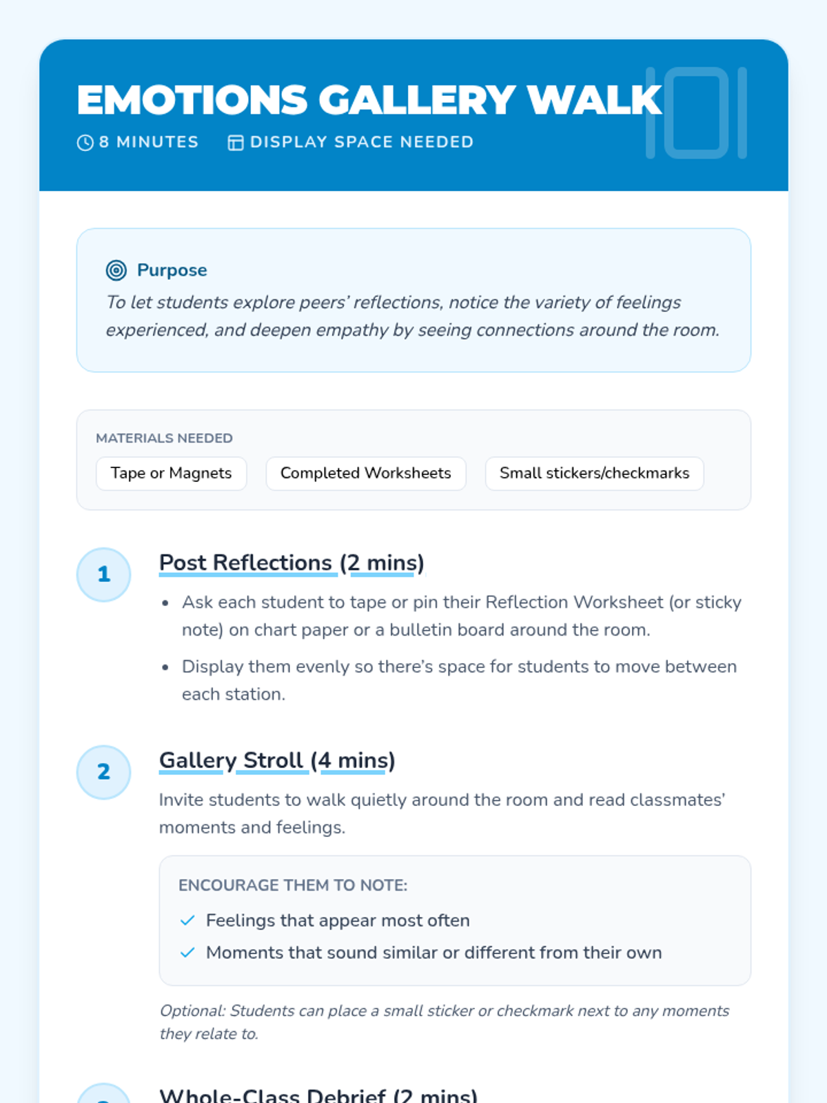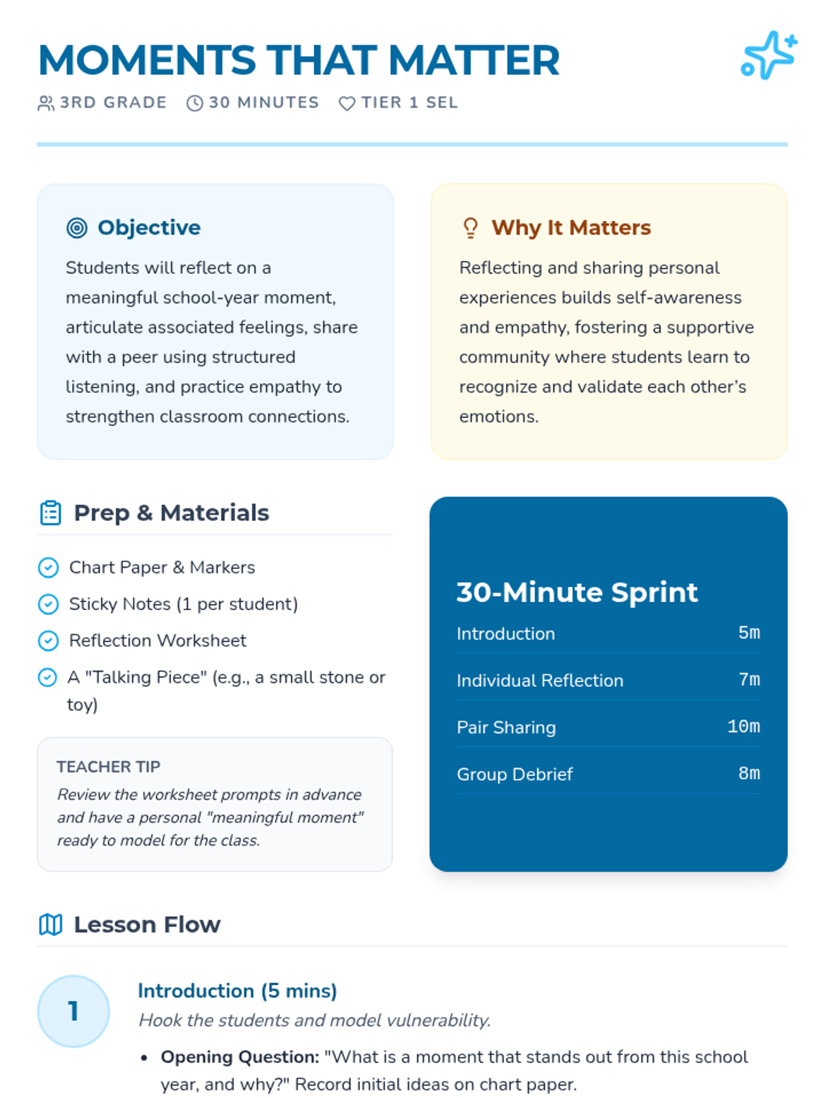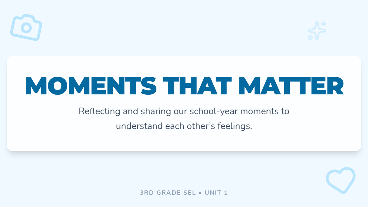 A 30-minute Tier 1 SEL lesson for 3rd graders focused on self-awareness and empathy through reflecting on meaningful school moments. Students share experiences, identify feelings, and build classroom connection.
