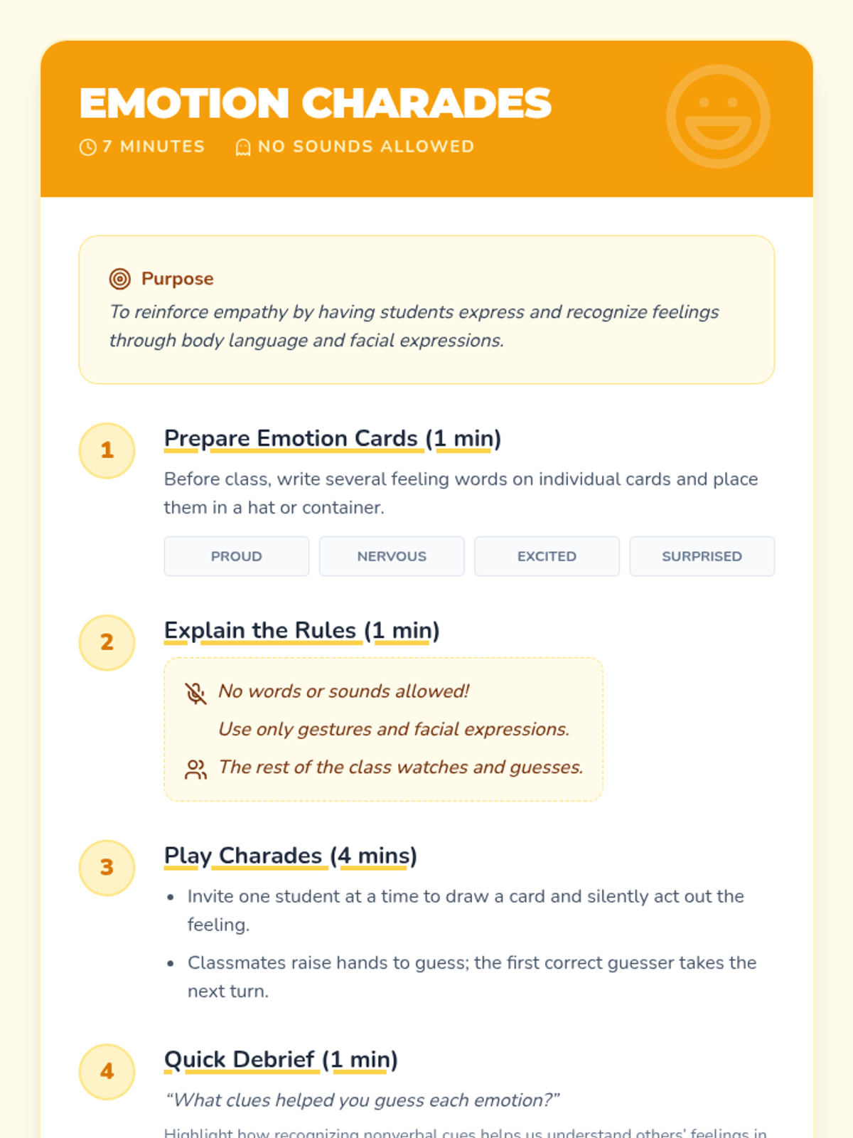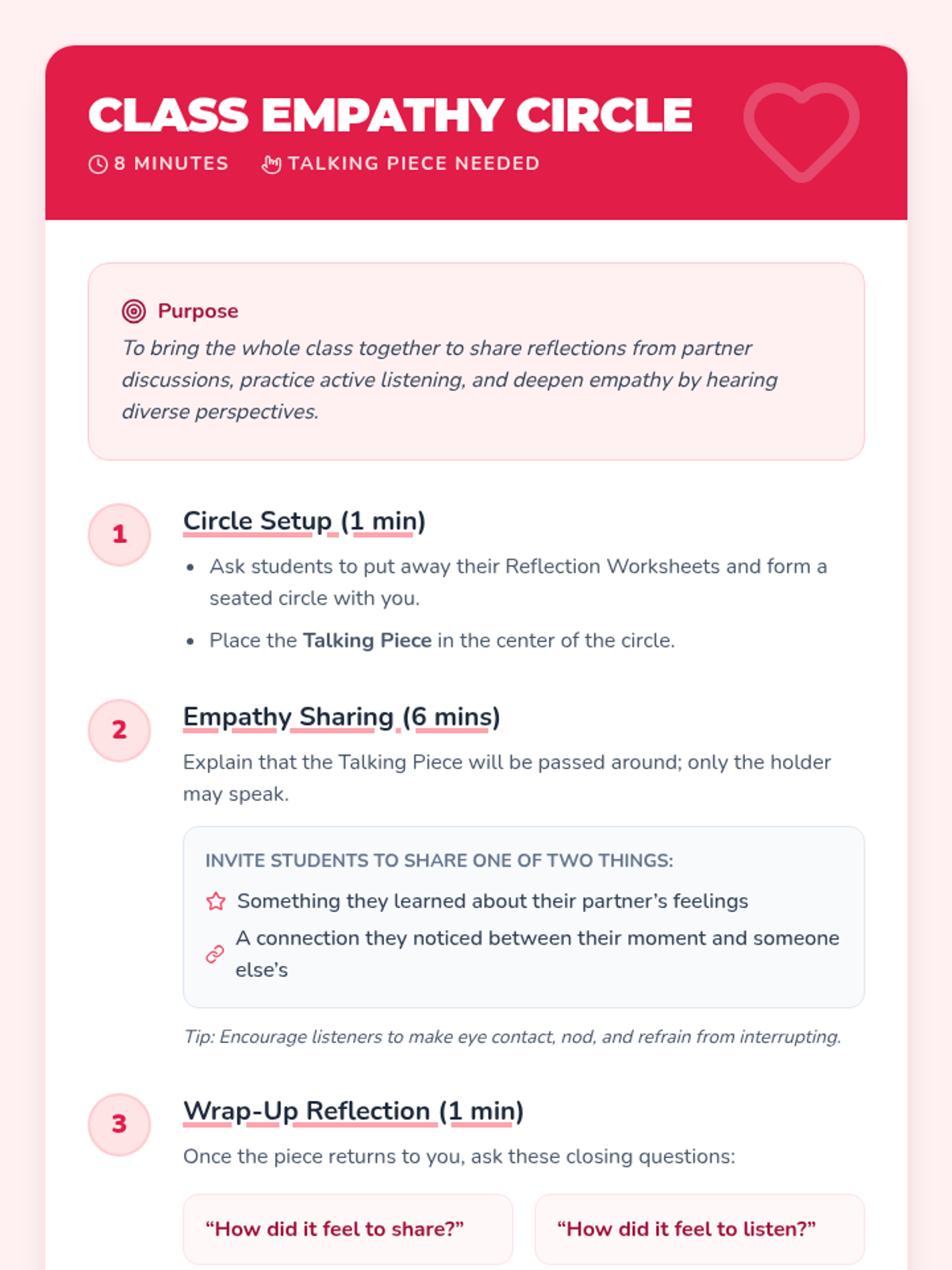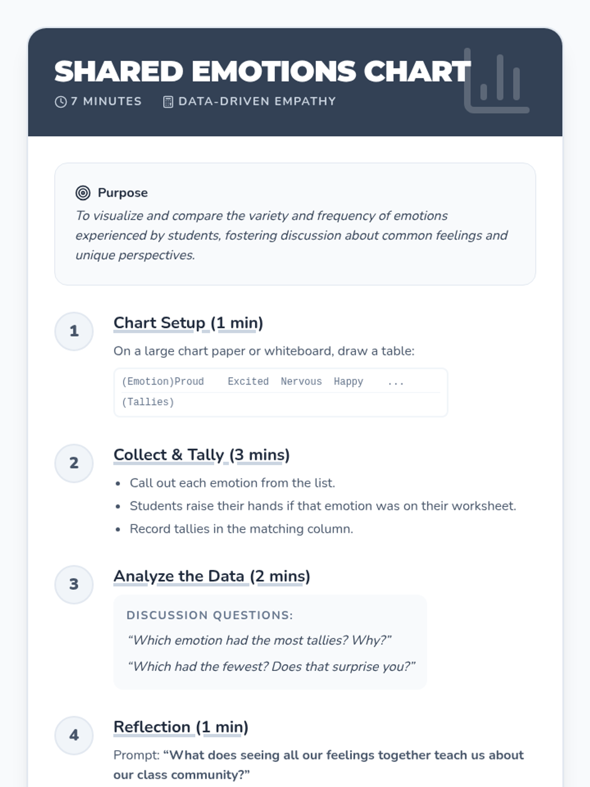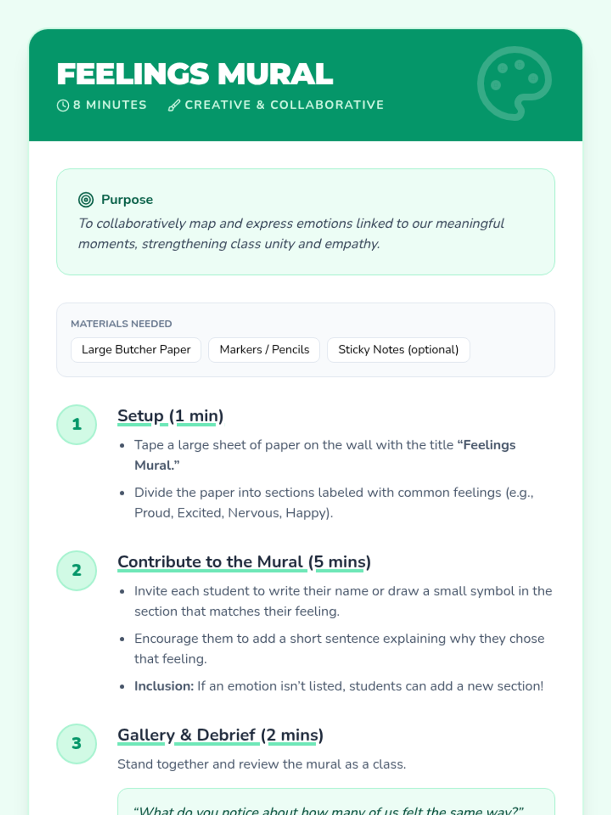 A 30-minute Tier 1 SEL lesson for 3rd graders focused on self-awareness and empathy through reflecting on meaningful school moments. Students share experiences, identify feelings, and build classroom connection.