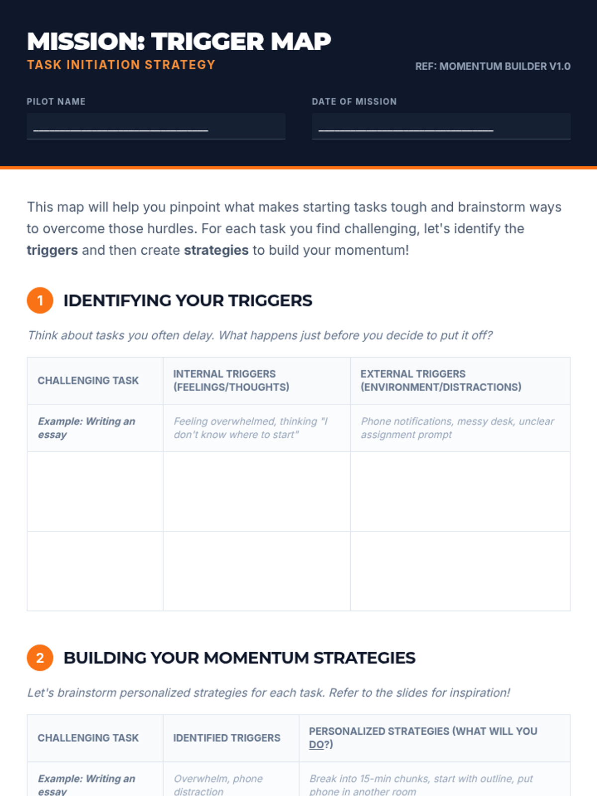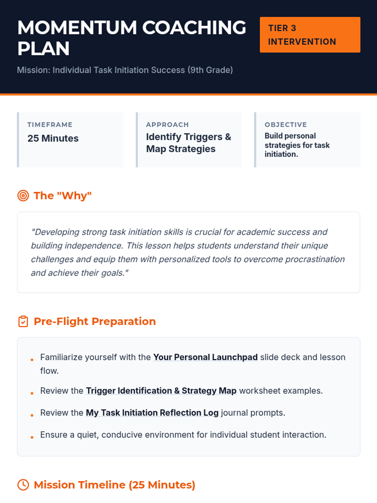 A 25-minute individual coaching session designed to help 9th-grade students identify task avoidance triggers and build a personalized 'launchpad' of strategies for task initiation.