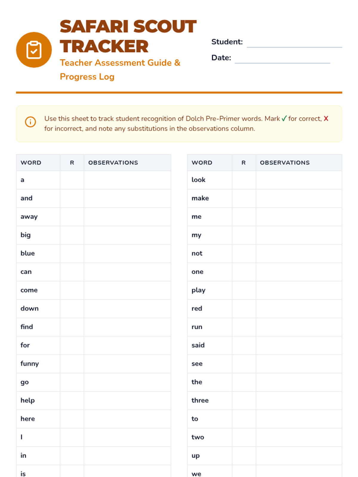 A beginner's journey through the Dolch Pre-Primer sight words, featuring interactive review slides and a 'Safari' themed assessment to track word recognition.