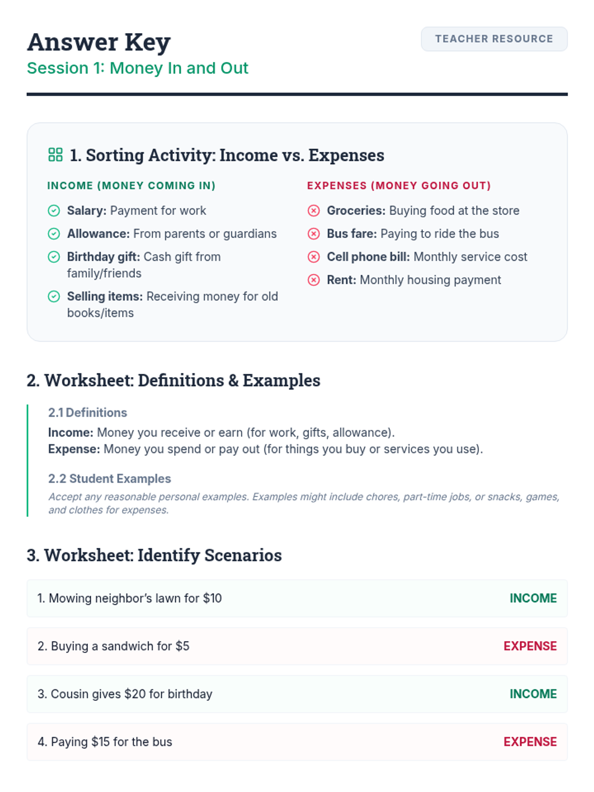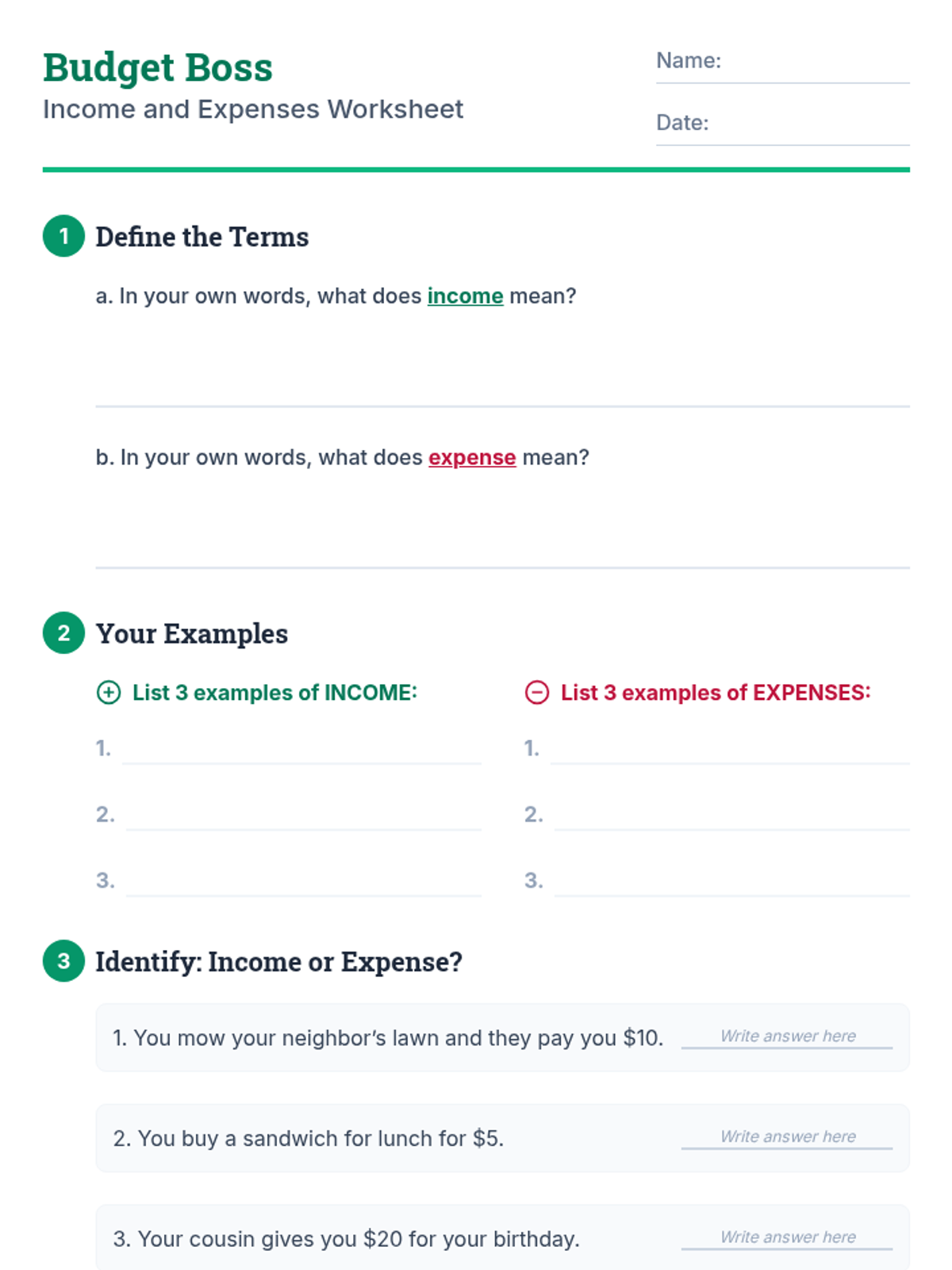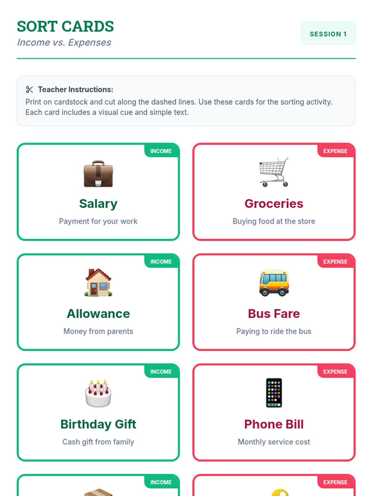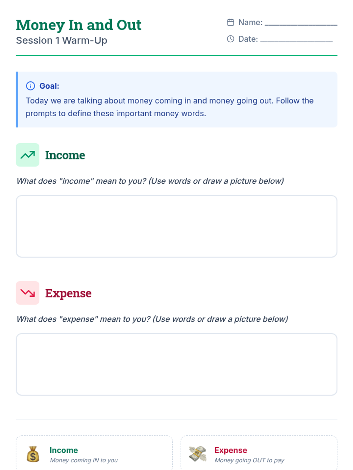 Students define income and expenses and practice categorizing real-life money scenarios.