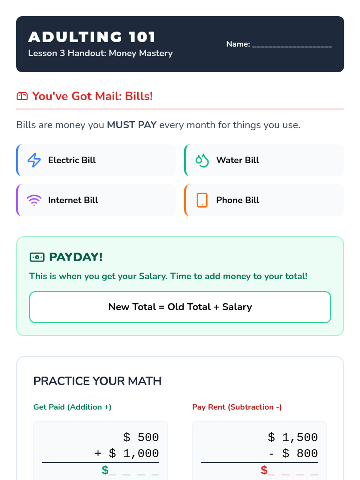 A focus on managing a monthly ledger, understanding 'Payday' squares, and the basics of paying bills on time.