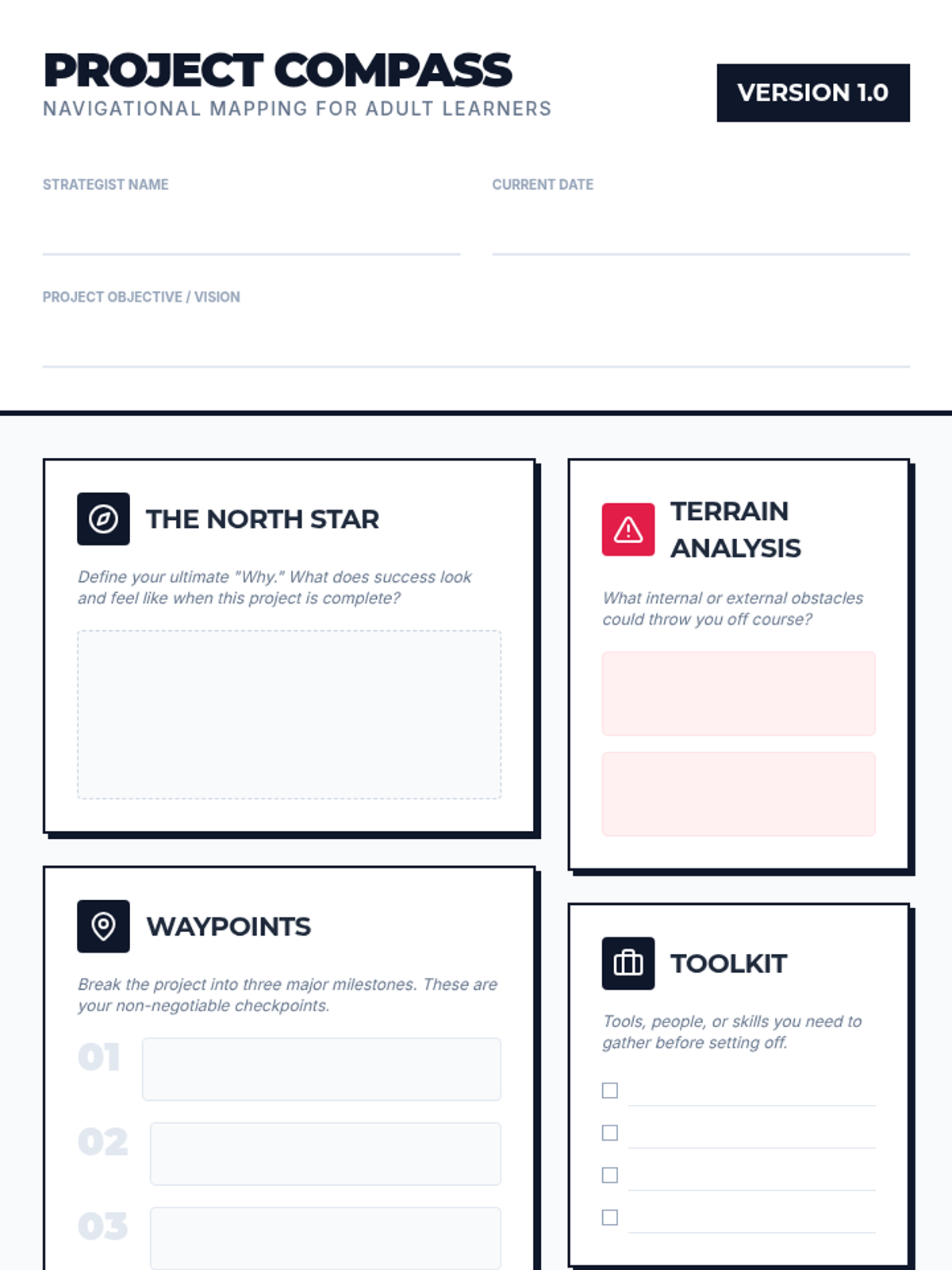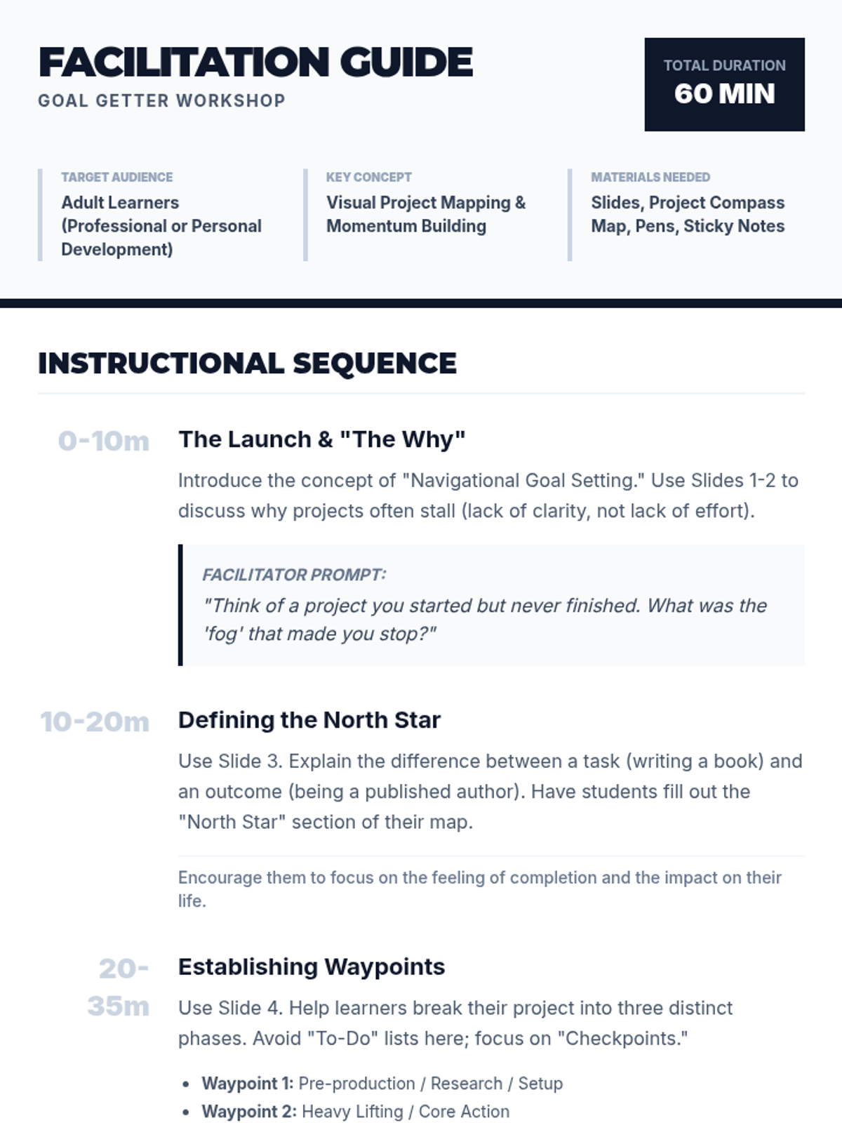 A comprehensive workshop lesson for adult learners focused on breaking down complex projects into actionable, motivated steps using a visual mapping technique.