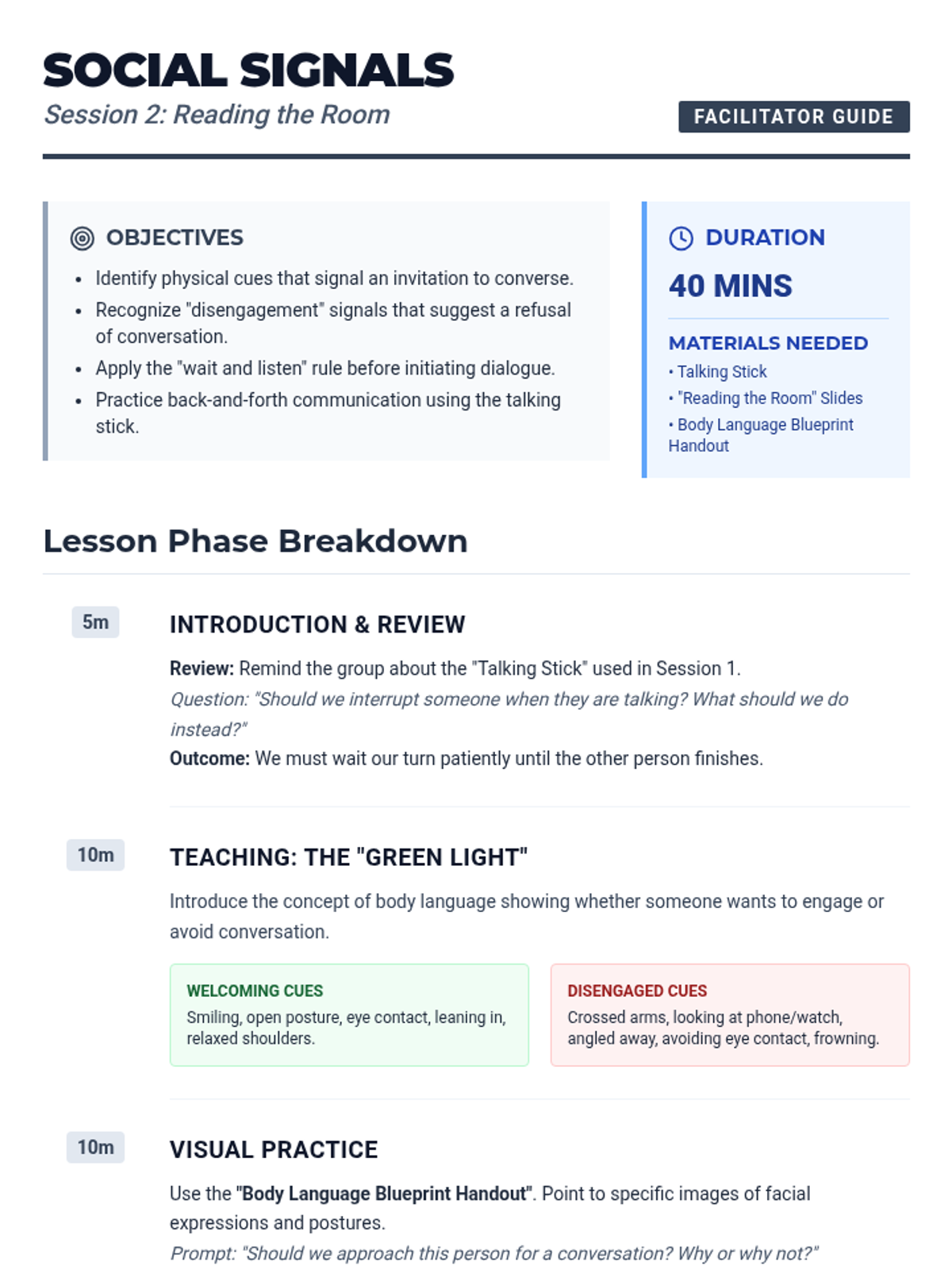 A 40-minute session for adults focused on recognizing welcoming versus disengaged body language to determine when to initiate or avoid conversation. Includes a review of the talking stick method and back-and-forth communication practice.