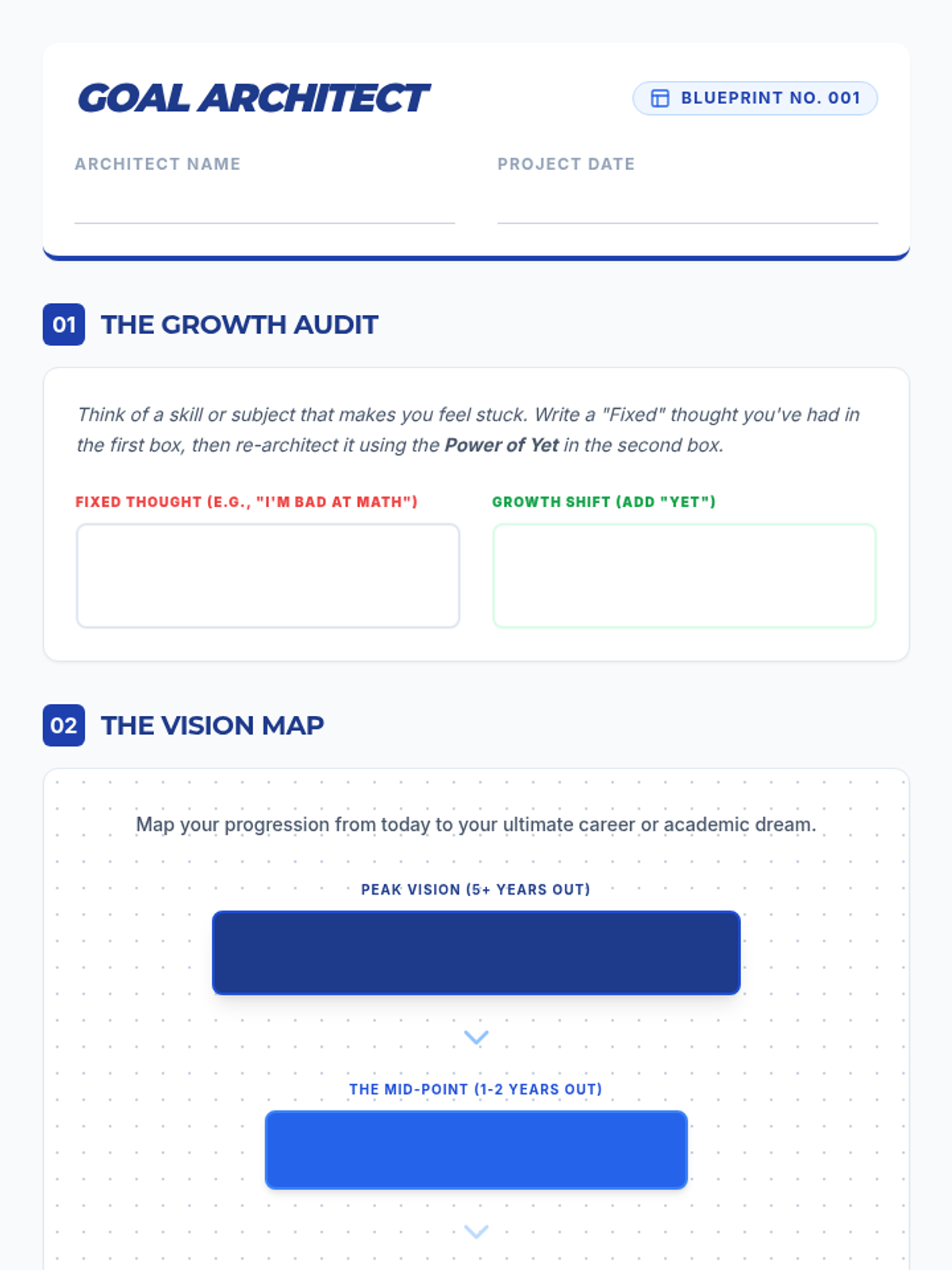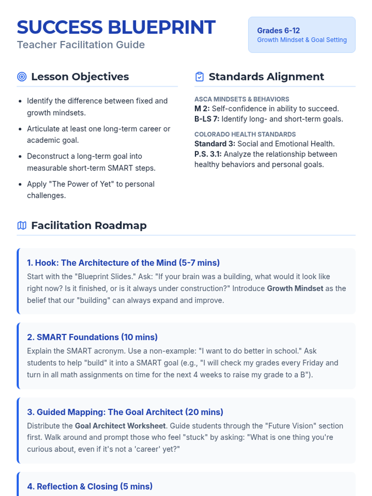 A comprehensive classroom guidance lesson for grades 6-12 focused on developing a growth mindset and mastering SMART goal setting. Students will map out their academic and career aspirations using an architectural 'blueprint' theme to build their future success.