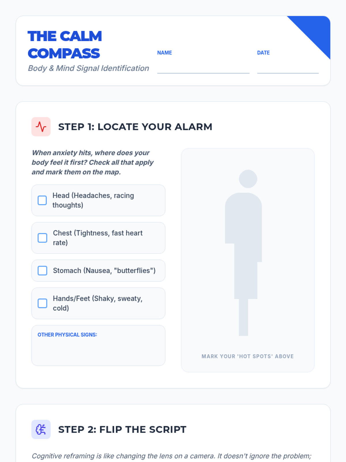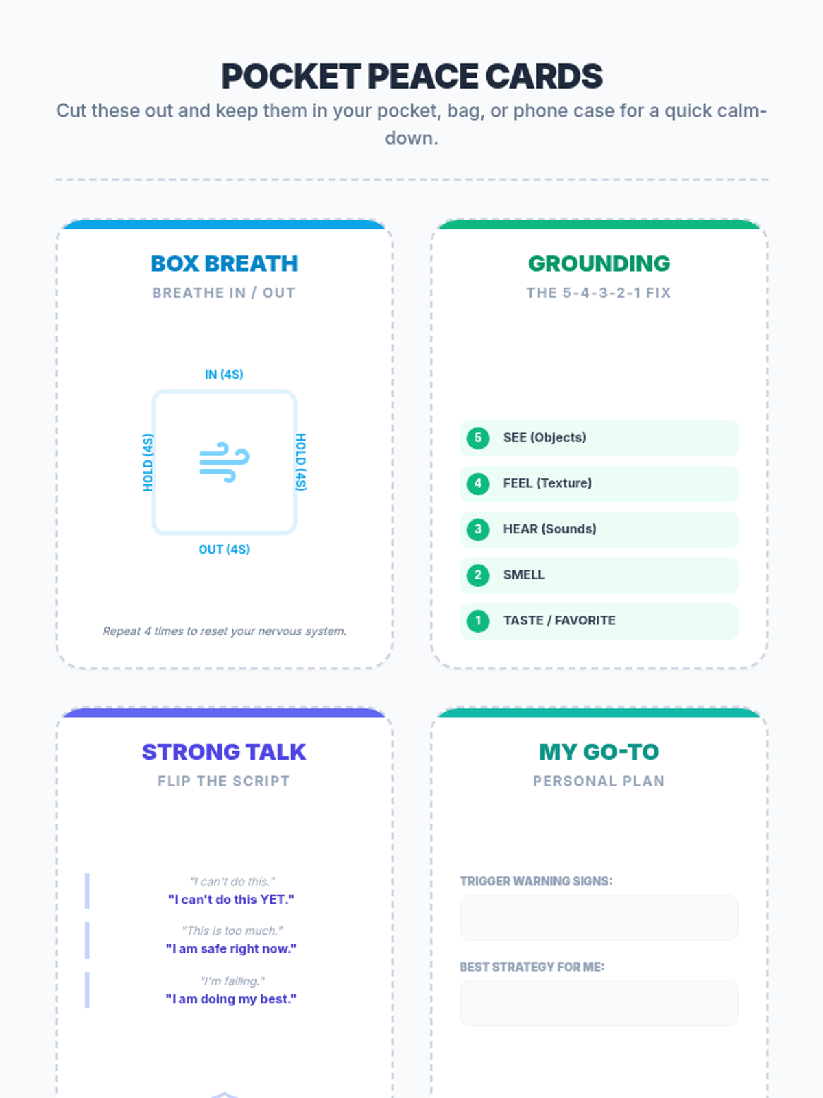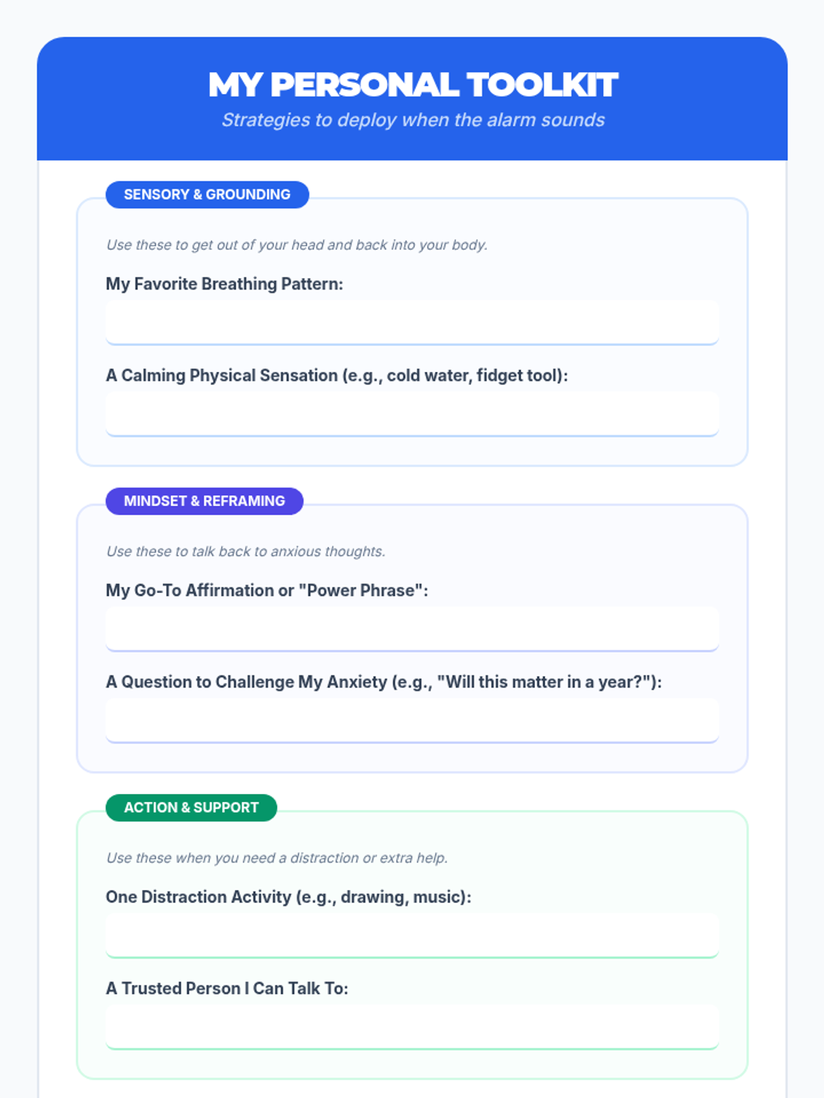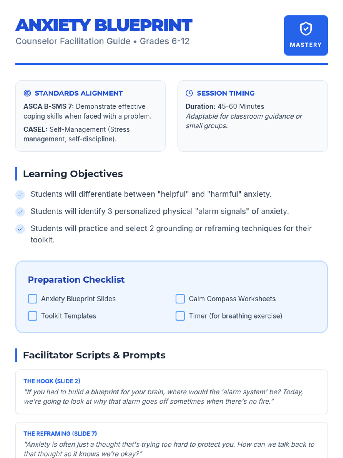 A comprehensive school counseling lesson for middle and high school students to identify anxiety symptoms and build a personalized toolkit of coping strategies including grounding and cognitive reframing.