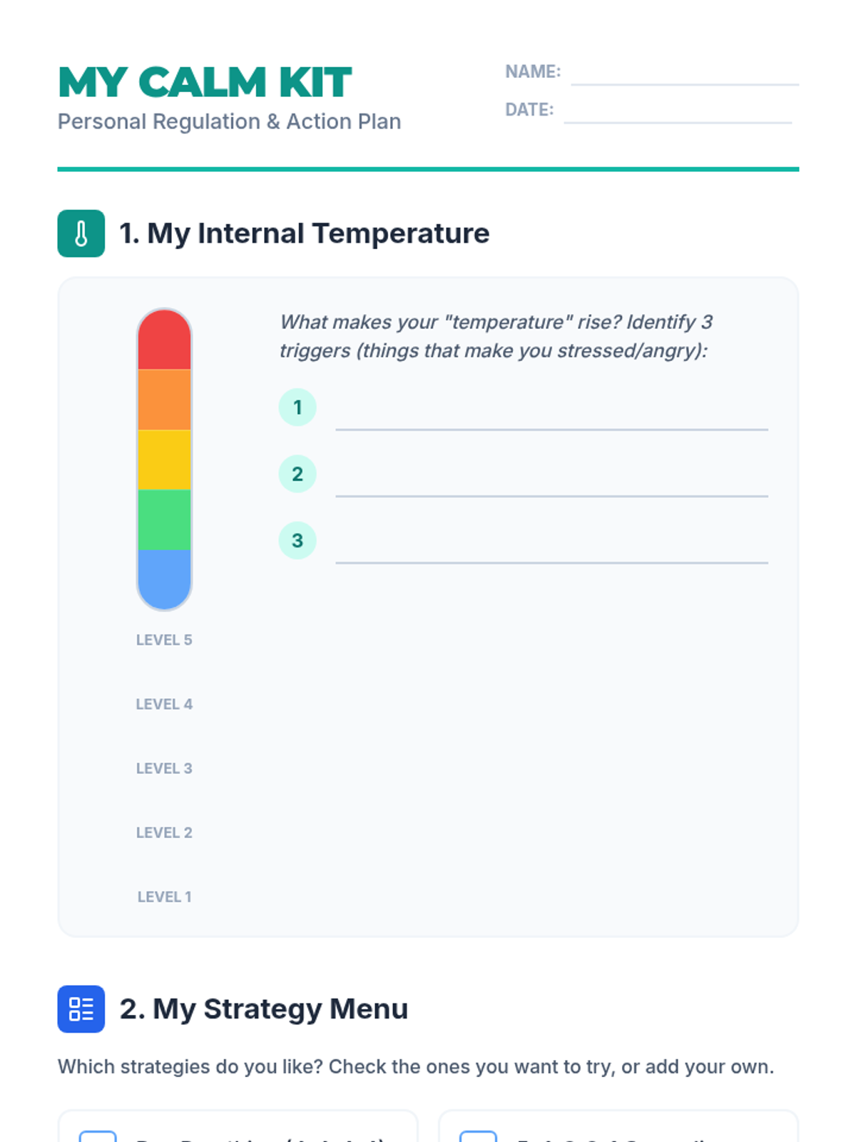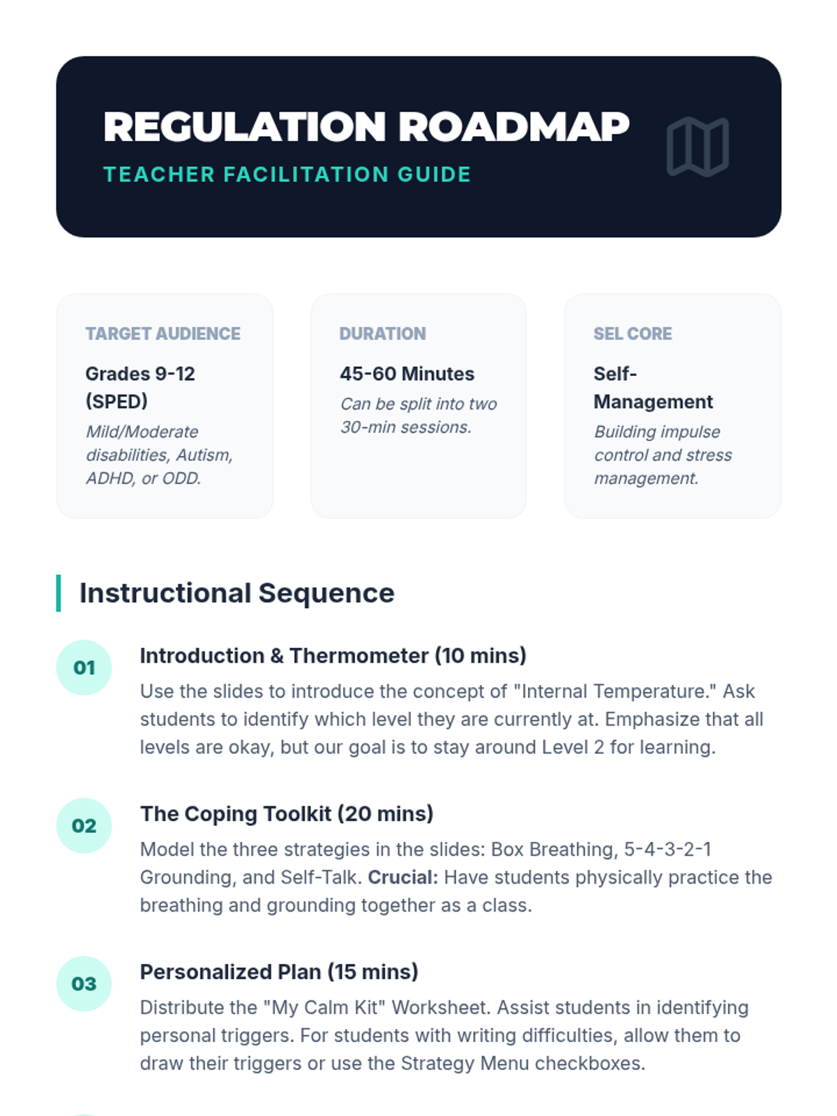 A comprehensive SEL lesson for high school SPED students focusing on identifying emotional states via a feelings thermometer and building a personalized toolkit of coping strategies like grounding and deep breathing.