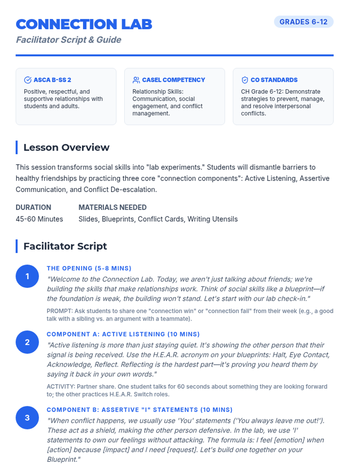 A small group counseling lesson focused on developing core relationship skills through active listening, assertive communication, and conflict resolution role-plays. Aligned with ASCA, CASEL, and Colorado standards.