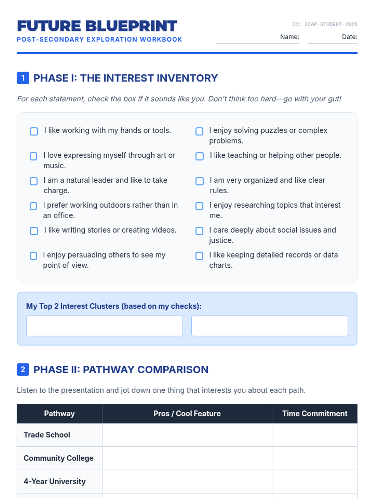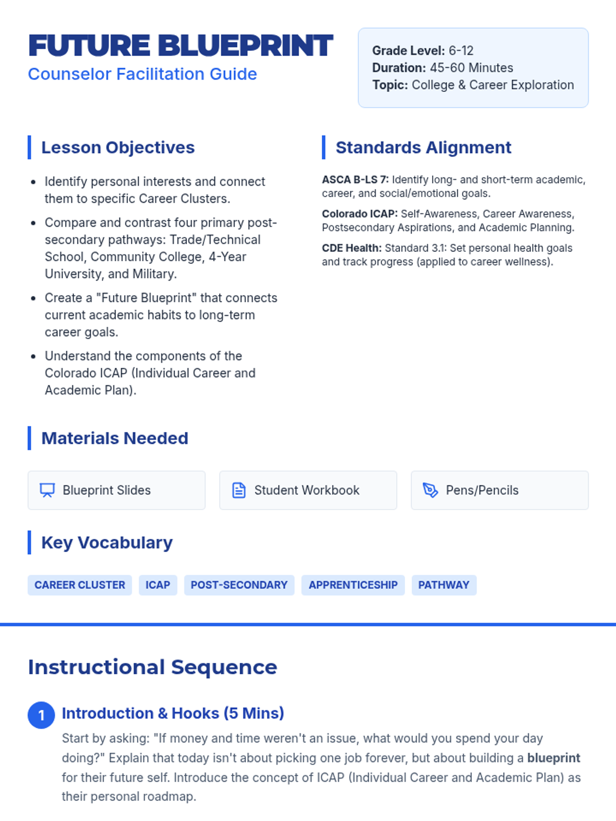 A comprehensive college and career exploration lesson where students identify career interests, research post-secondary pathways, and set long-term academic goals aligned with ASCA and ICAP standards.