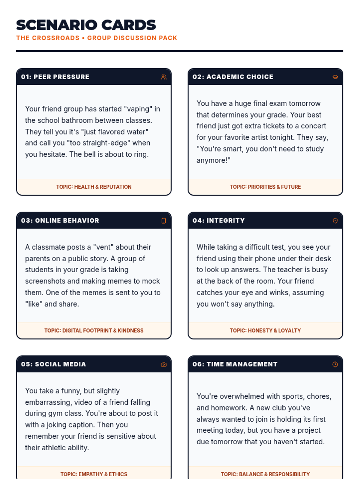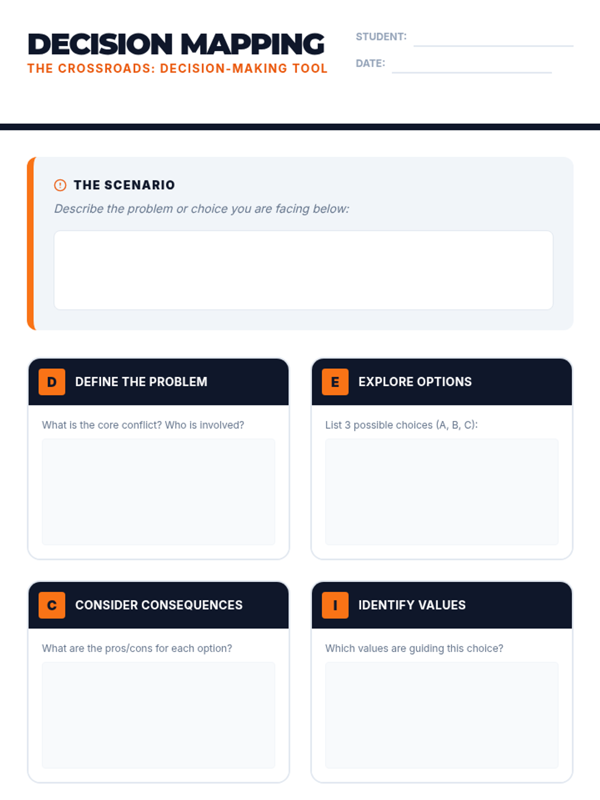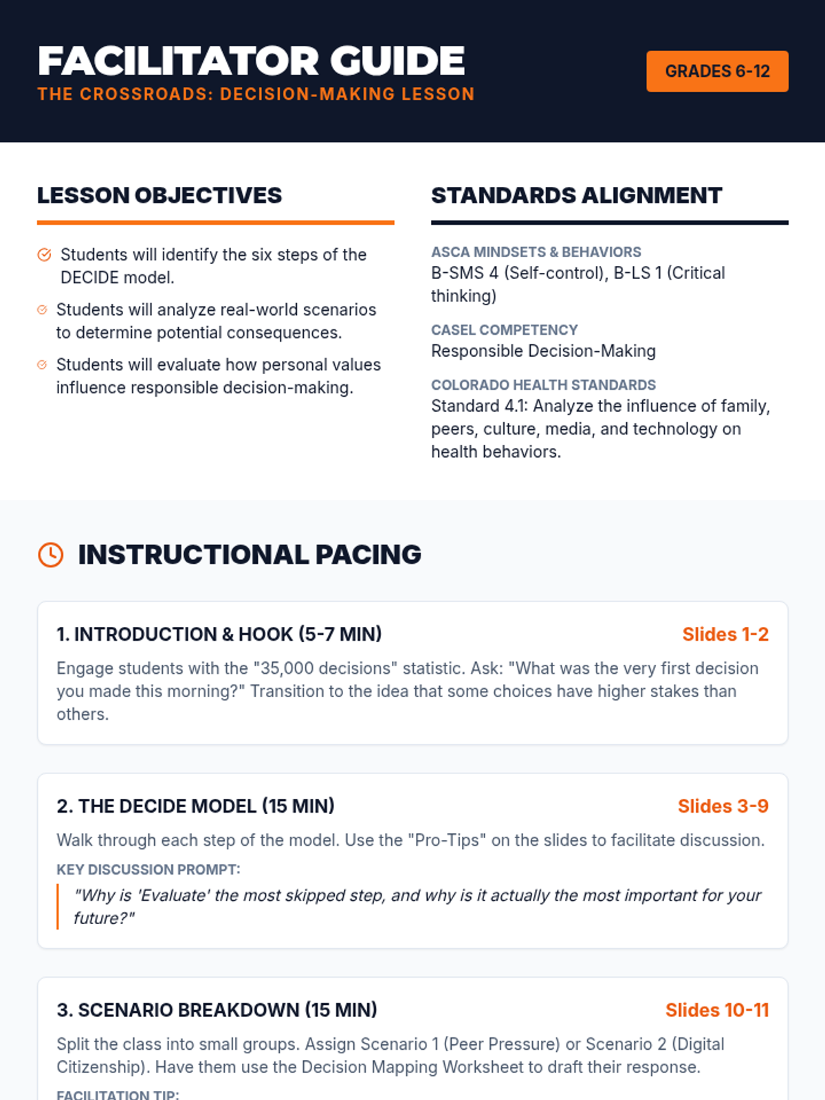 A comprehensive guidance lesson for grades 6-12 focused on the DECIDE model for responsible decision-making. Students practice navigating real-world dilemmas like peer pressure and digital citizenship while considering long-term consequences.