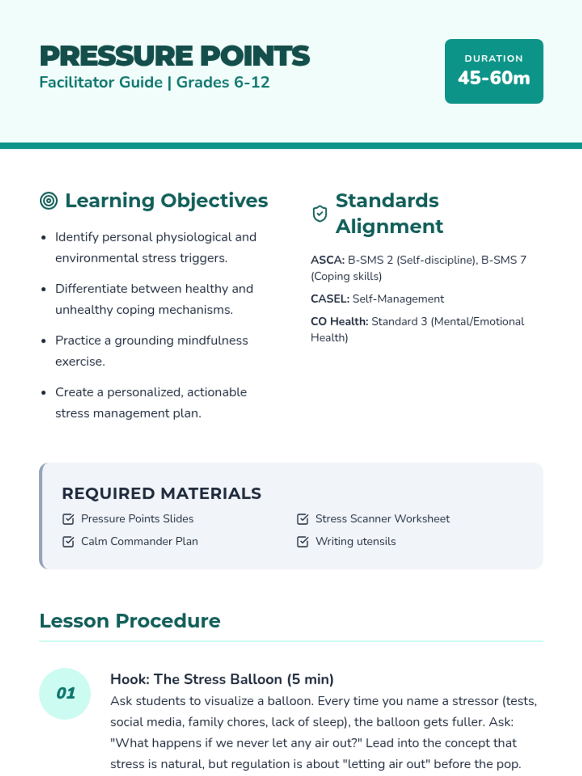 A comprehensive lesson for grades 6-12 focusing on identifying stress triggers and building a personalized toolkit of regulation strategies including mindfulness and time management.