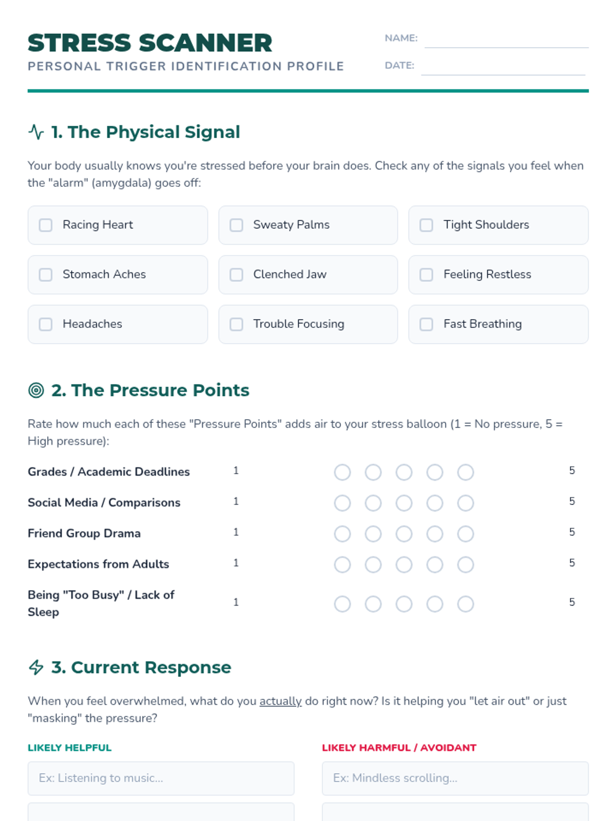 A comprehensive lesson for grades 7-12 on understanding the neuroscience of stress and building a personalized toolkit of evidence-based coping strategies. Students explore the 4 F's of stress responses and practice concrete techniques like box breathing and cognitive reframing.