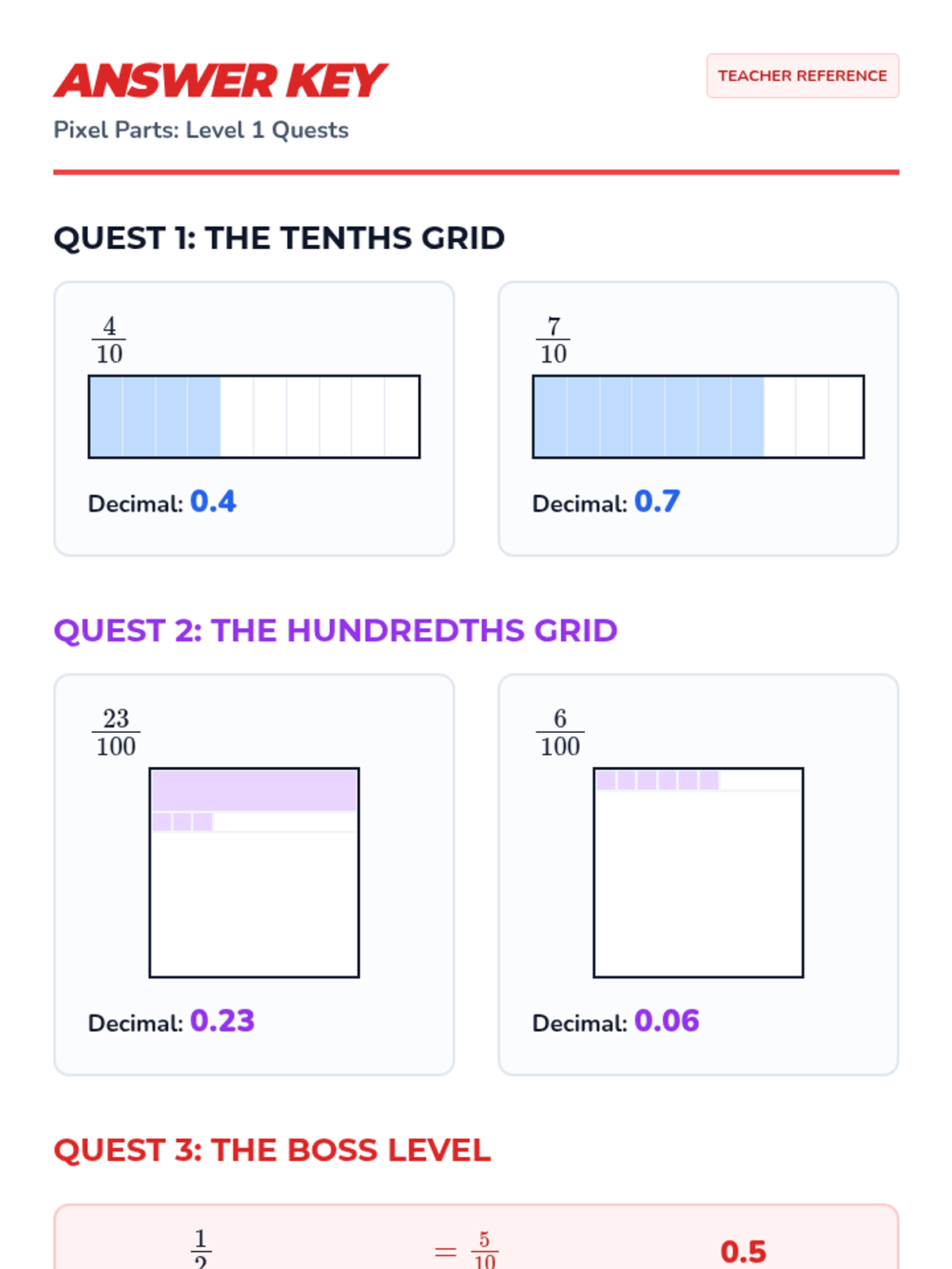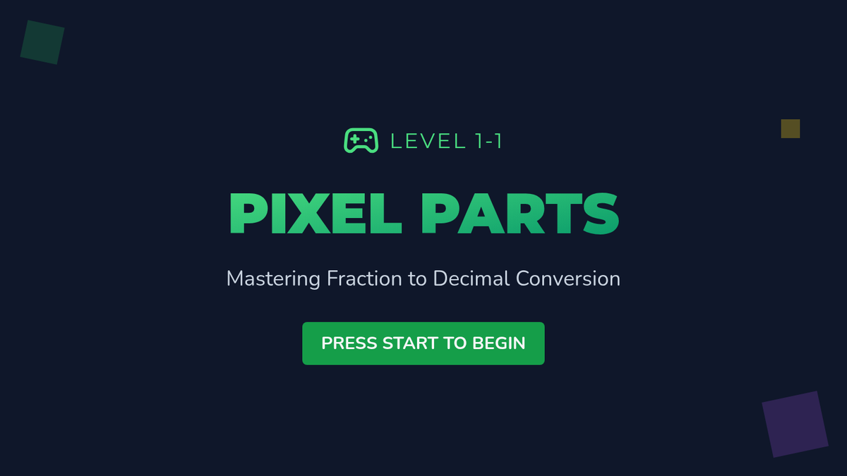 A visual-heavy lesson using a pixel-art theme to help students master converting fractions with denominators of 10 and 100 into decimals using grids and place value charts.