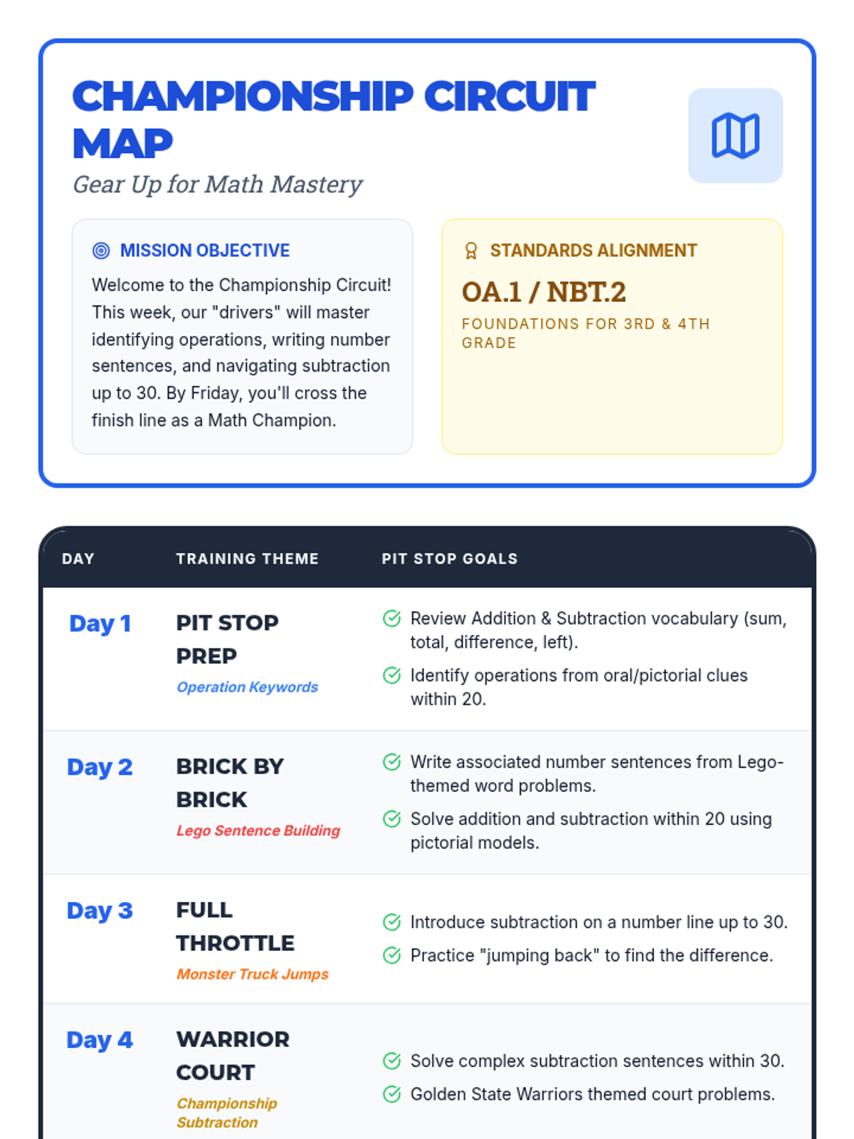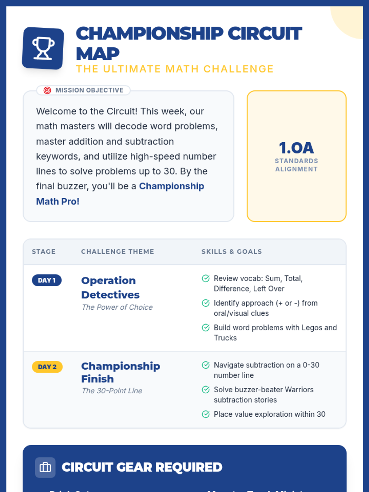 A final cumulative review and performance assessment where students demonstrate mastery of operation choice and number line subtraction to earn their championship trophy.