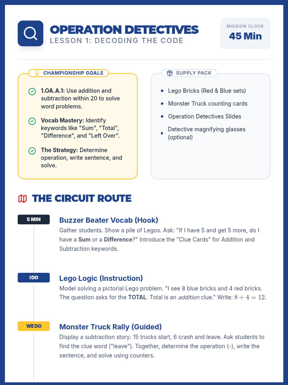 Students review addition and subtraction vocabulary and learn to determine the correct operation for word problems within 20, featuring Lego and Monster Truck themes.