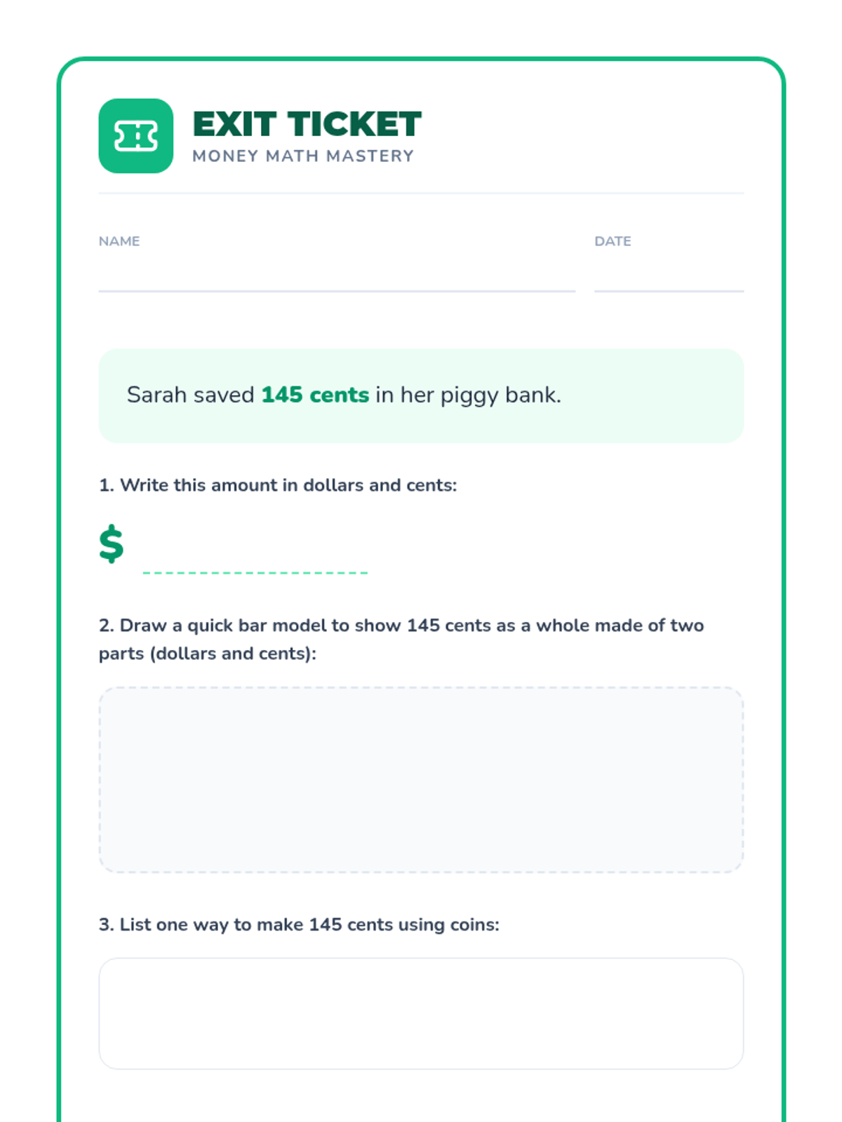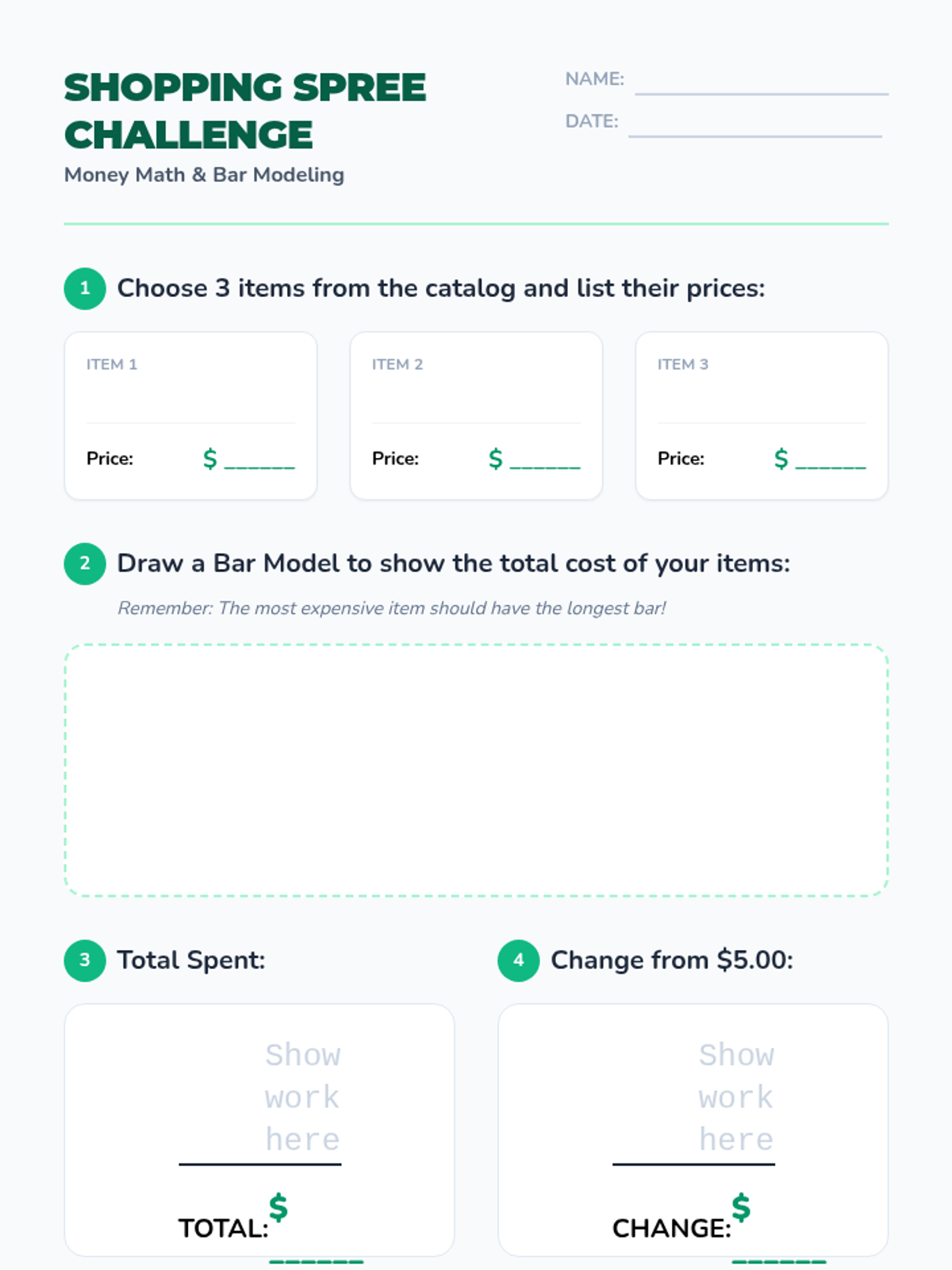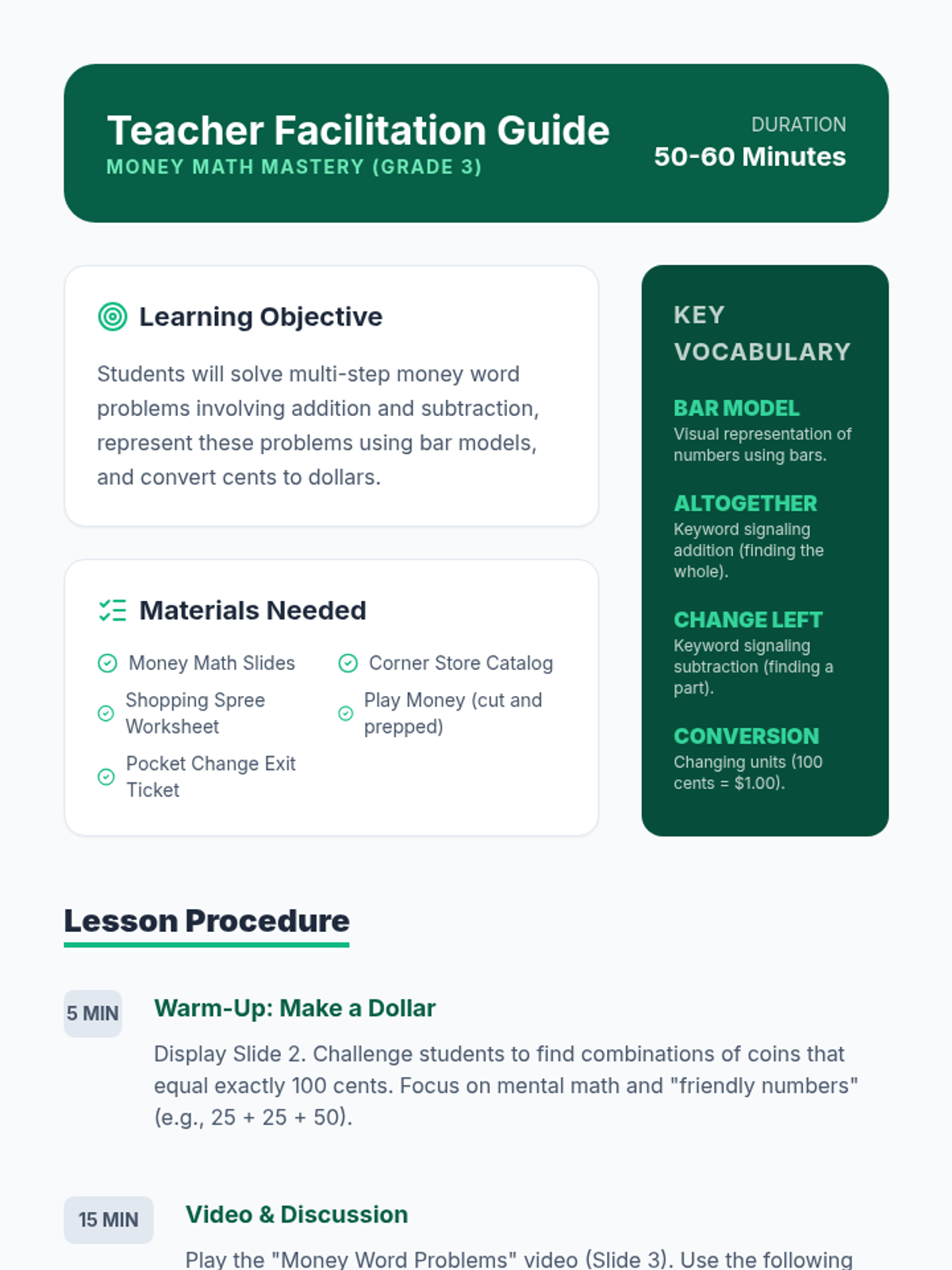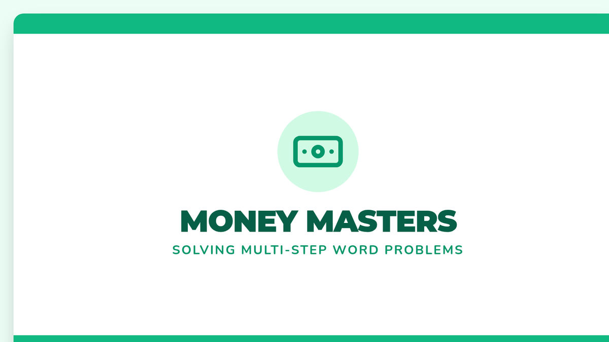 A comprehensive lesson where students master multi-step money word problems, bar modeling, and unit conversion (cents to dollars) through a hands-on shopping spree activity.