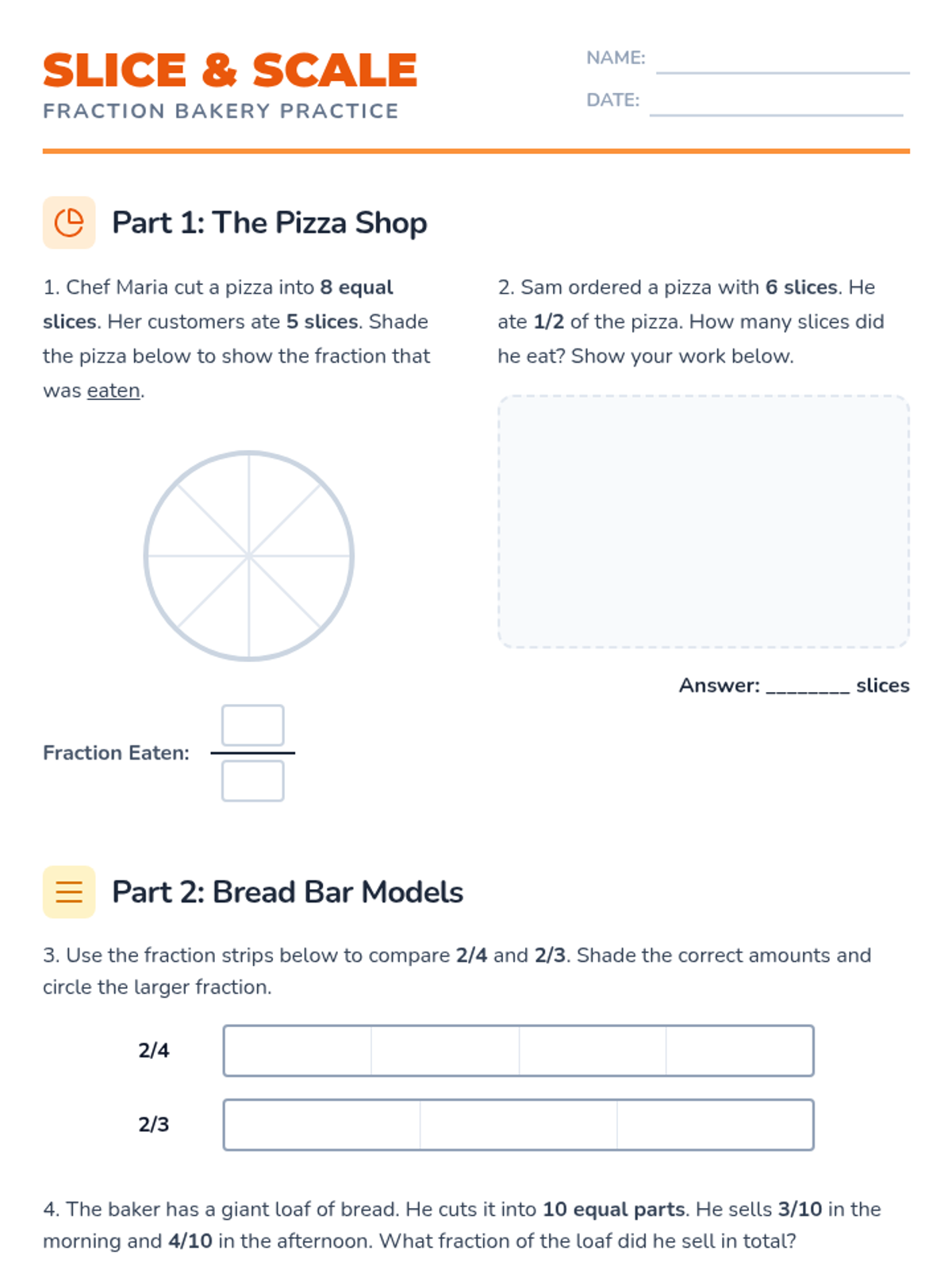 A comprehensive lesson on fractions of a whole using a bakery theme. Students explore visual models like pizza circles and fraction strips through real-world scenarios of sharing and scaling recipes.