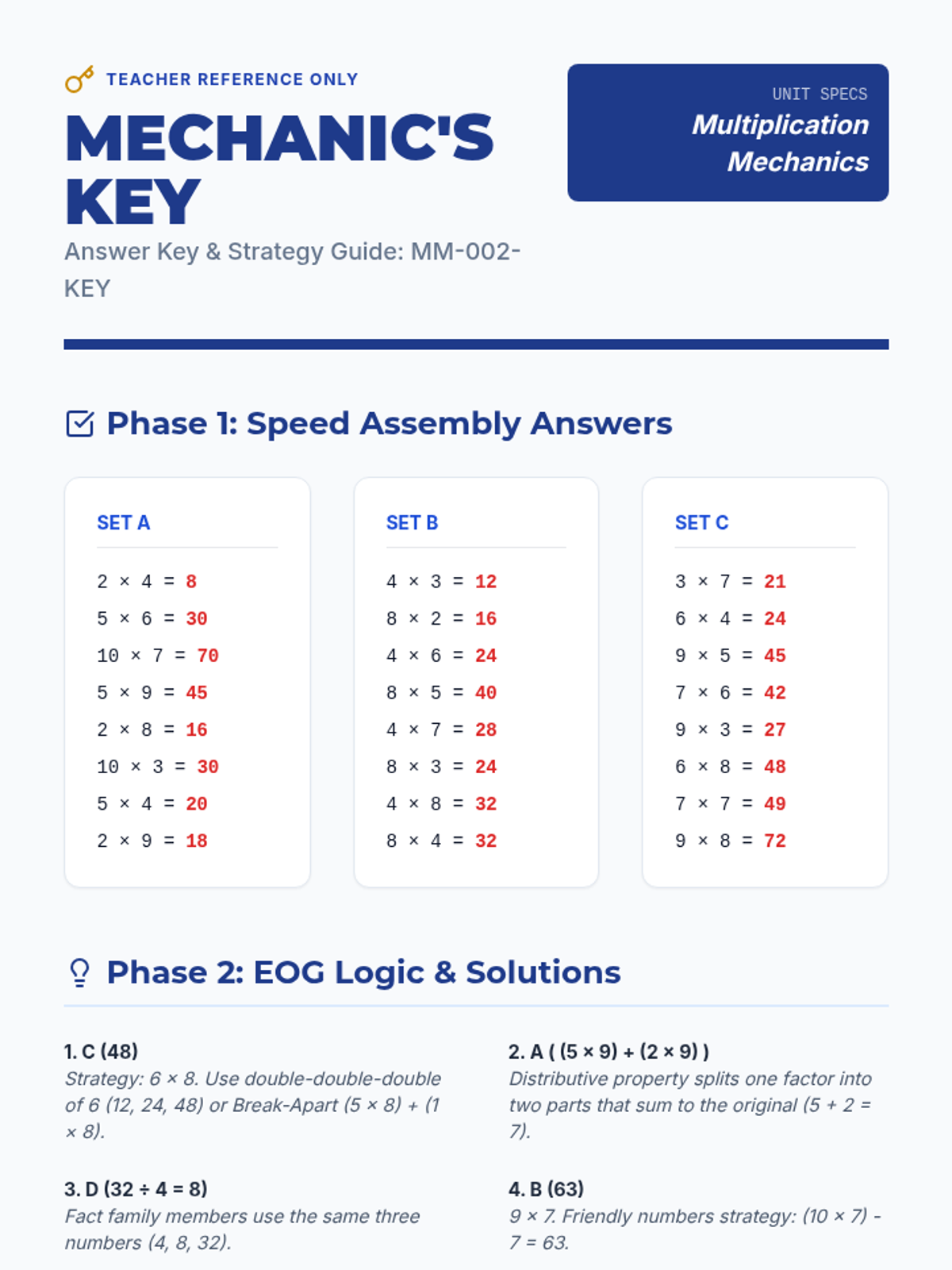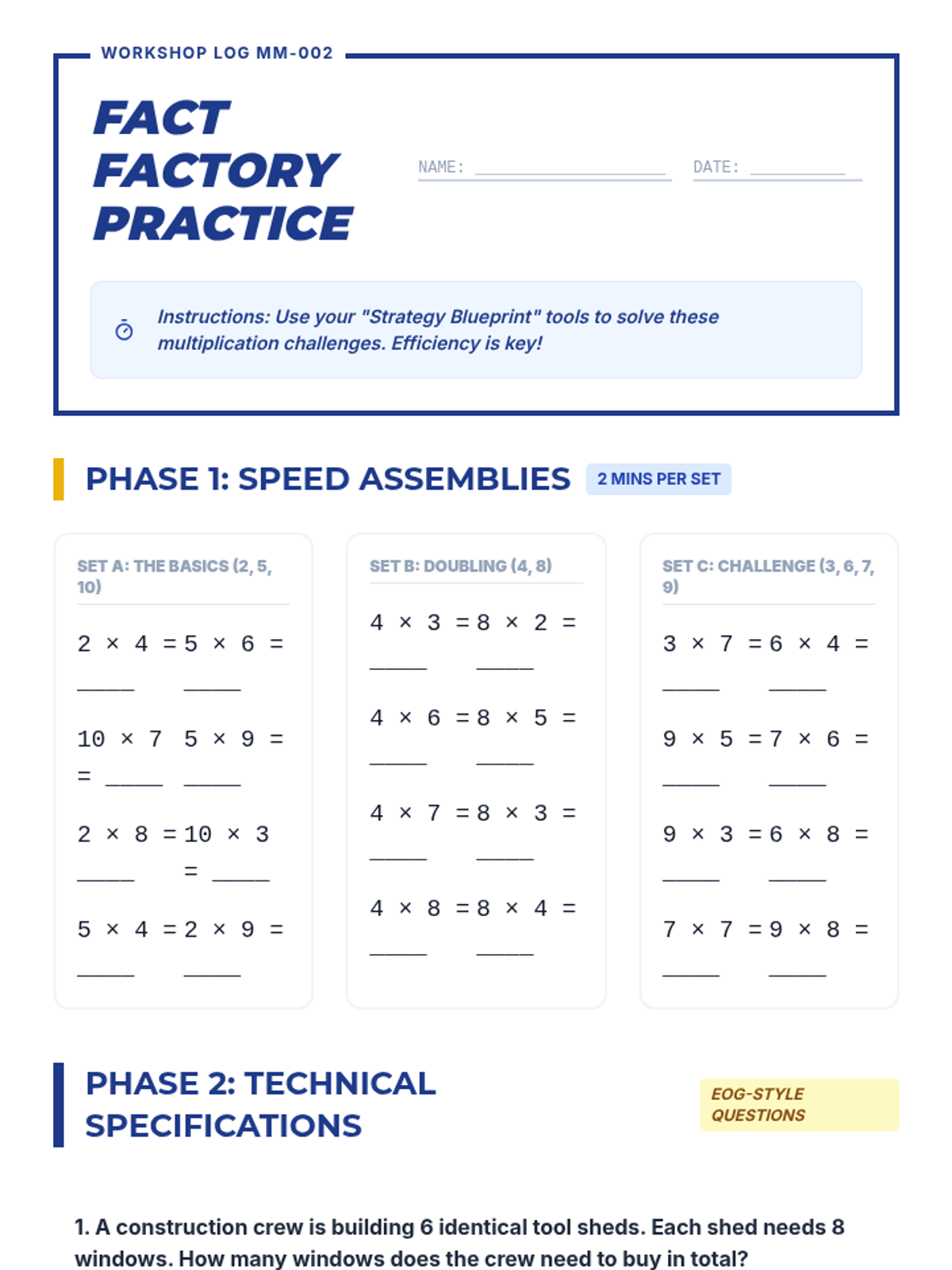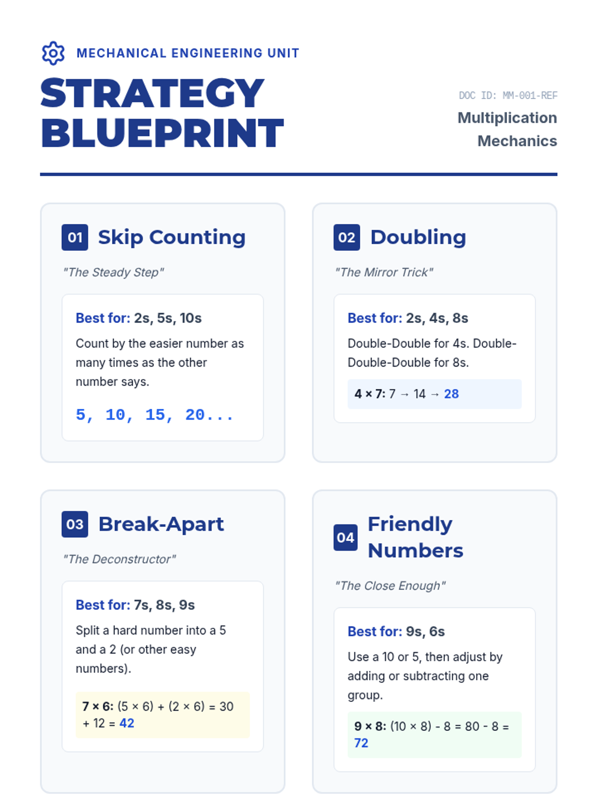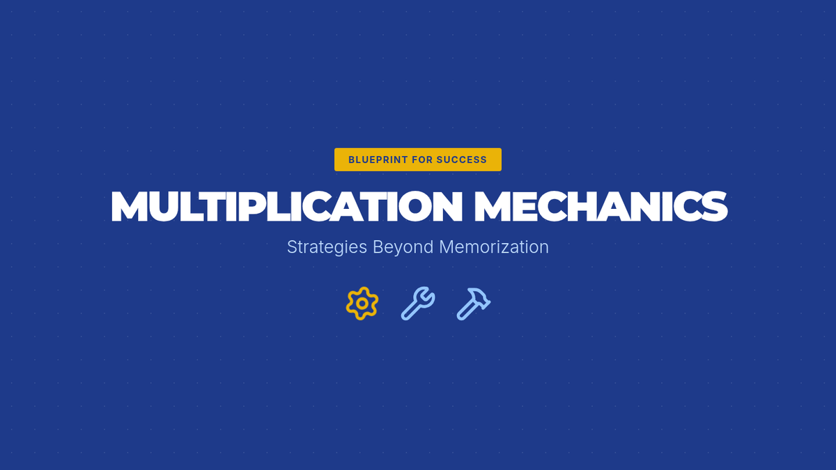 This lesson teaches students five powerful mental strategies for multiplication beyond rote memorization: skip counting, doubling, breaking apart, friendly numbers, and fact families. It focuses on building conceptual understanding and fluency through a 'Multiplication Mechanics' blueprint theme.
