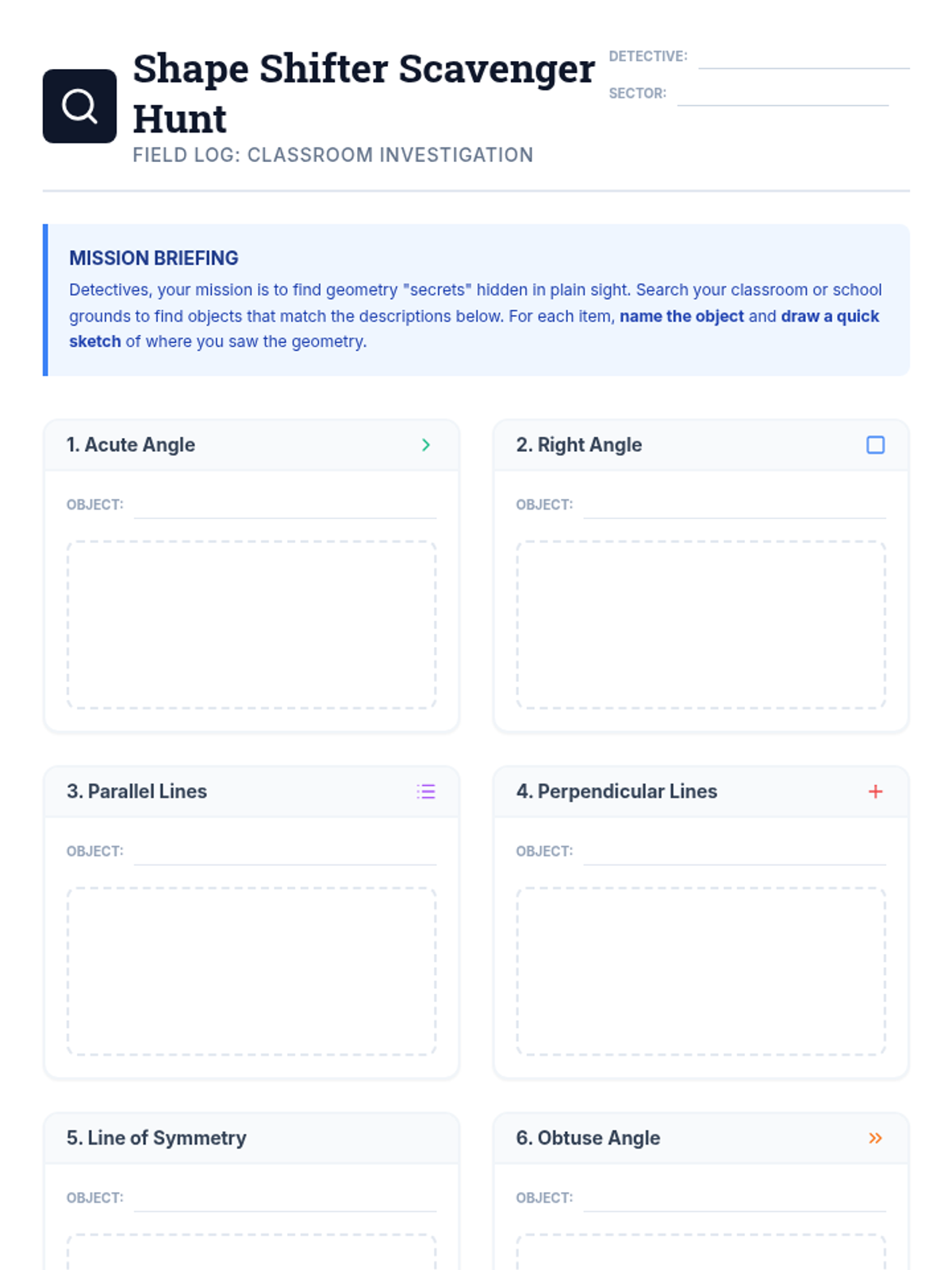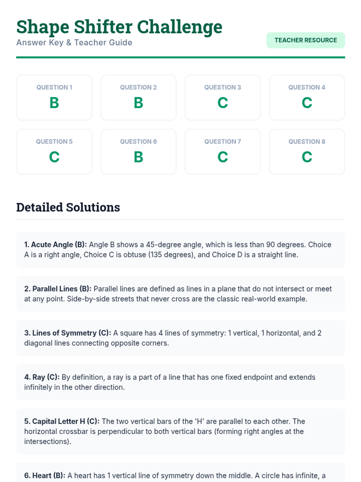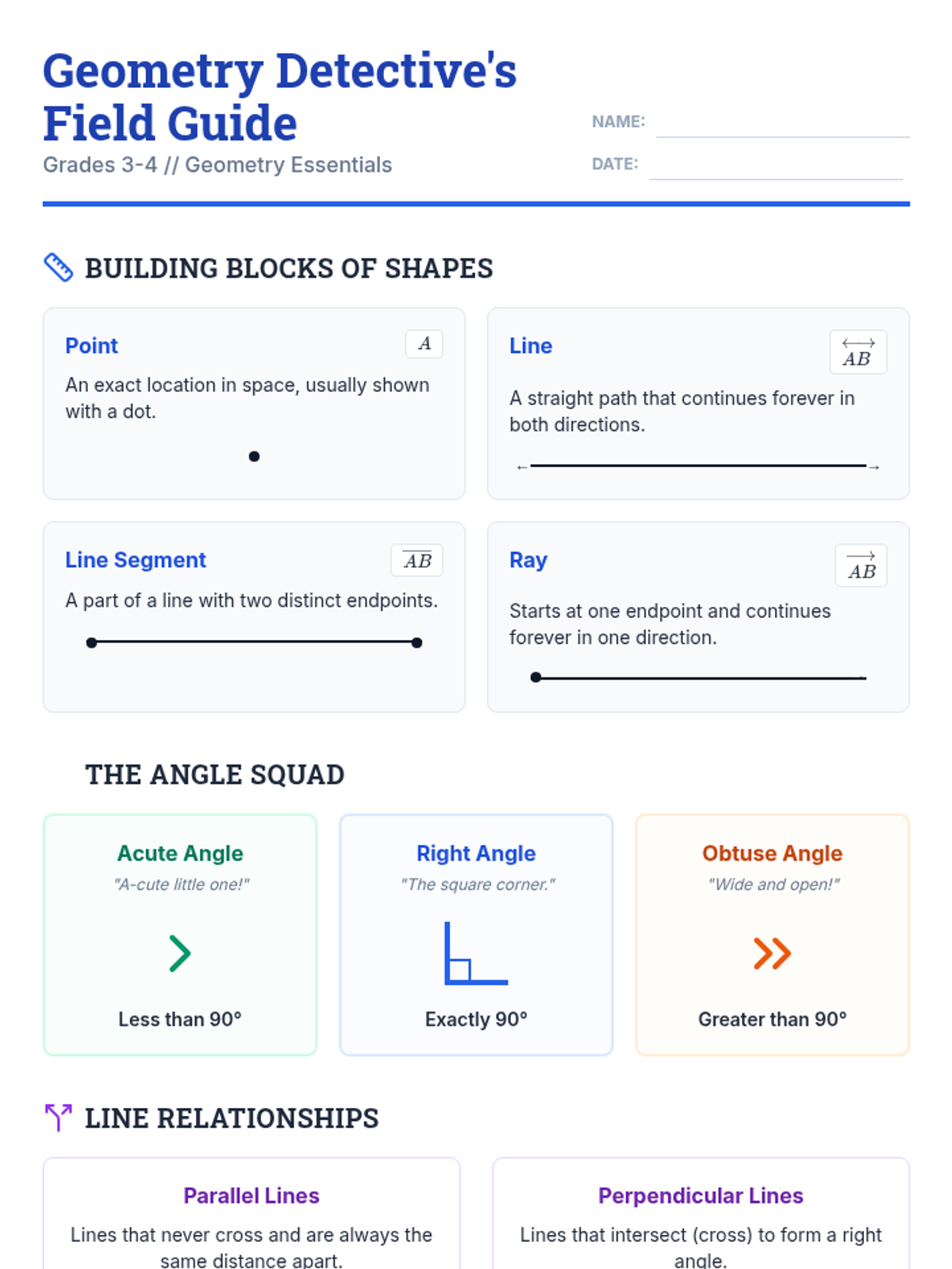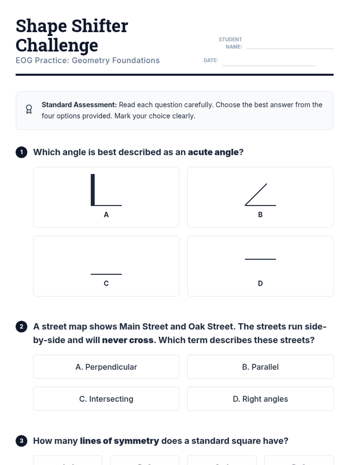 A comprehensive geometry lesson for grades 3-4 focusing on identifying lines, classifying angles, and recognizing symmetry through real-world applications and EOG-style practice.
