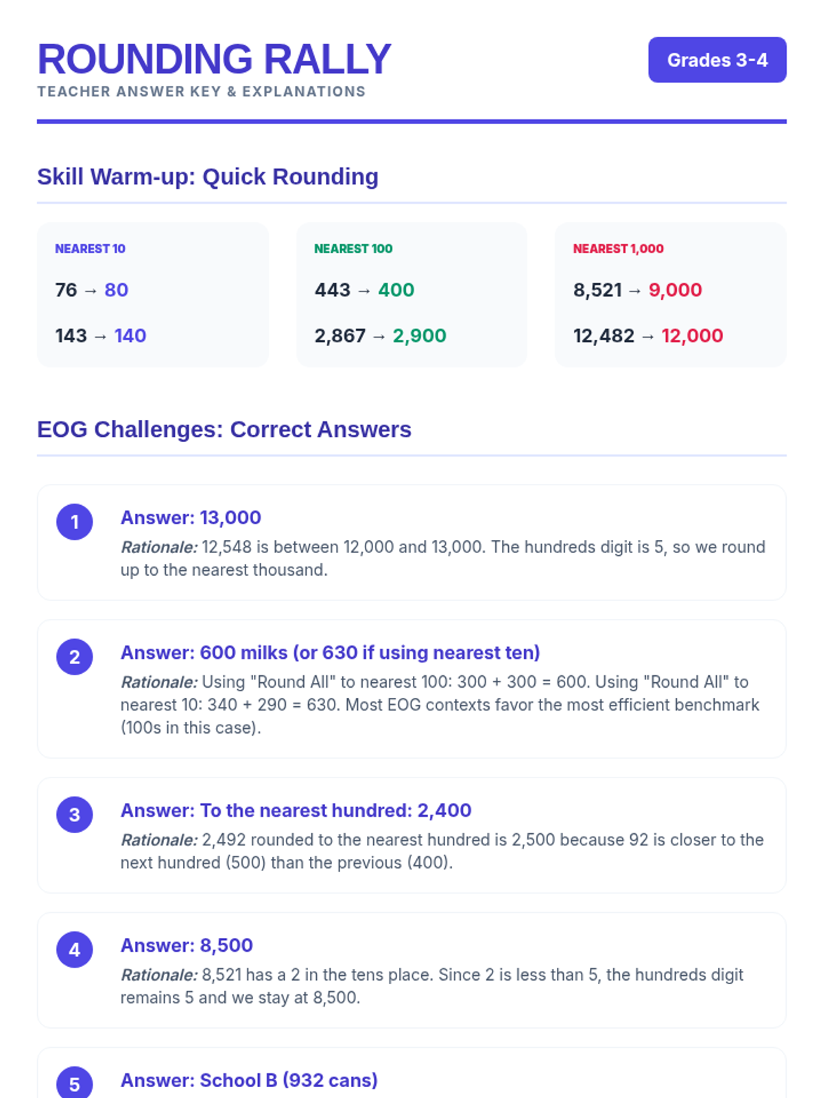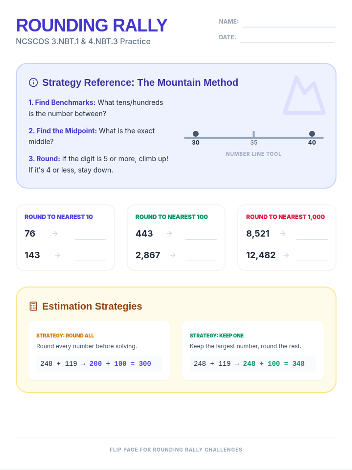 A Grade 3-4 math lesson focused on rounding whole numbers to the nearest 10, 100, and 1000, using number lines and estimation strategies within the context of North Carolina school events.