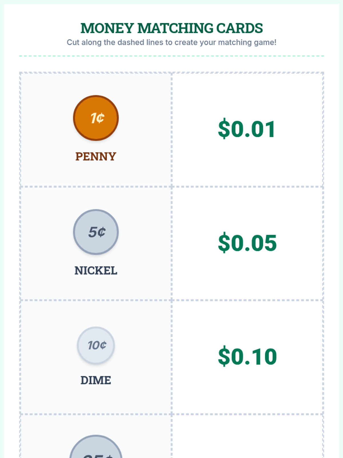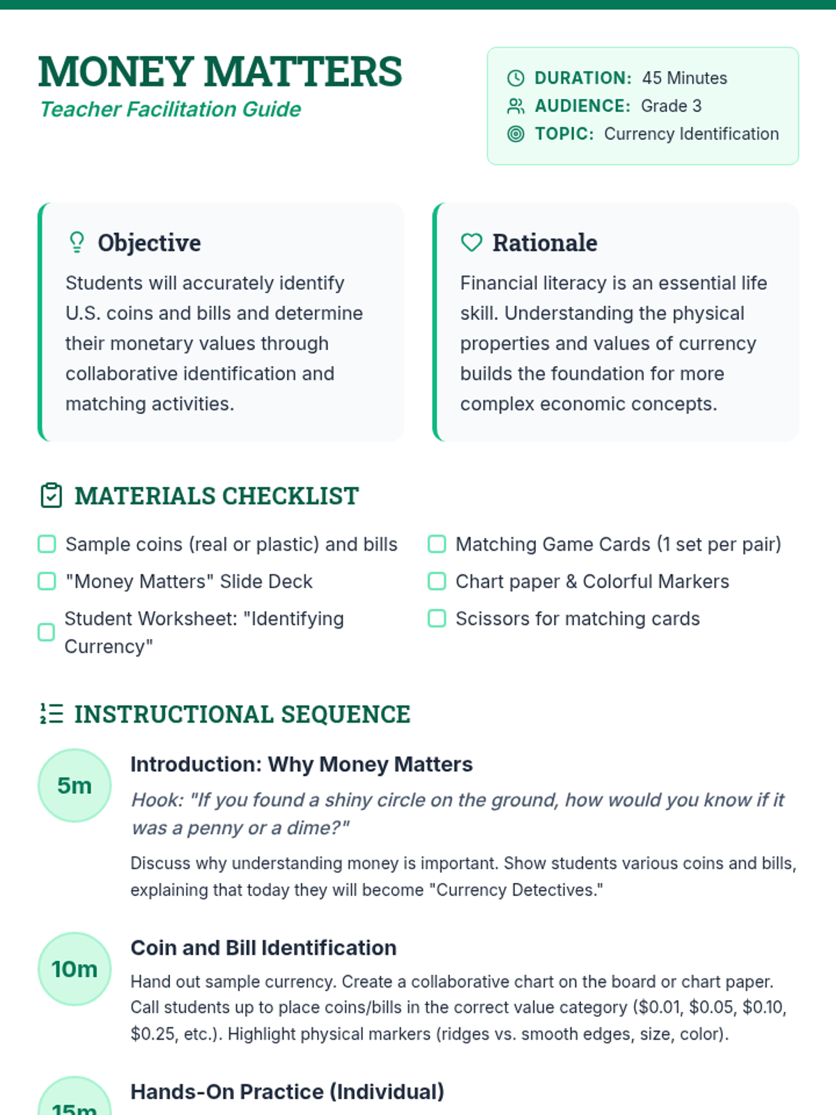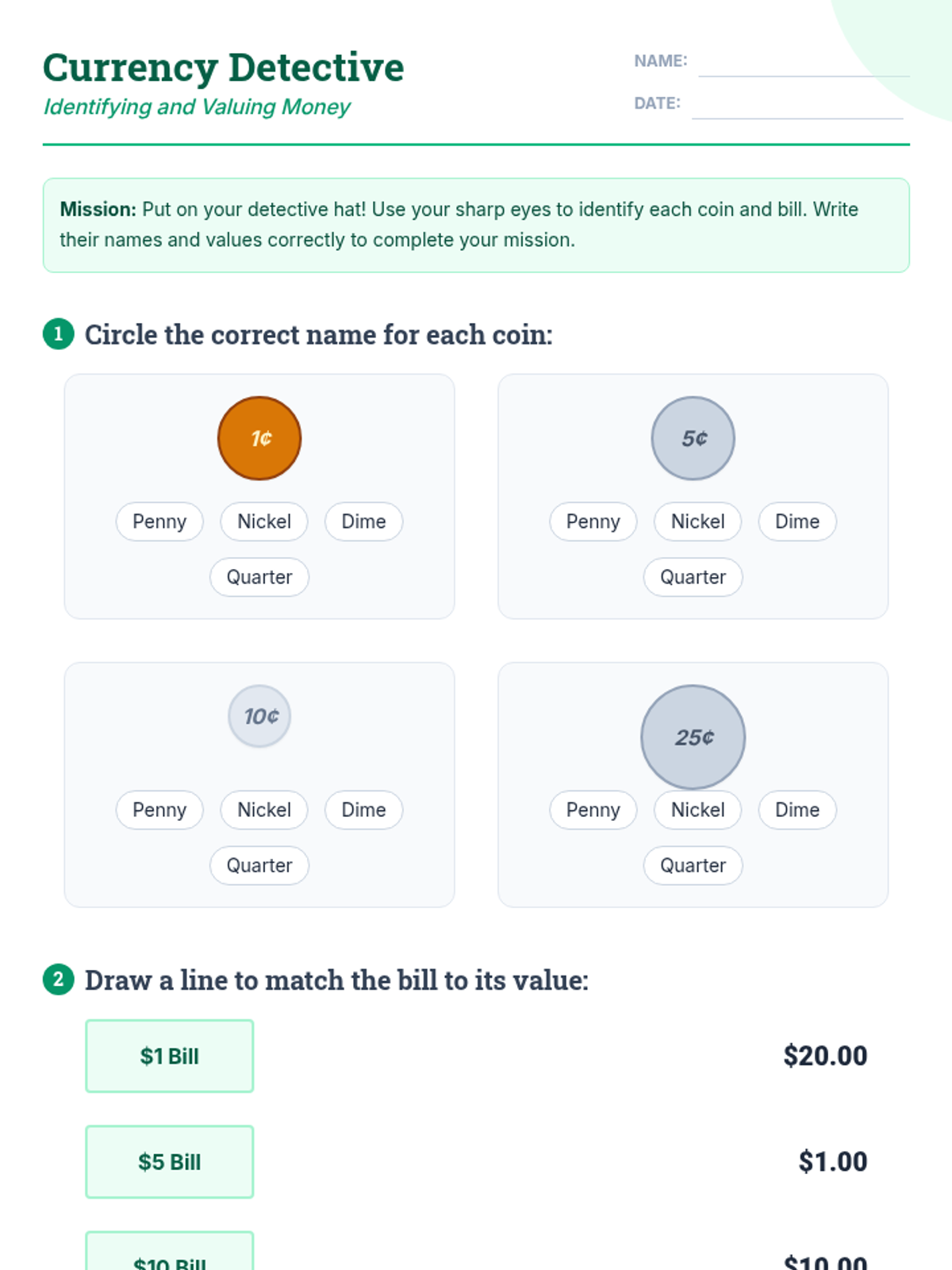 Students will learn the basics of money, including coins and bills, and their values through hands-on activities to develop essential financial literacy skills.