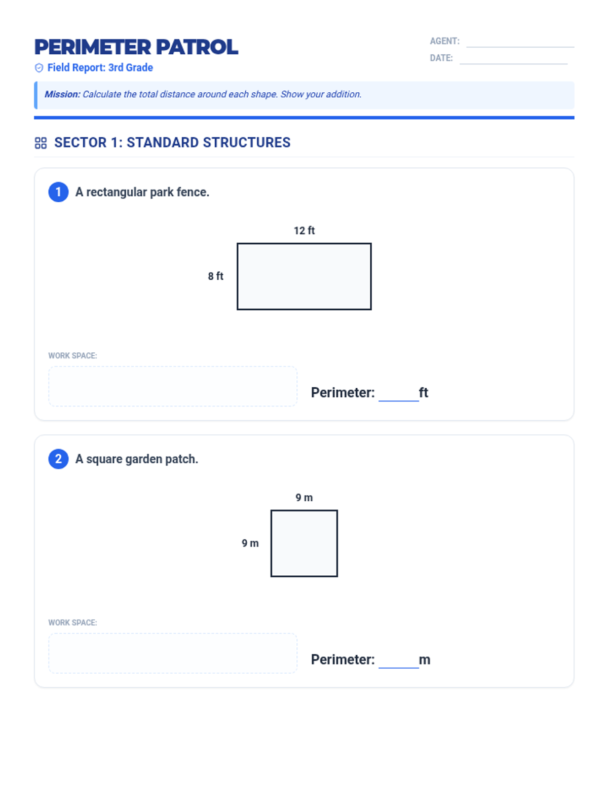 An introductory lesson on perimeter for 3rd grade, covering what perimeter is, how to calculate it for various polygons, and real-world applications.