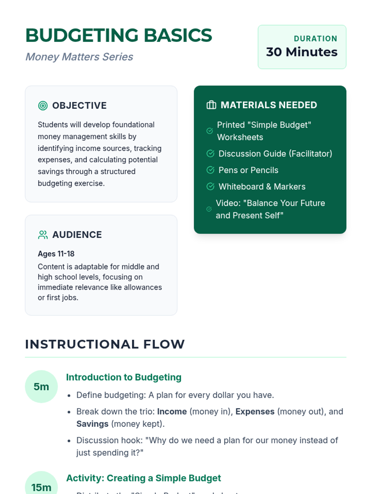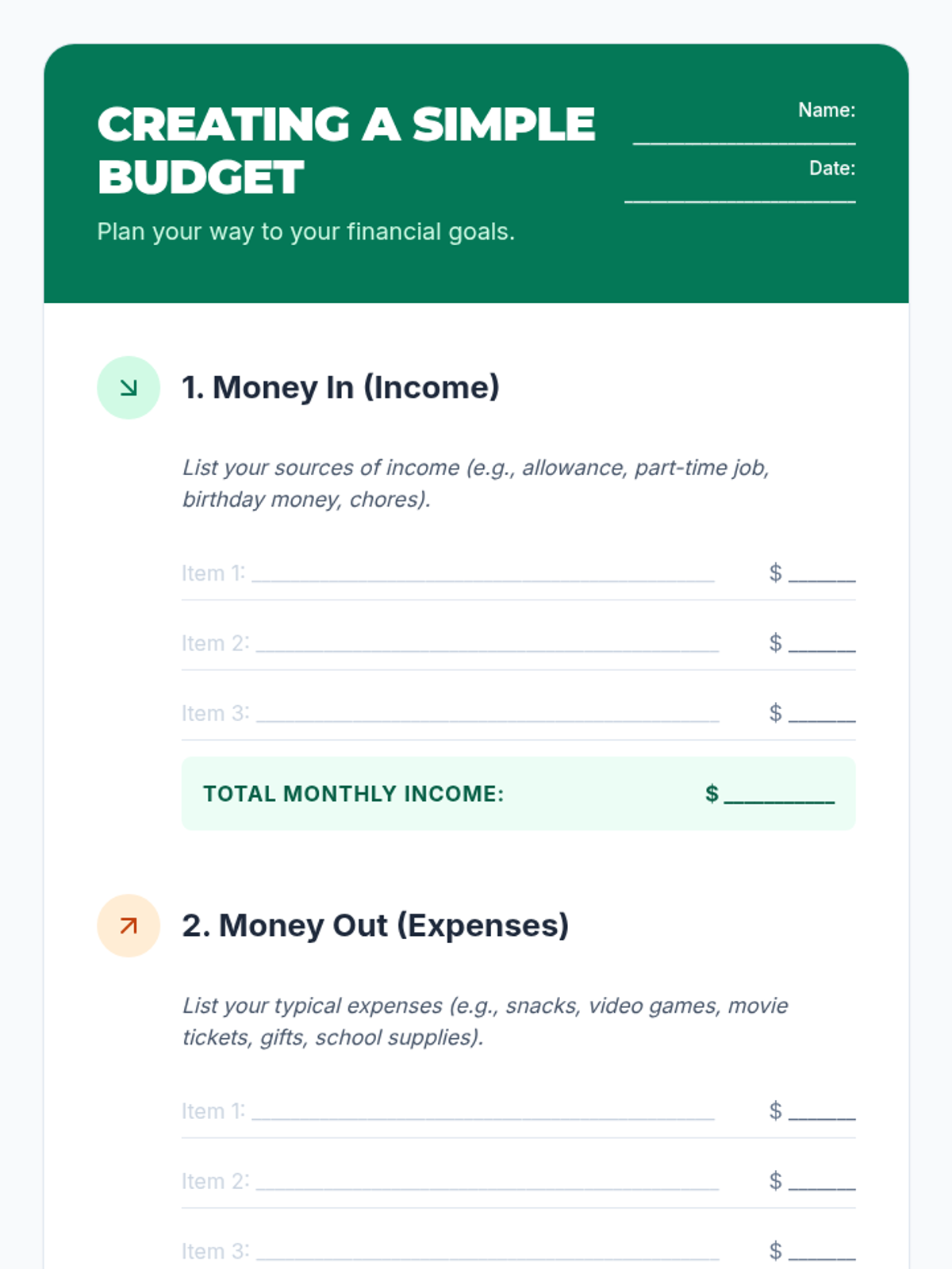 This lesson introduces students to the basics of budgeting, including understanding income, expenses, and savings. Through interactive activities like creating a simple budget, students will gain practical skills in financial planning that they can use in their daily lives. Emphasizing the importance of financial literacy, this lesson will empower students to make informed decisions about managing their money.
