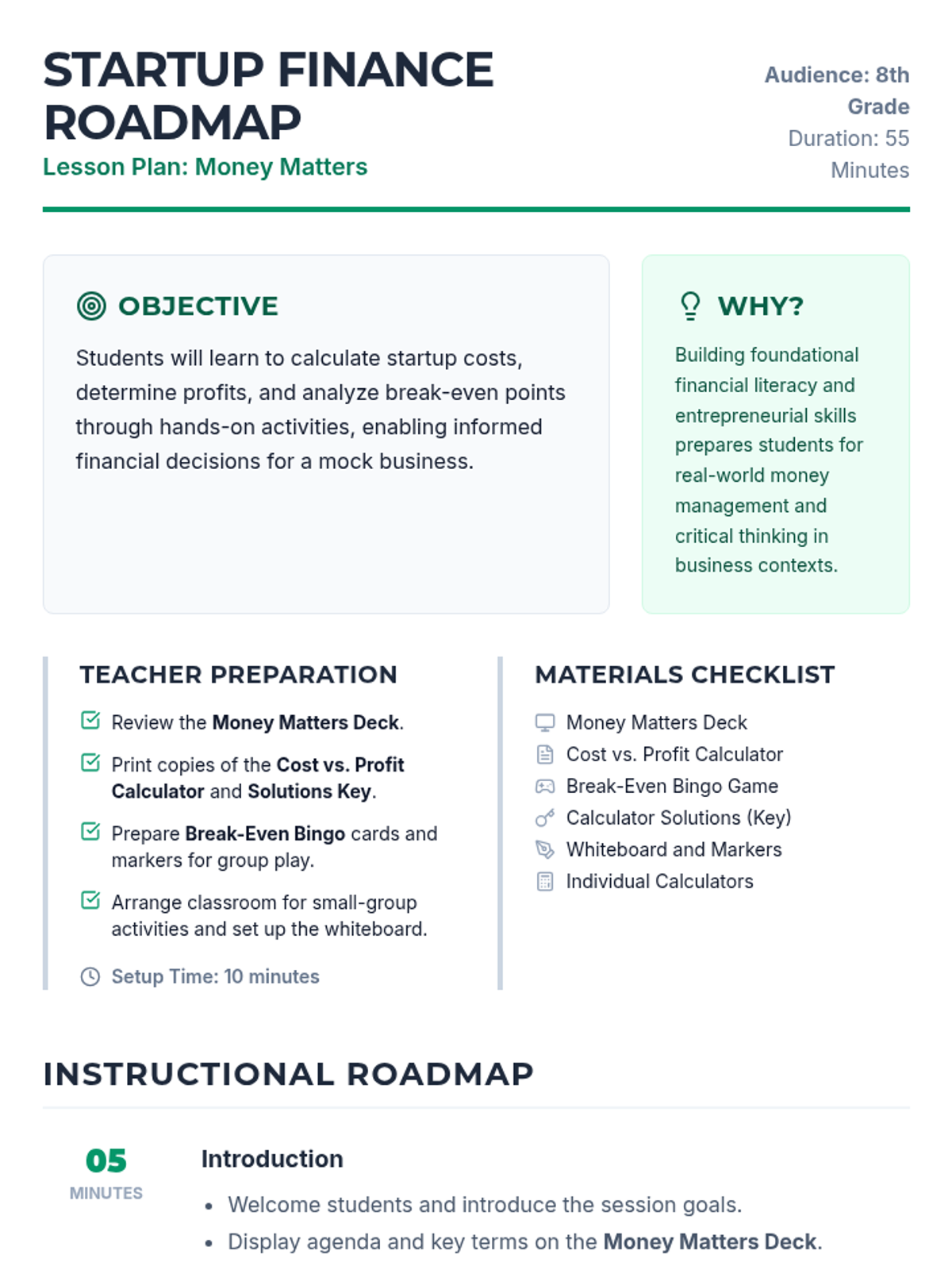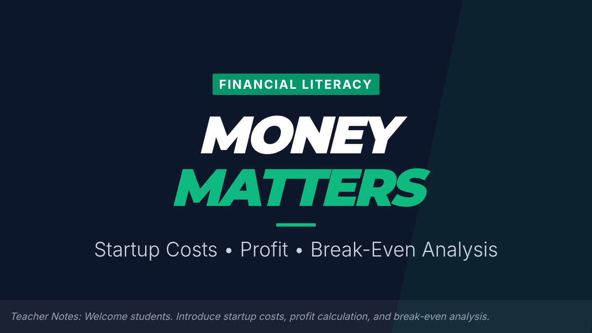 This interactive session introduces 8th graders to startup costs, profit calculation, and break-even analysis, building foundational financial literacy for entrepreneurship. Perfect for a 55-minute class, this Tier 1 lesson equips students with practical skills for real-world business decision making.