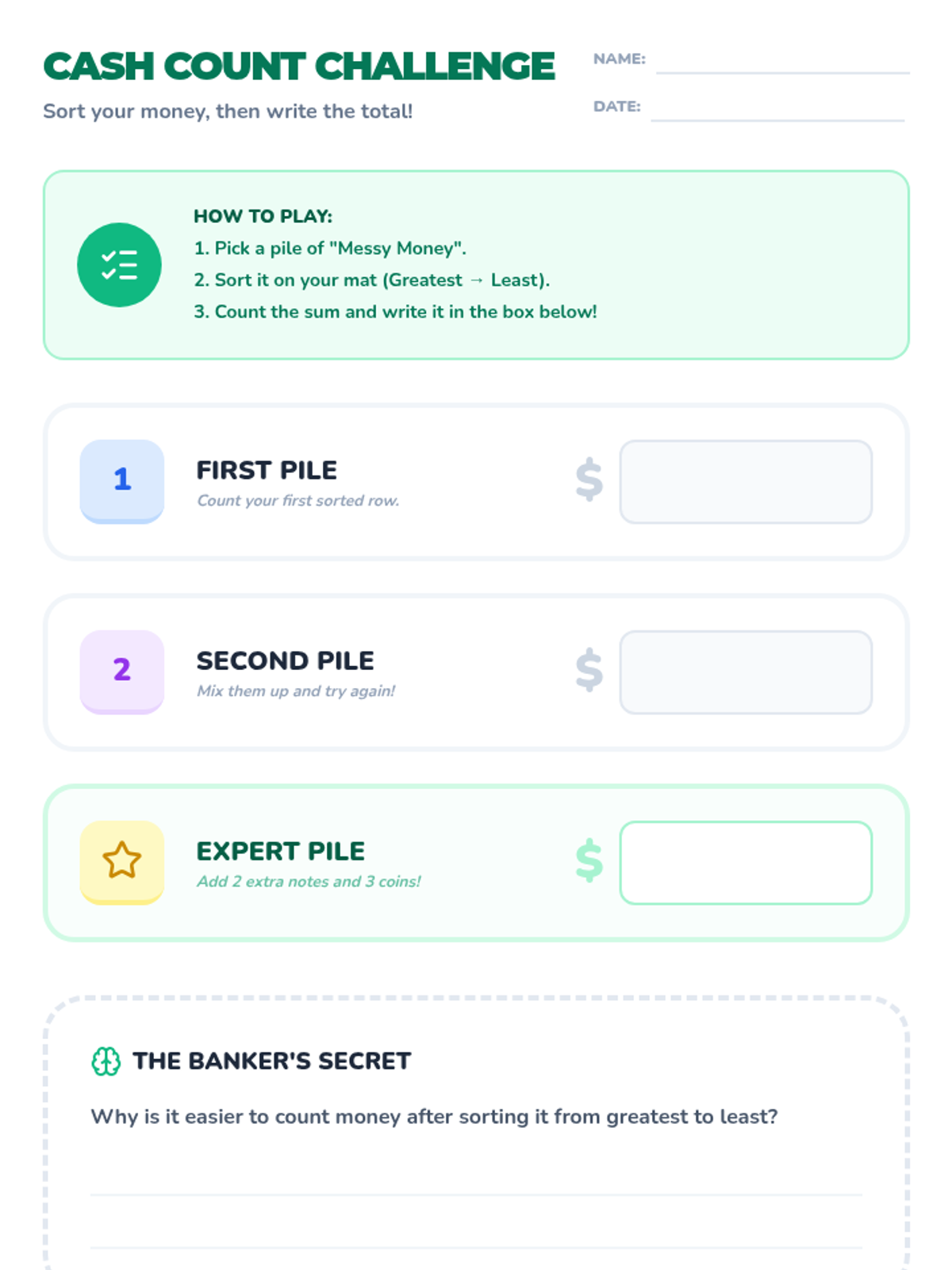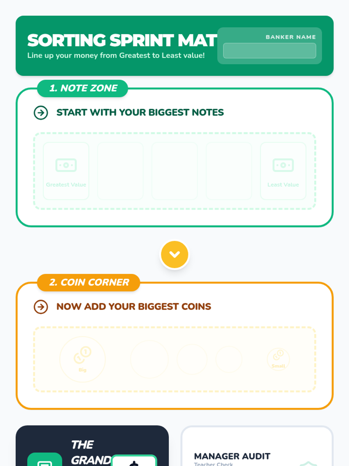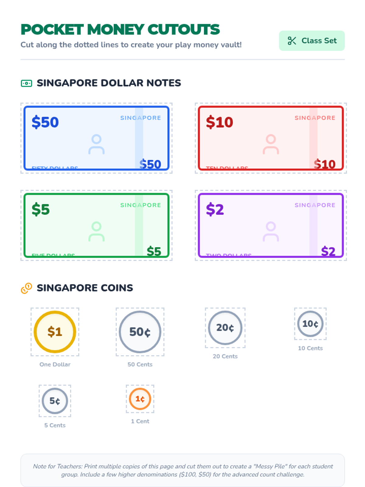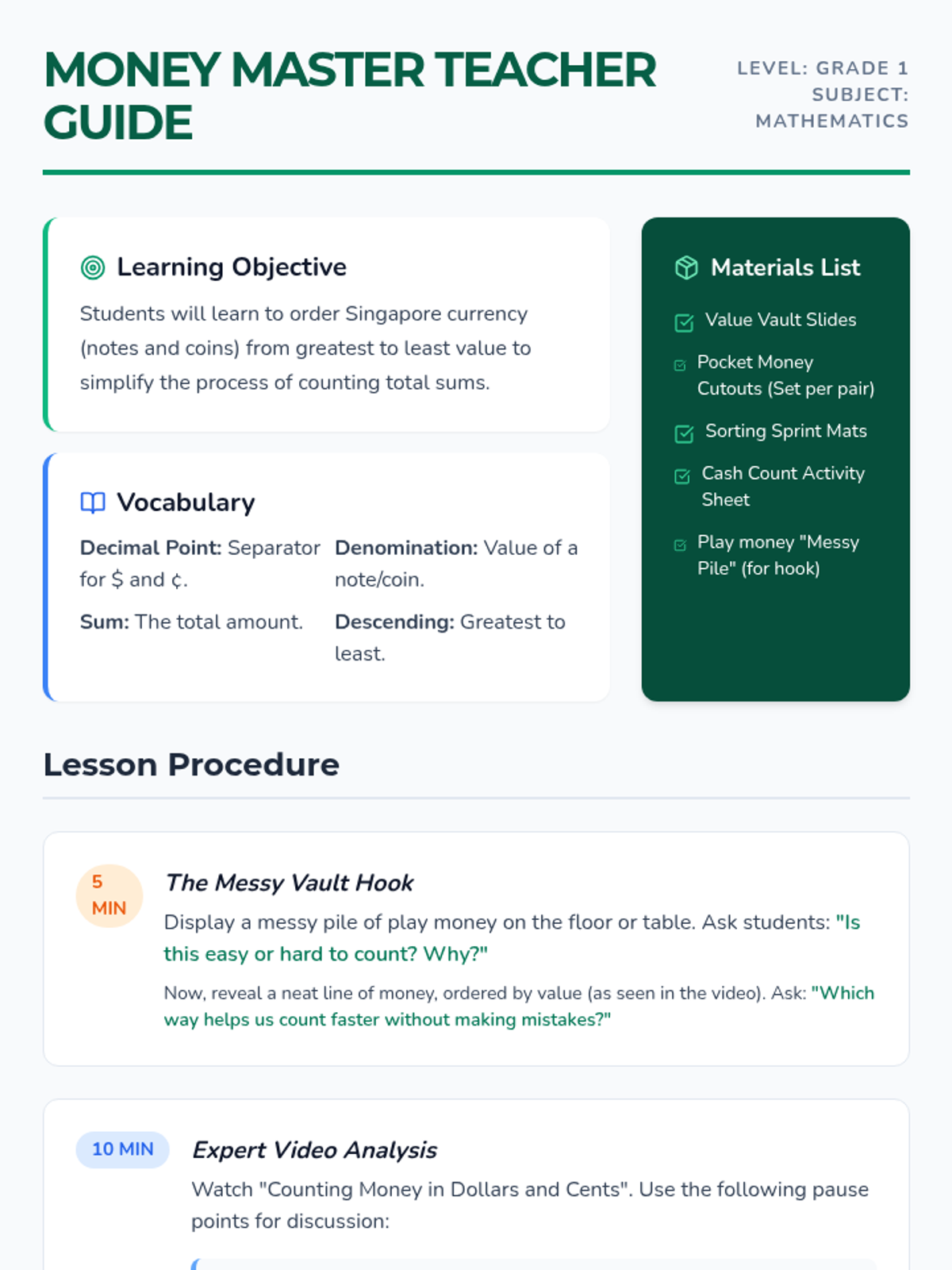 A 1st Grade lesson focused on ordering Singapore currency from greatest to least value to simplify counting money, featuring a guided video analysis and hands-on sorting activity.