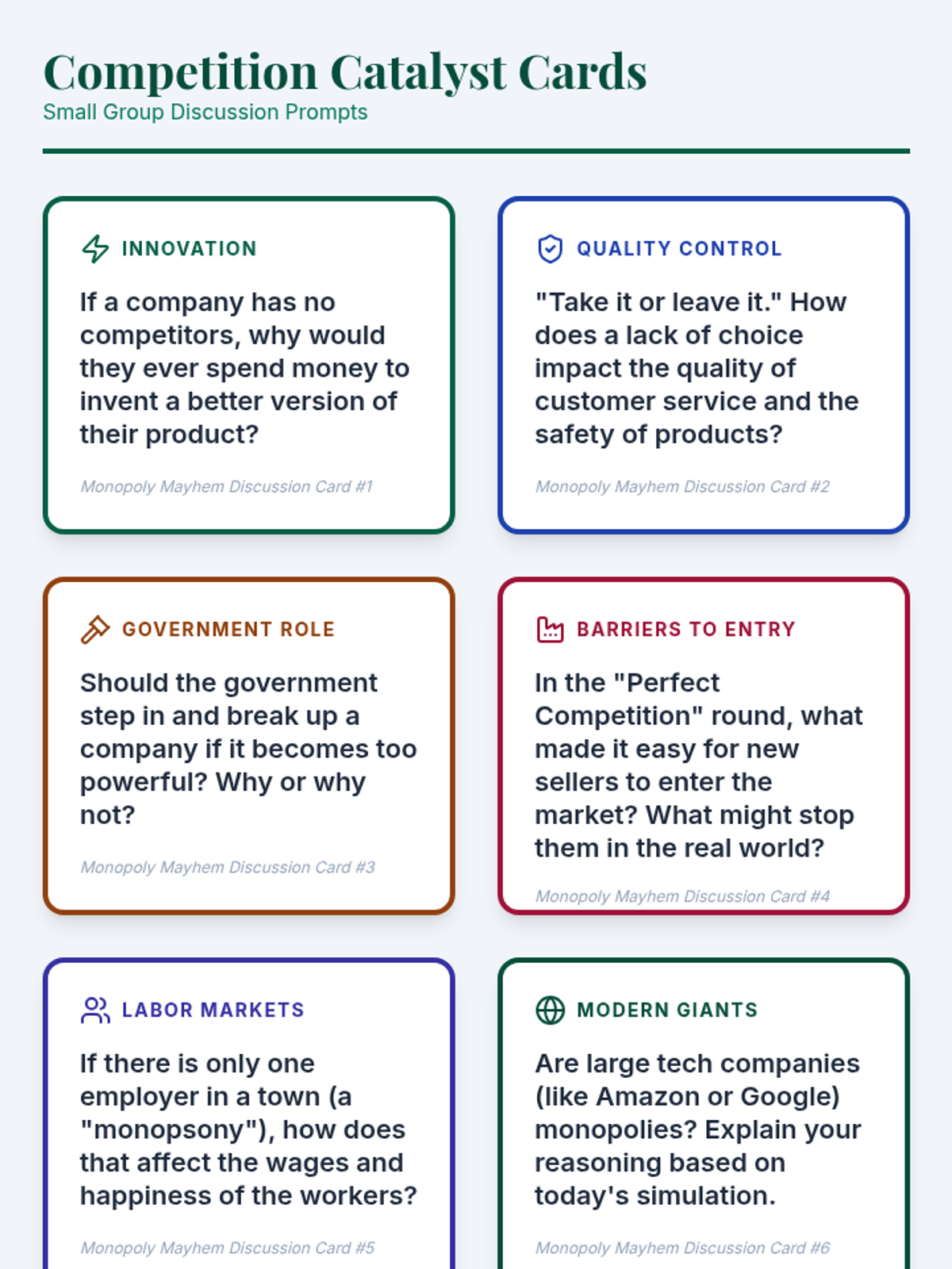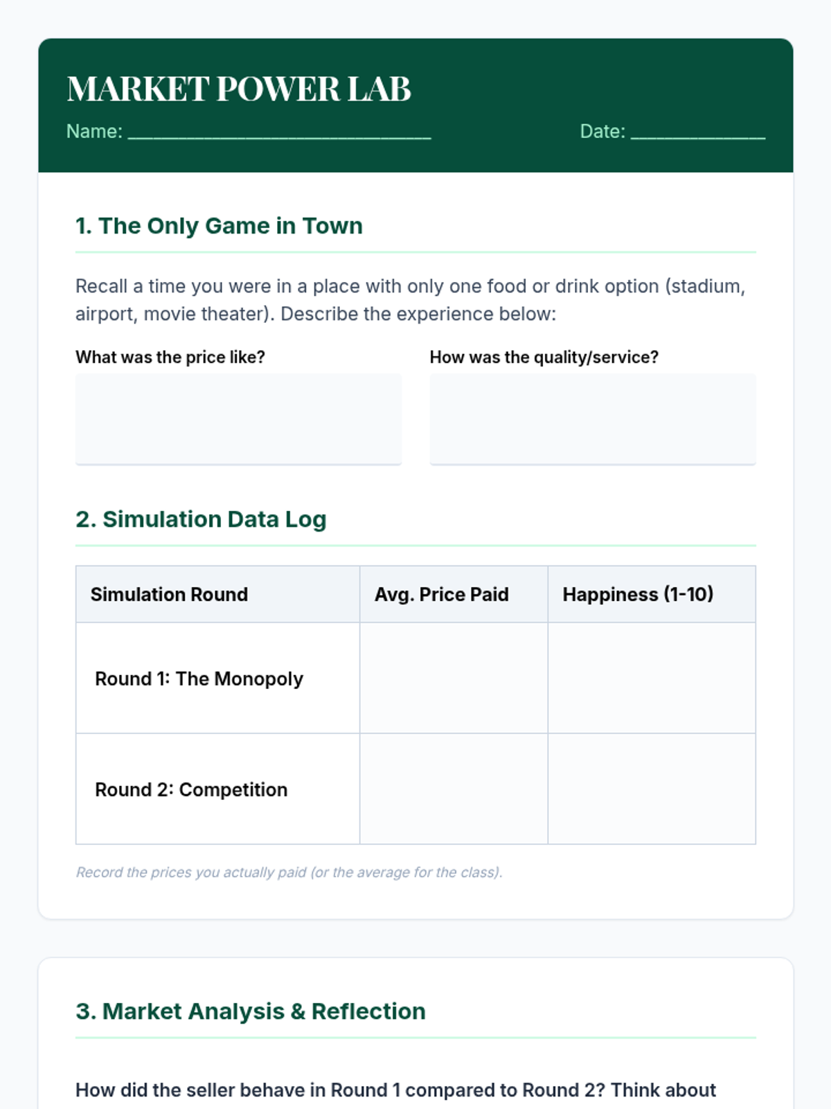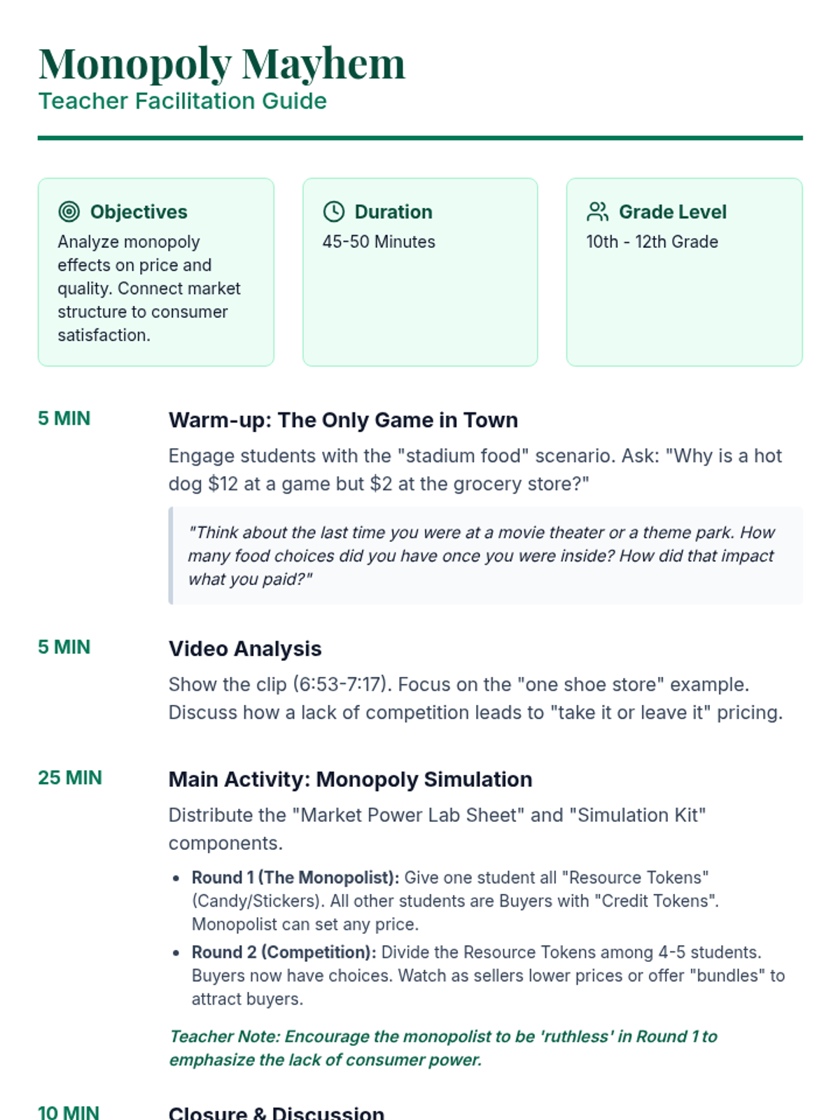 A high school economics lesson exploring how monopolies impact prices and consumer satisfaction through a hands-on simulation and video analysis.