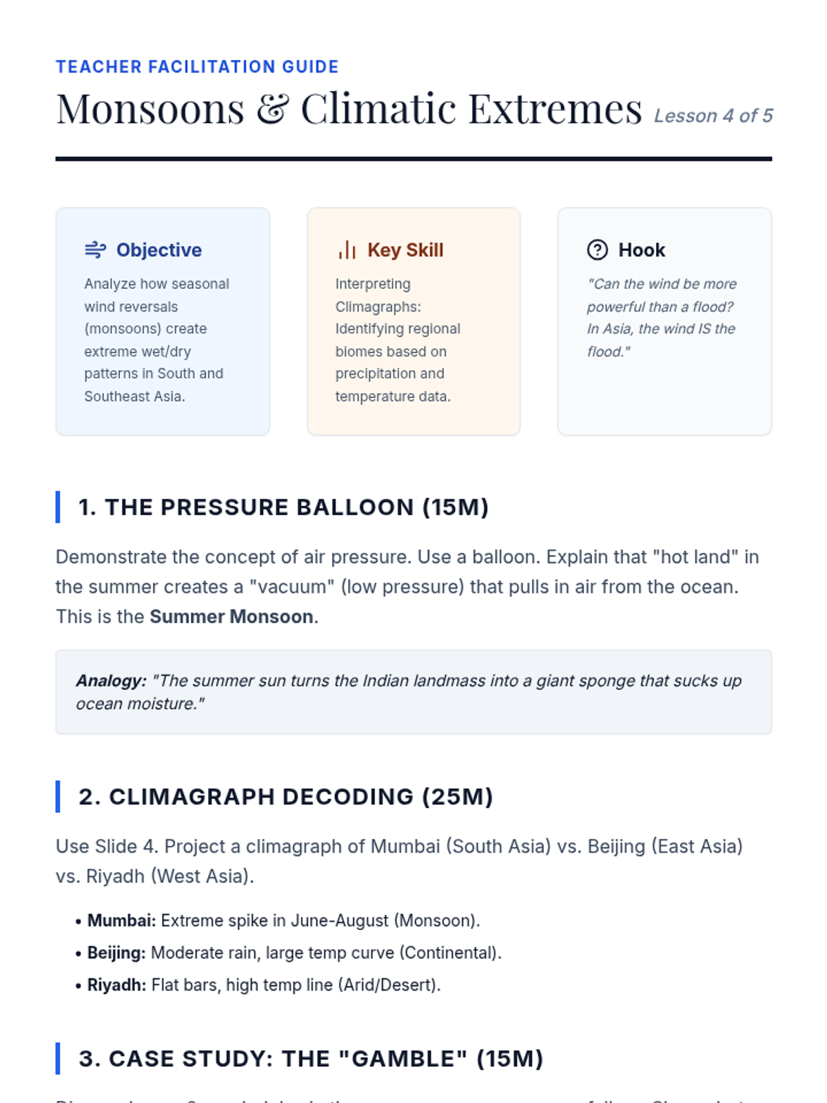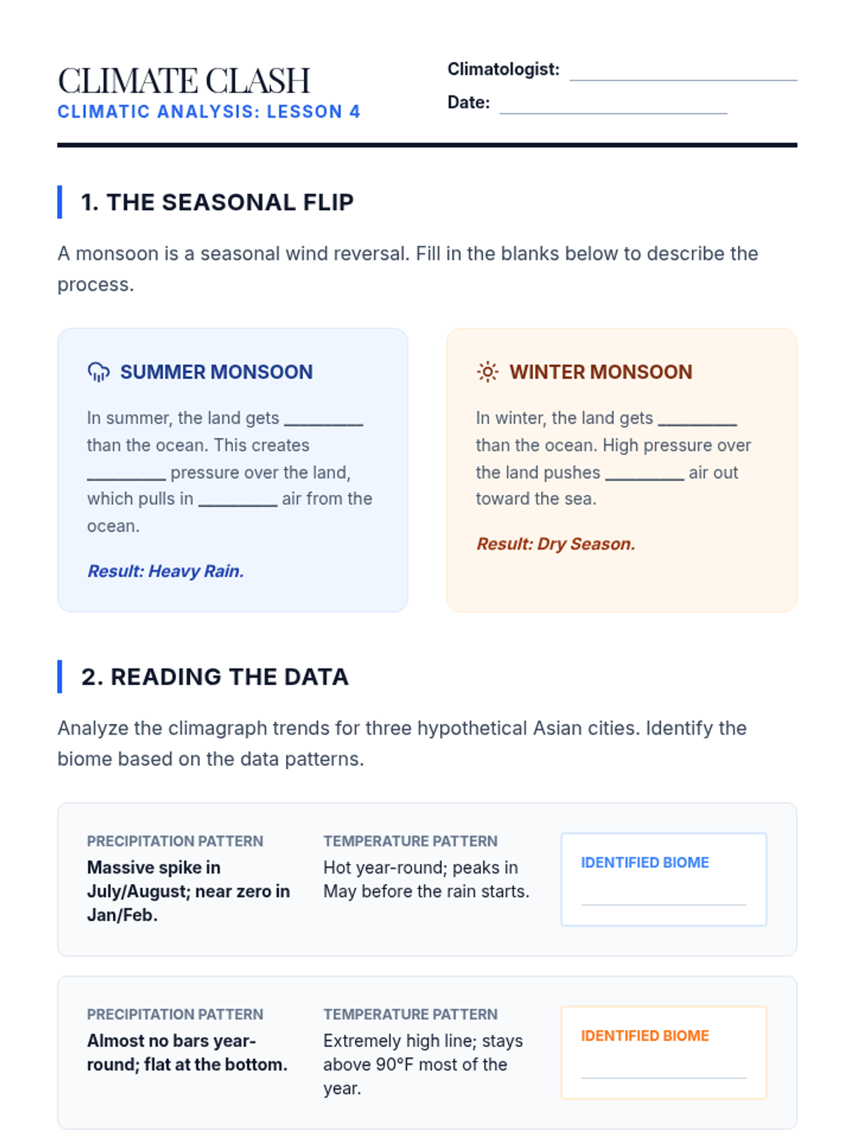 Analysis of monsoon winds and climatic extremes, comparing wet/dry seasons and arid deserts.