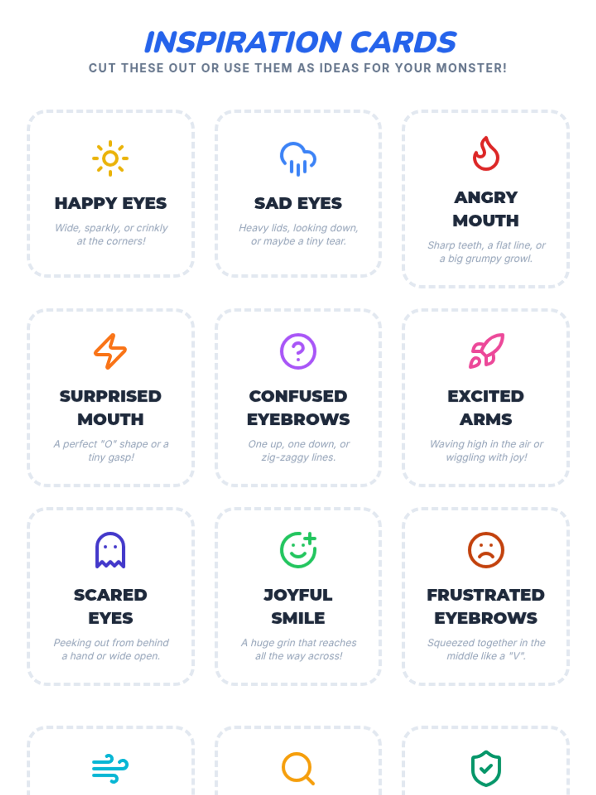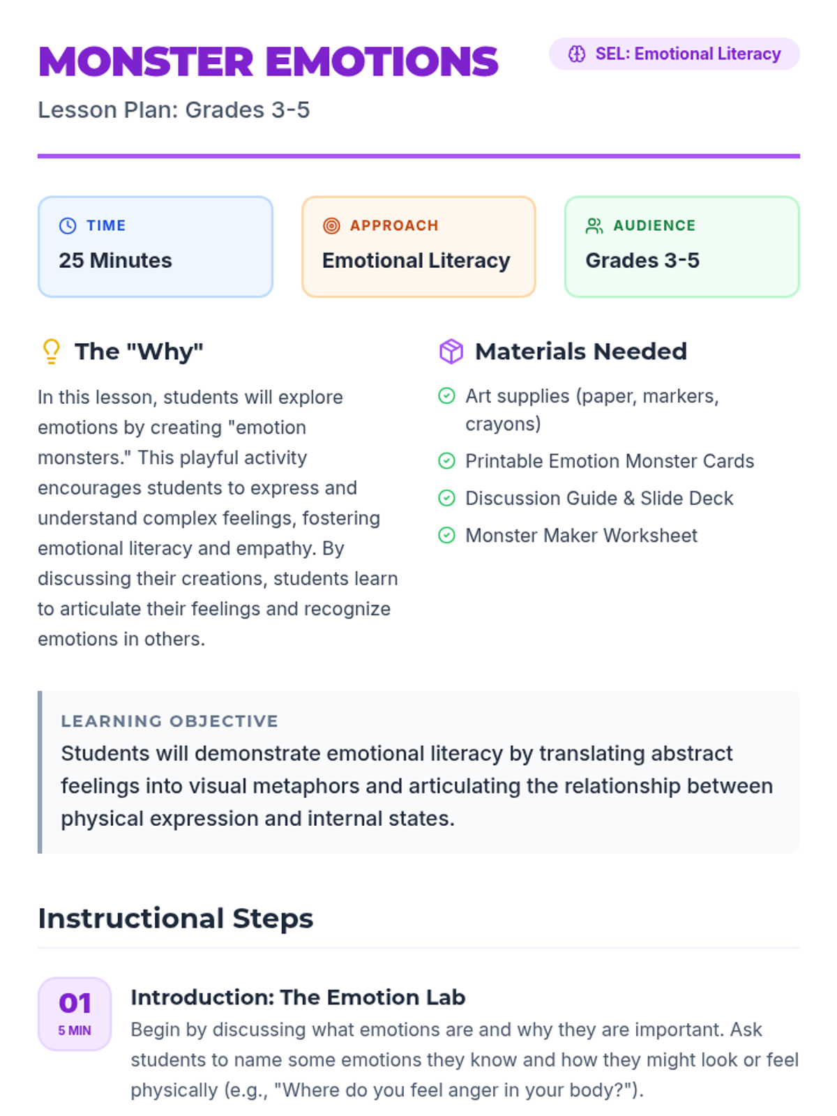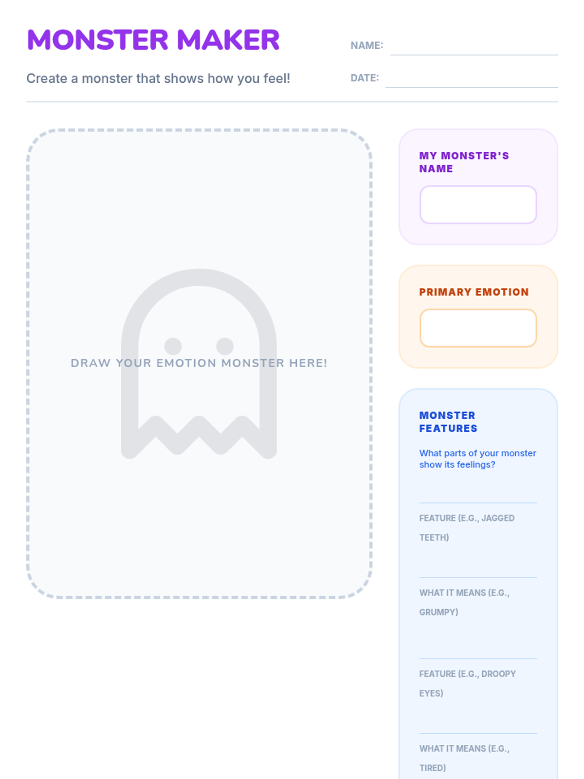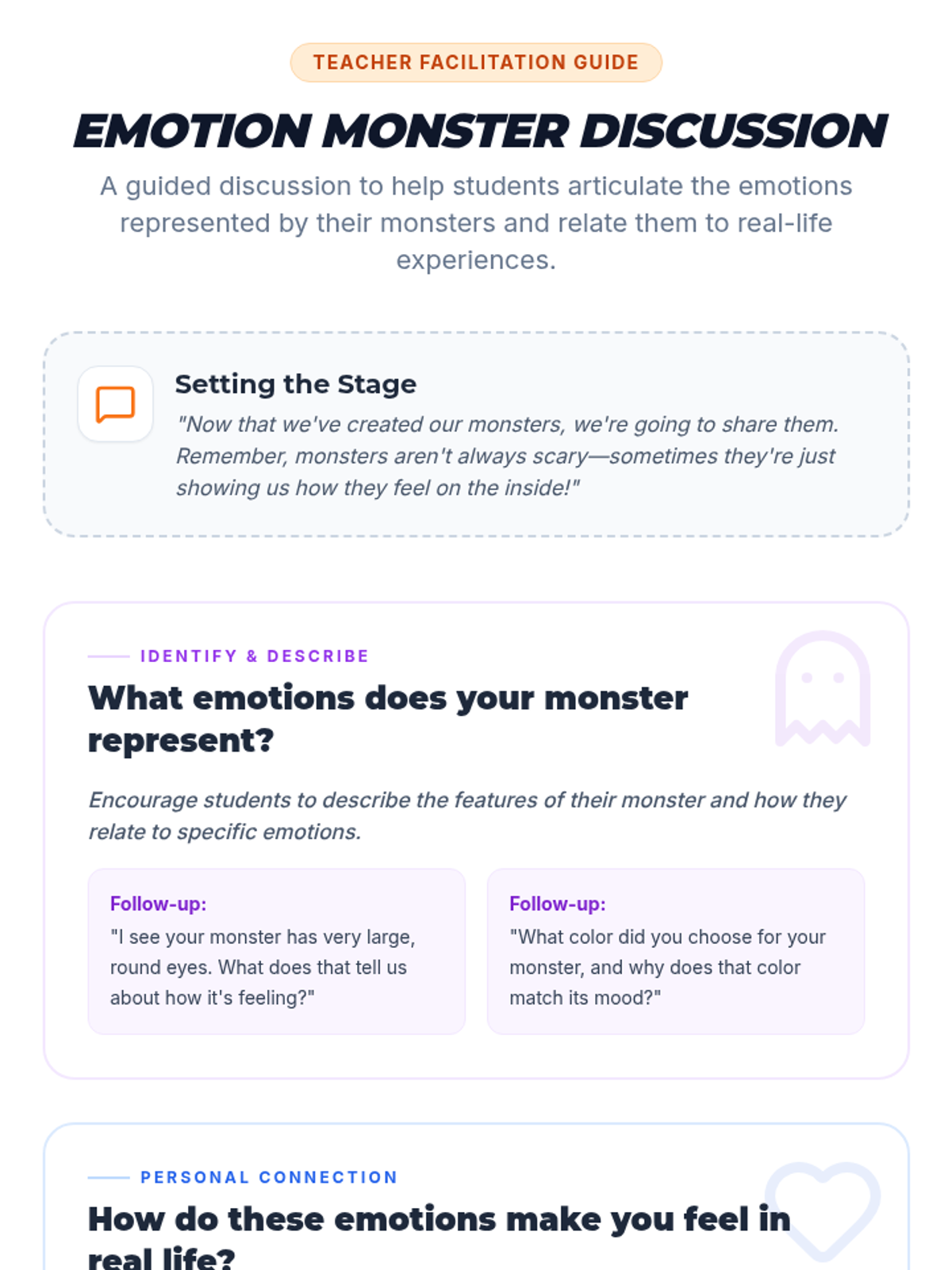 Students explore and articulate complex emotions by designing 'emotion monsters,' using physical features to represent feelings and fostering empathy through shared discussion.