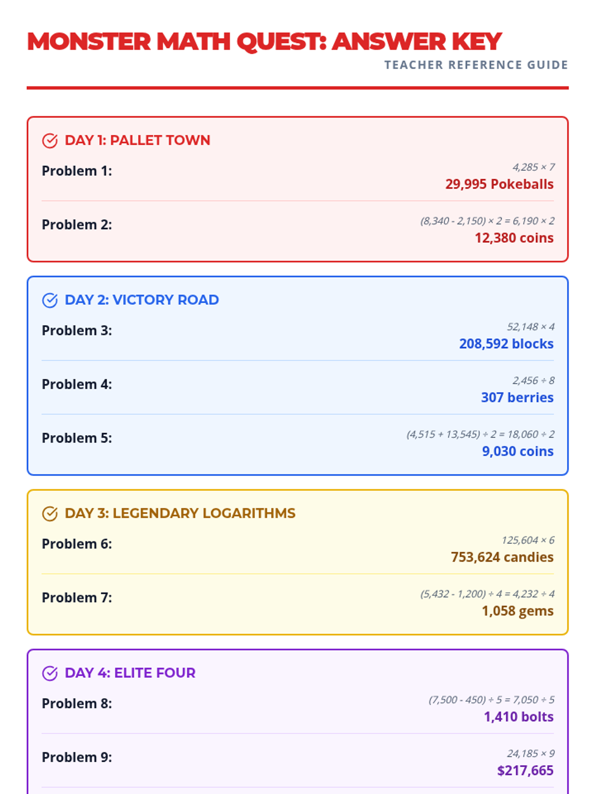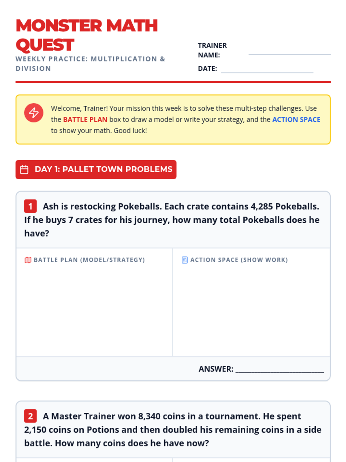 A week-long math practice set focused on multi-step multiplication and division word problems featuring a Pokemon and pop culture theme.