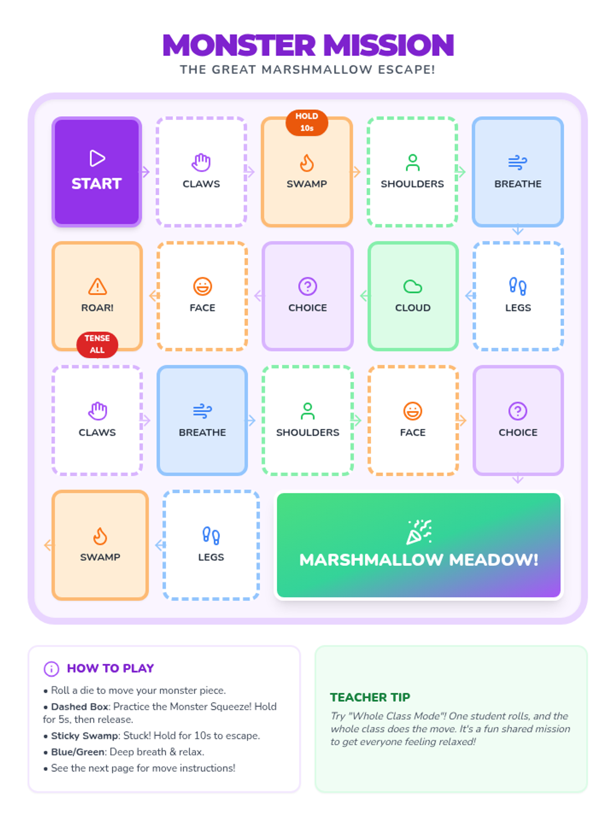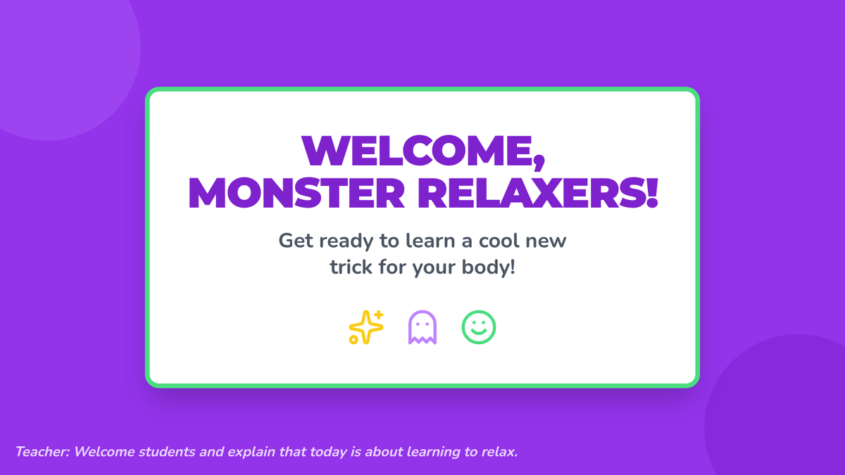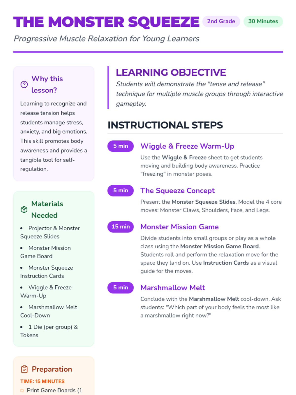 A 30-minute lesson for 2nd-grade students to learn progressive muscle relaxation using the 'tense and release' technique through a playful monster-themed game.